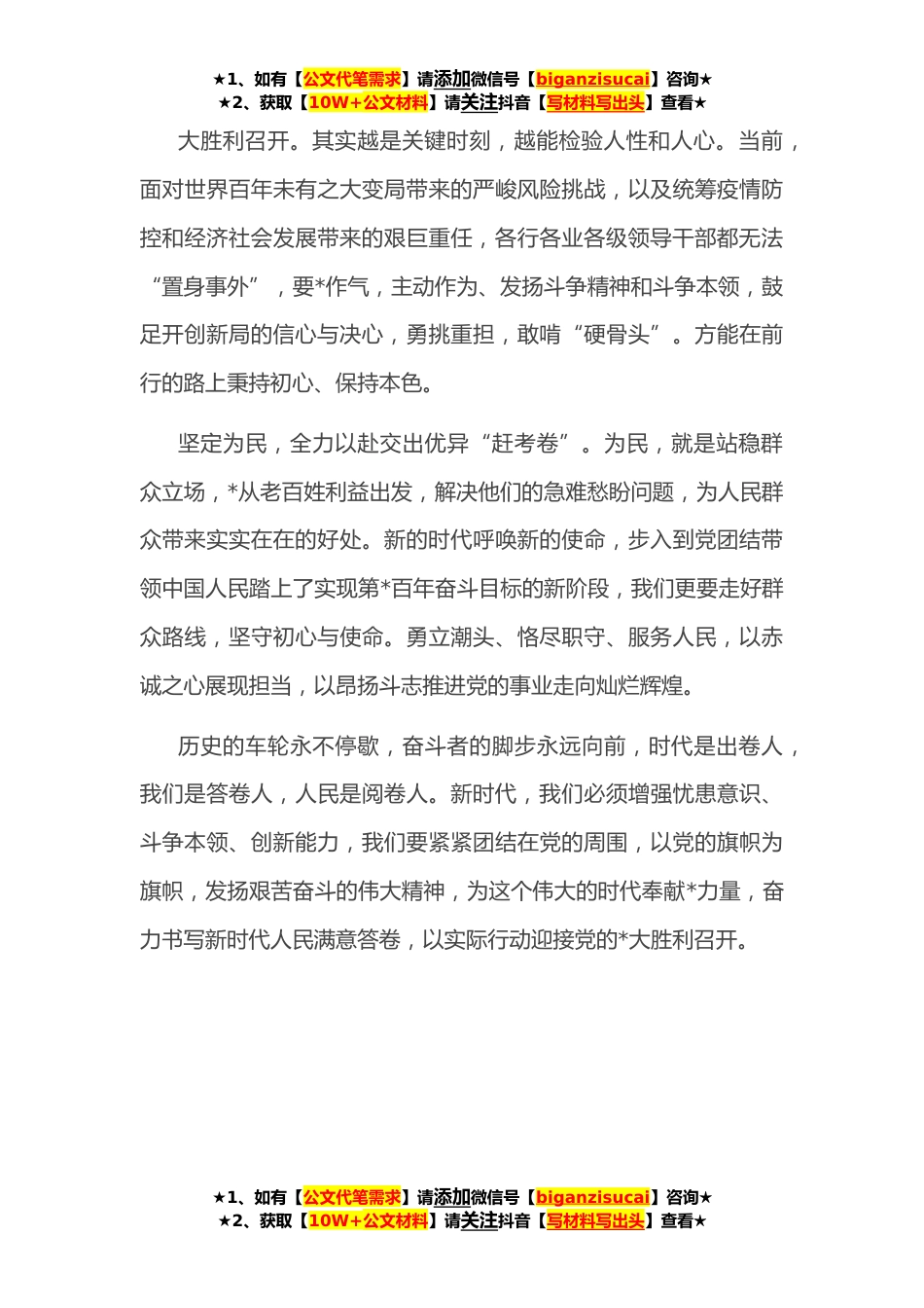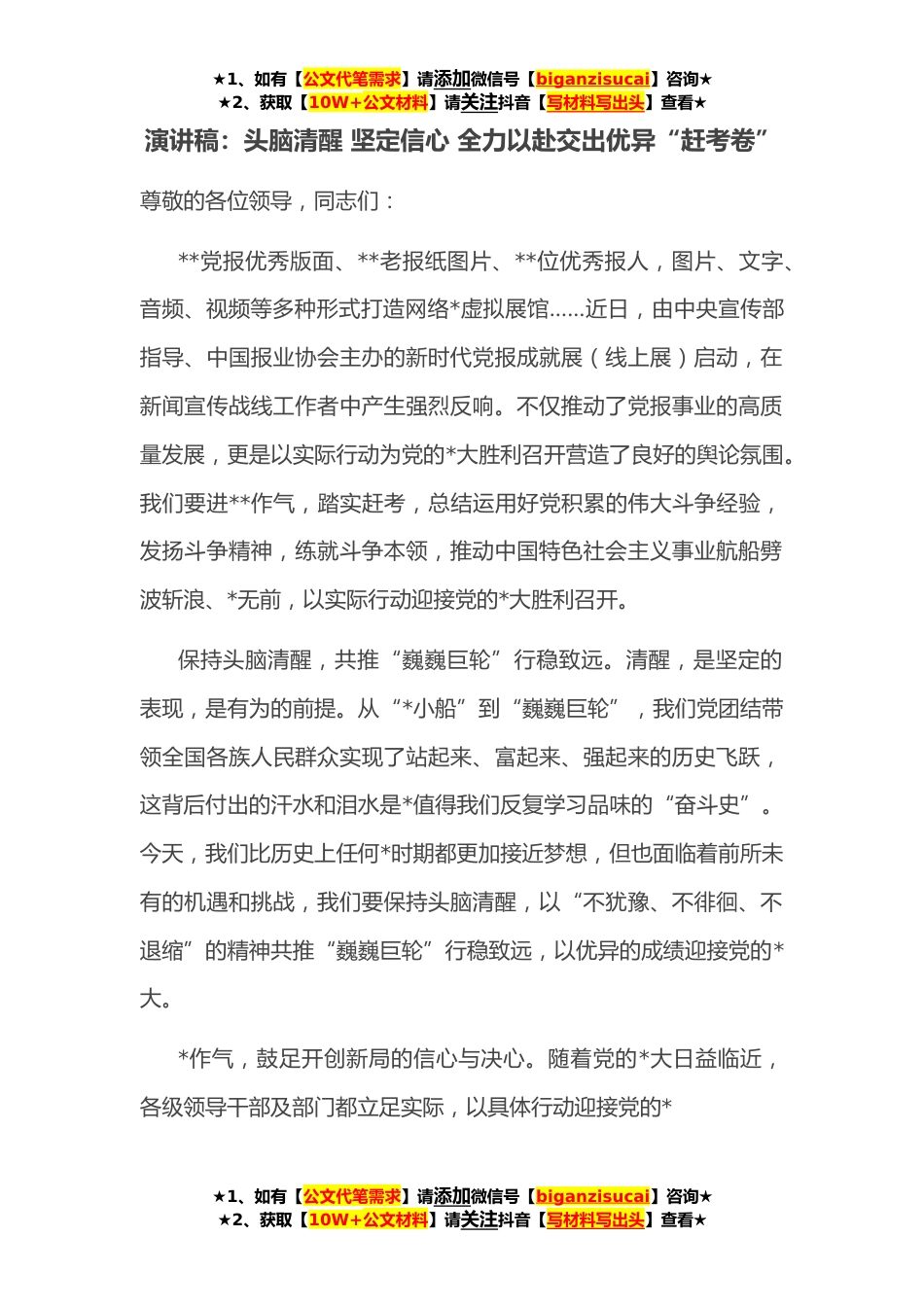 ★1、如有【公文代笔需求】请添加微信号【biganzisucai】咨询★★2、获取【10W+公文材料】请关注抖音【写材料写出头】查看★演讲稿:头脑清醒坚定信心全力以赴交出优异“赶考卷”尊敬的各位领导,同志们:**党报优秀版面、**老报纸图片、**位优秀报人,图片、文字、音频、视频等多种形式打造网络*虚拟展馆……近日,由中央宣传部指导、中国报业协会主办的新时代党报成就展(线上展)启动,在新闻宣传战线工作者中产生强烈反响。不仅推动了党报事业的高质量发展,更是以实际行动为党的*大胜利召开营造了良好的舆论氛围。我们要进**作气,踏实赶考,总结运用好党积累的伟大斗争经验,发扬斗争精神,练就斗争本领,推动中国特色社会主义事业航船劈波斩浪、*无前,以实际行动迎接党的*大胜利召开。保持头脑清醒,共推...