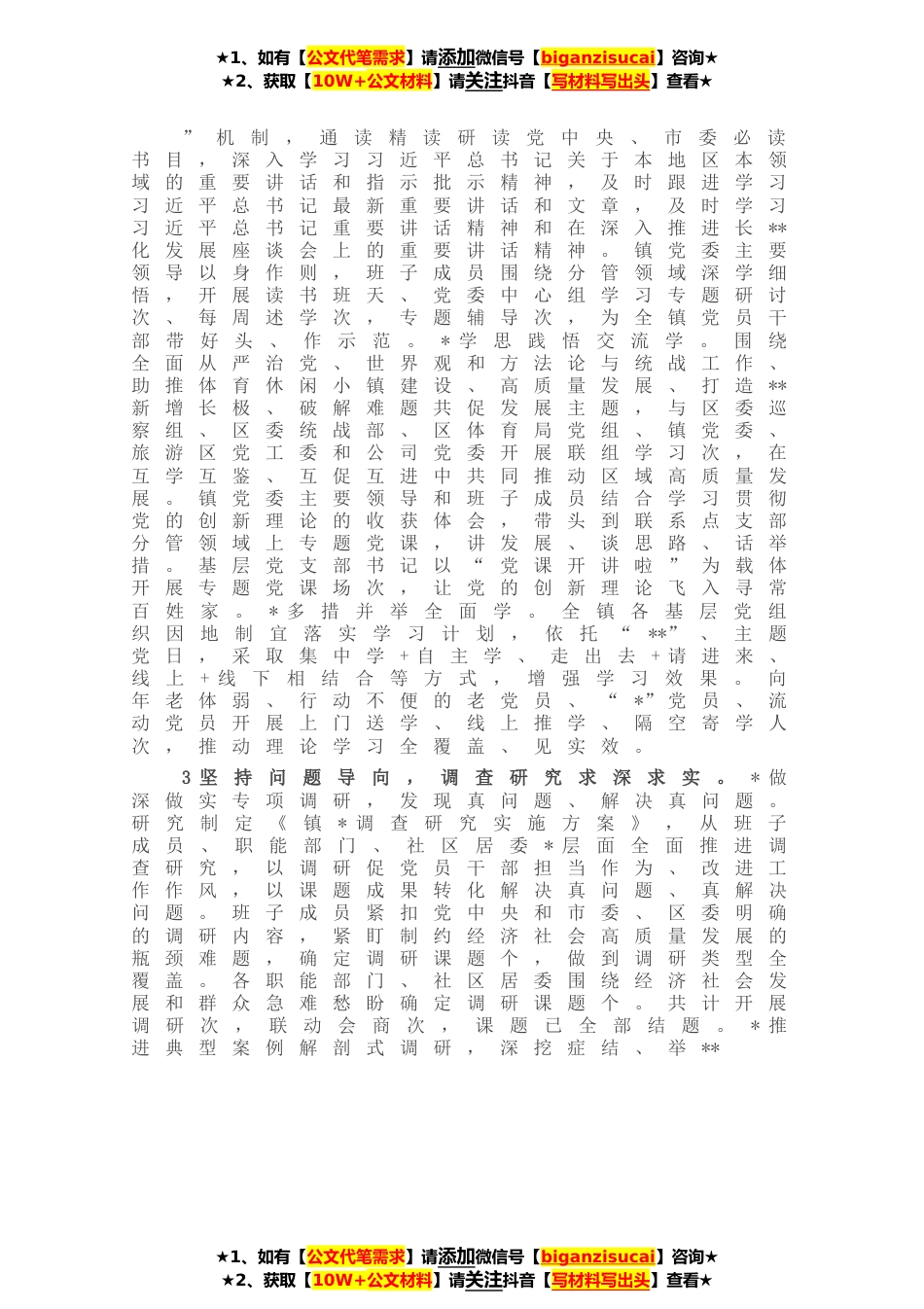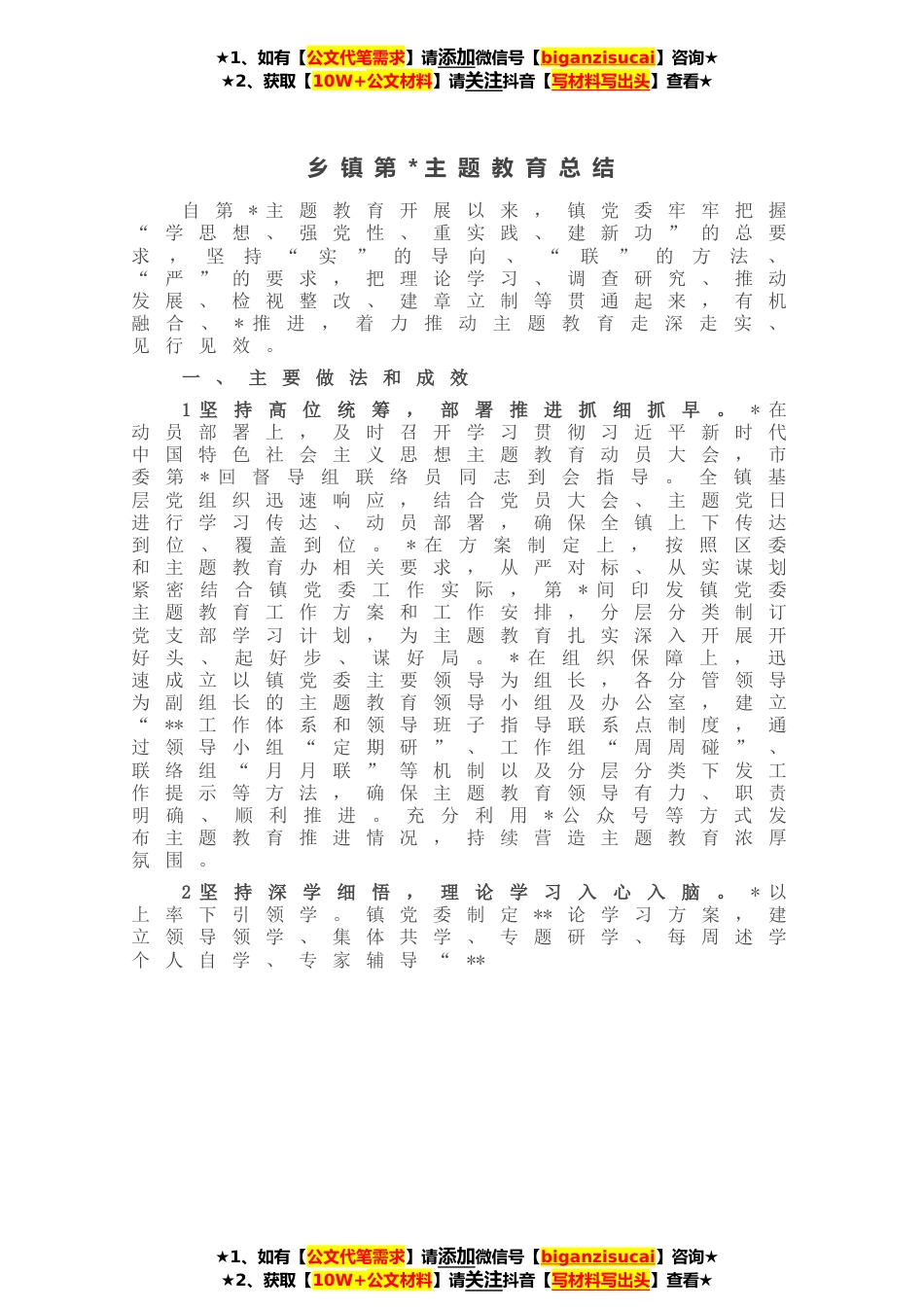 ★1、如有【公文代笔需求】请添加微信号【biganzisucai】咨询★★2、获取【10W+公文材料】请关注抖音【写材料写出头】查看★乡镇第*主题教育总结自第*主题教育开展以来,镇党委牢牢把握“学思想、强党性、重实践、建新功”的总要求,坚持“实”的导向、“联”的方法、“严”的要求,把理论学习、调查研究、推动发展、检视整改、建章立制等贯通起来,有机融合、*推进,着力推动主题教育走深走实、见行见效。一、主要做法和成效1坚持高位统筹,部署推进抓细抓早。*在动员部署上,及时召开学习贯彻习近平新时代中国特色社会主义思想主题教育动员大会,市委第*回督导组联络员同志到会指导。全镇基层党组织迅速响应,结合党员大会、主题党日进行学习传达、动员部署,确保全镇上下传达到位、覆盖到位。*在方案制定上,按...