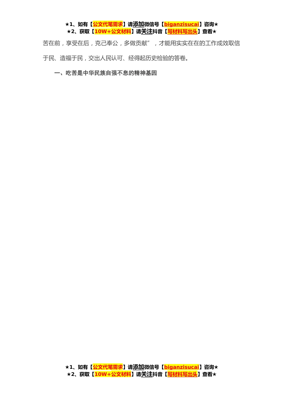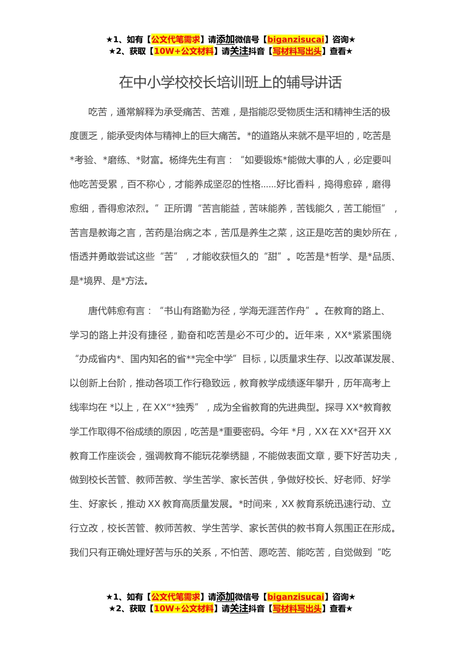 ★1、如有【公文代笔需求】请添加微信号【biganzisucai】咨询★★2、获取【10W+公文材料】请关注抖音【写材料写出头】查看★在中小学校校长培训班上的辅导讲话吃苦,通常解释为承受痛苦、苦难,是指能忍受物质生活和精神生活的极度匮乏,能承受肉体与精神上的巨大痛苦。*的道路从来就不是平坦的,吃苦是*考验、*磨练、*财富。杨绛先生有言:“如要锻炼*能做大事的人,必定要叫他吃苦受累,百不称心,才能养成坚忍的性格……好比香料,捣得愈碎,磨得愈细,香得愈浓烈。”正所谓“苦言能益,苦味能养,苦钱能久,苦工能恒”,苦言是教诲之言,苦药是治病之本,苦瓜是养生之菜,这正是吃苦的奥妙所在,悟透并勇敢尝试这些“苦”,才能收获恒久的“甜”。吃苦是*哲学、是*品质、是*境界、是*方法。唐代韩愈有言:“书...