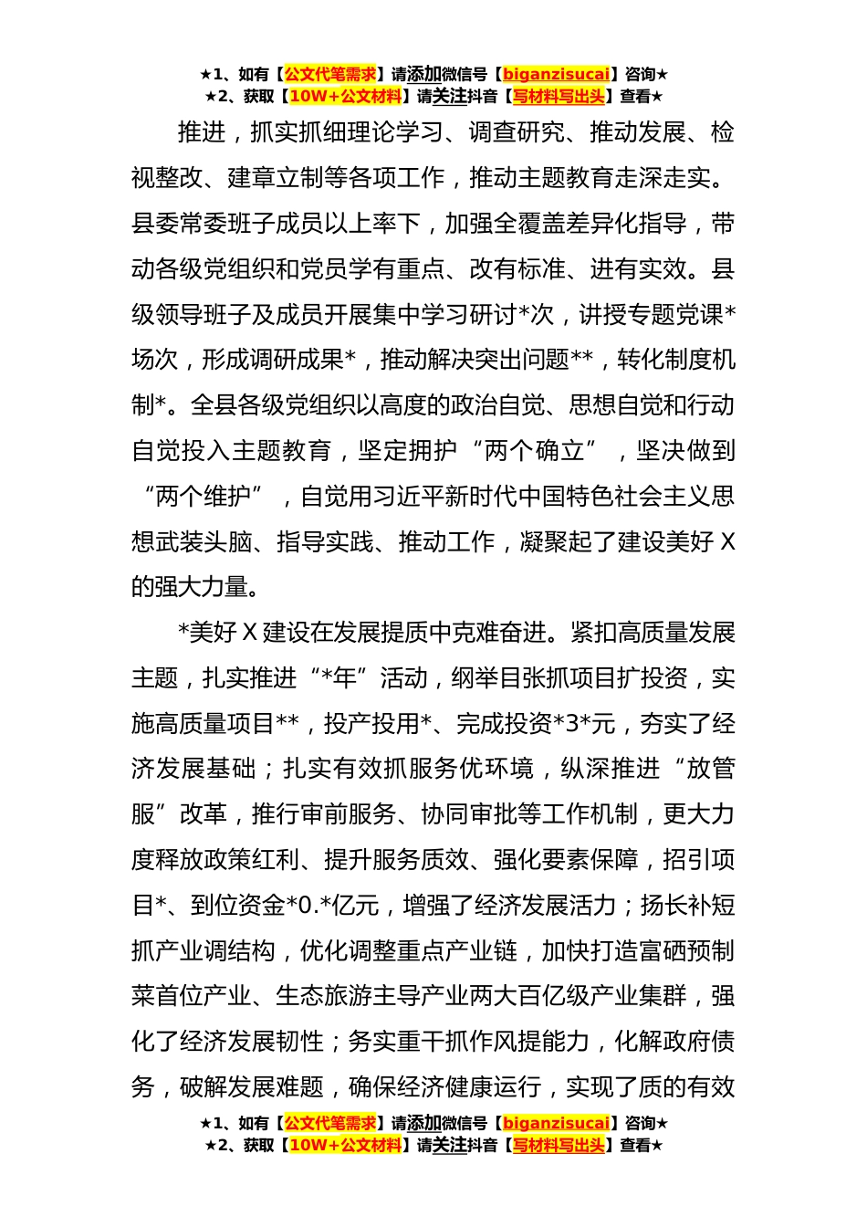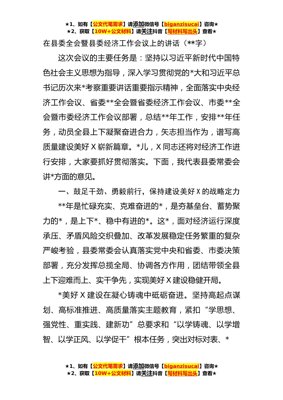 ★1、如有【公文代笔需求】请添加微信号【biganzisucai】咨询★★2、获取【10W+公文材料】请关注抖音【写材料写出头】查看★在县委全会暨县委经济工作会议上的讲话(**字)这次会议的主要任务是:坚持以习近平新时代中国特色社会主义思想为指导,深入学习贯彻党的*大和习近平总书记历次来*考察重要讲话重要指示精神,全面落实中央经济工作会议、省委**全会暨省委经济工作会议、市委**全会暨市委经济工作会议部署,总结**年工作,安排**年任务,动员全县上下凝聚奋进合力,矢志担当作为,谱写高质量建设美好X崭新篇章。*儿,X同志还将对经济工作进行安排,大家要抓好贯彻落实。下面,我代表县委常委会讲*方面的意见。一、鼓足干劲、勇毅前行,保持建设美好X的战略定力**年是忙碌充实、克难奋进的*,是夯基垒台、蓄...