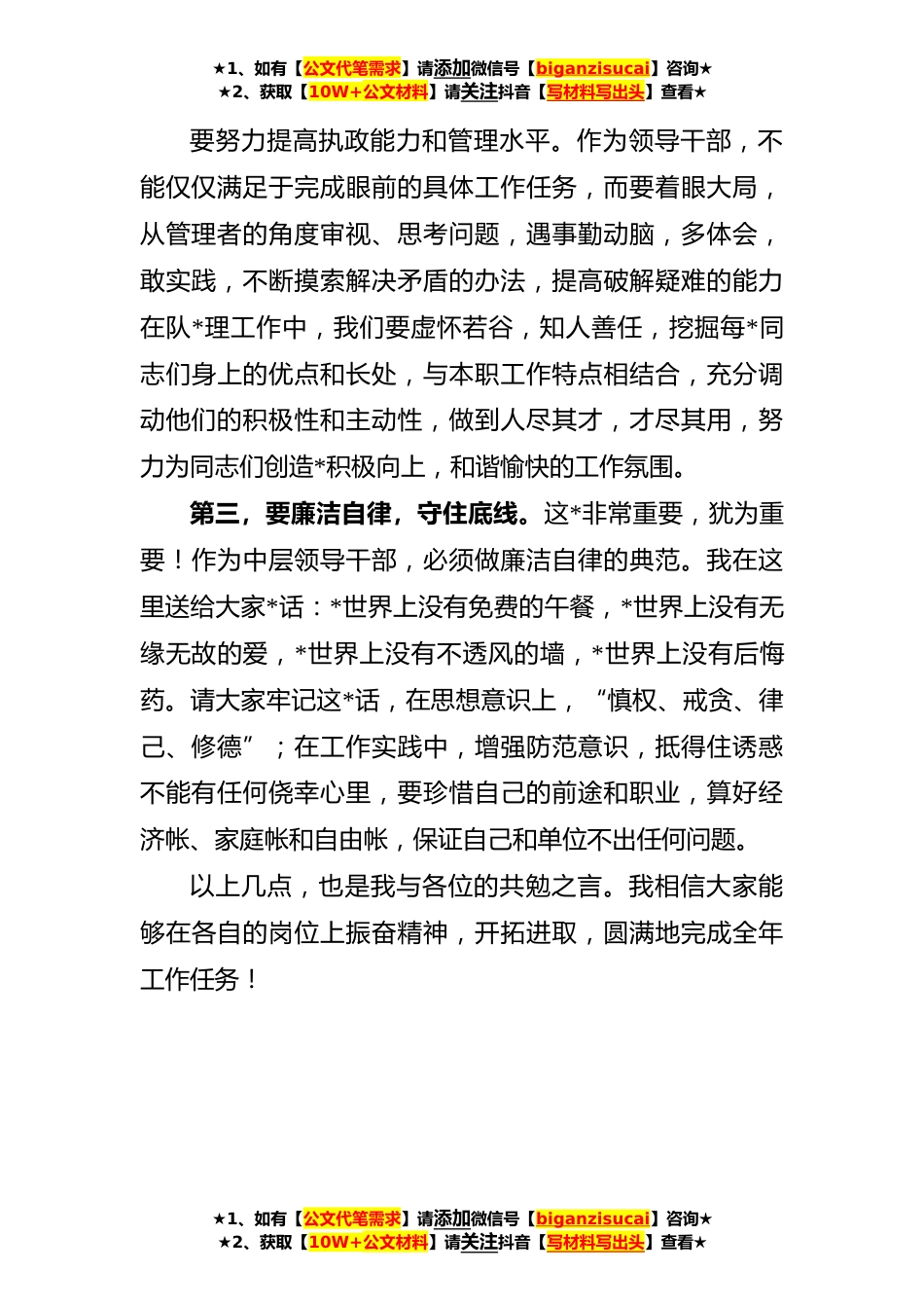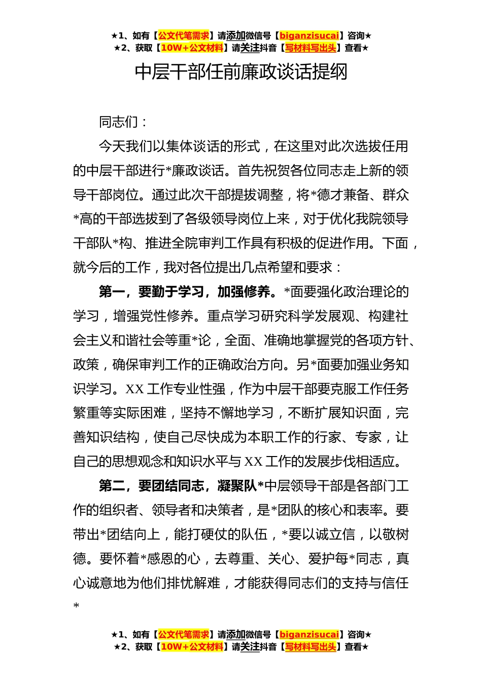 ★1、如有【公文代笔需求】请添加微信号【biganzisucai】咨询★★2、获取【10W+公文材料】请关注抖音【写材料写出头】查看★中层干部任前廉政谈话提纲同志们:今天我们以集体谈话的形式,在这里对此次选拔任用的中层干部进行*廉政谈话。首先祝贺各位同志走上新的领导干部岗位。通过此次干部提拔调整,将*德才兼备、群众*高的干部选拔到了各级领导岗位上来,对于优化我院领导干部队*构、推进全院审判工作具有积极的促进作用。下面,就今后的工作,我对各位提出几点希望和要求:第一,要勤于学习,加强修养。*面要强化政治理论的学习,增强党性修养。重点学习研究科学发展观、构建社会主义和谐社会等重*论,全面、准确地掌握党的各项方针、政策,确保审判工作的正确政治方向。另*面要加强业务知识学习。XX工作专业性...