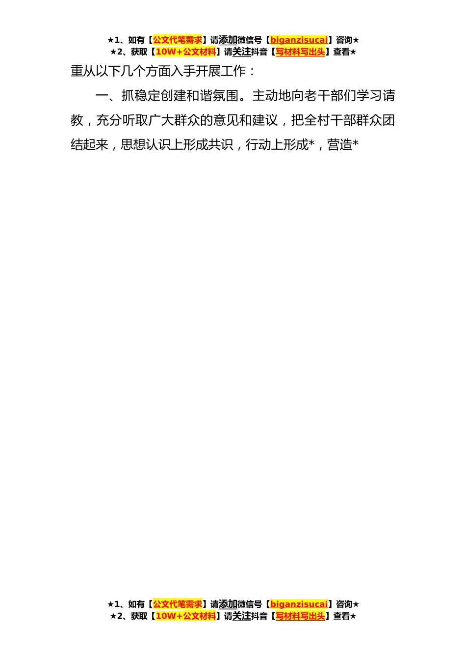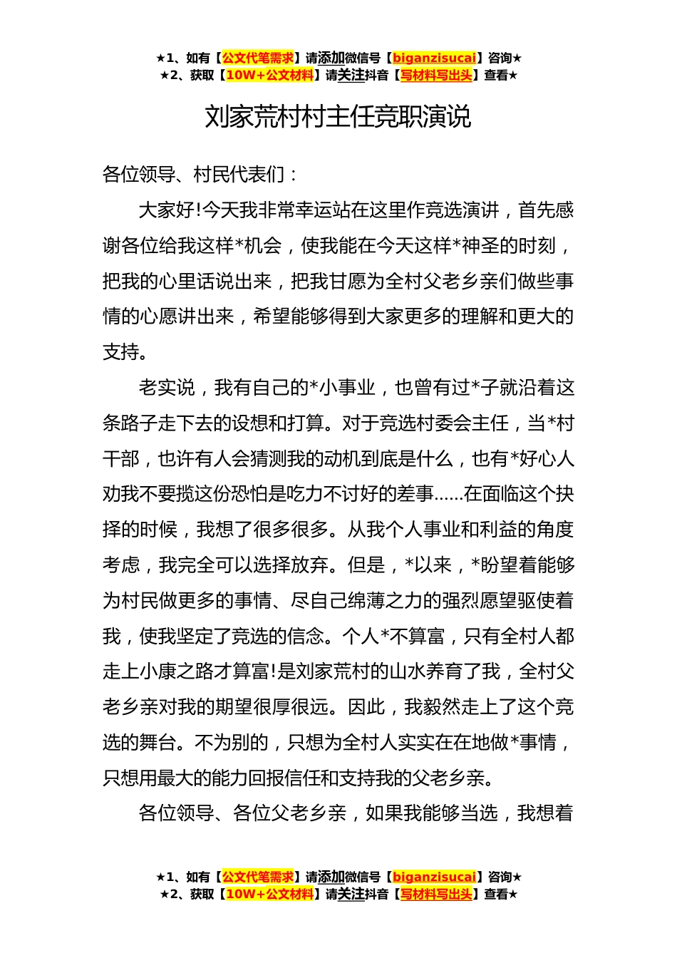 ★1、如有【公文代笔需求】请添加微信号【biganzisucai】咨询★★2、获取【10W+公文材料】请关注抖音【写材料写出头】查看★刘家荒村村主任竞职演说各位领导、村民代表们:大家好!今天我非常幸运站在这里作竞选演讲,首先感谢各位给我这样*机会,使我能在今天这样*神圣的时刻,把我的心里话说出来,把我甘愿为全村父老乡亲们做些事情的心愿讲出来,希望能够得到大家更多的理解和更大的支持。老实说,我有自己的*小事业,也曾有过*子就沿着这条路子走下去的设想和打算。对于竞选村委会主任,当*村干部,也许有人会猜测我的动机到底是什么,也有*好心人劝我不要揽这份恐怕是吃力不讨好的差事……在面临这个抉择的时候,我想了很多很多。从我个人事业和利益的角度考虑,我完全可以选择放弃。但是,*以来,*盼望着能够...