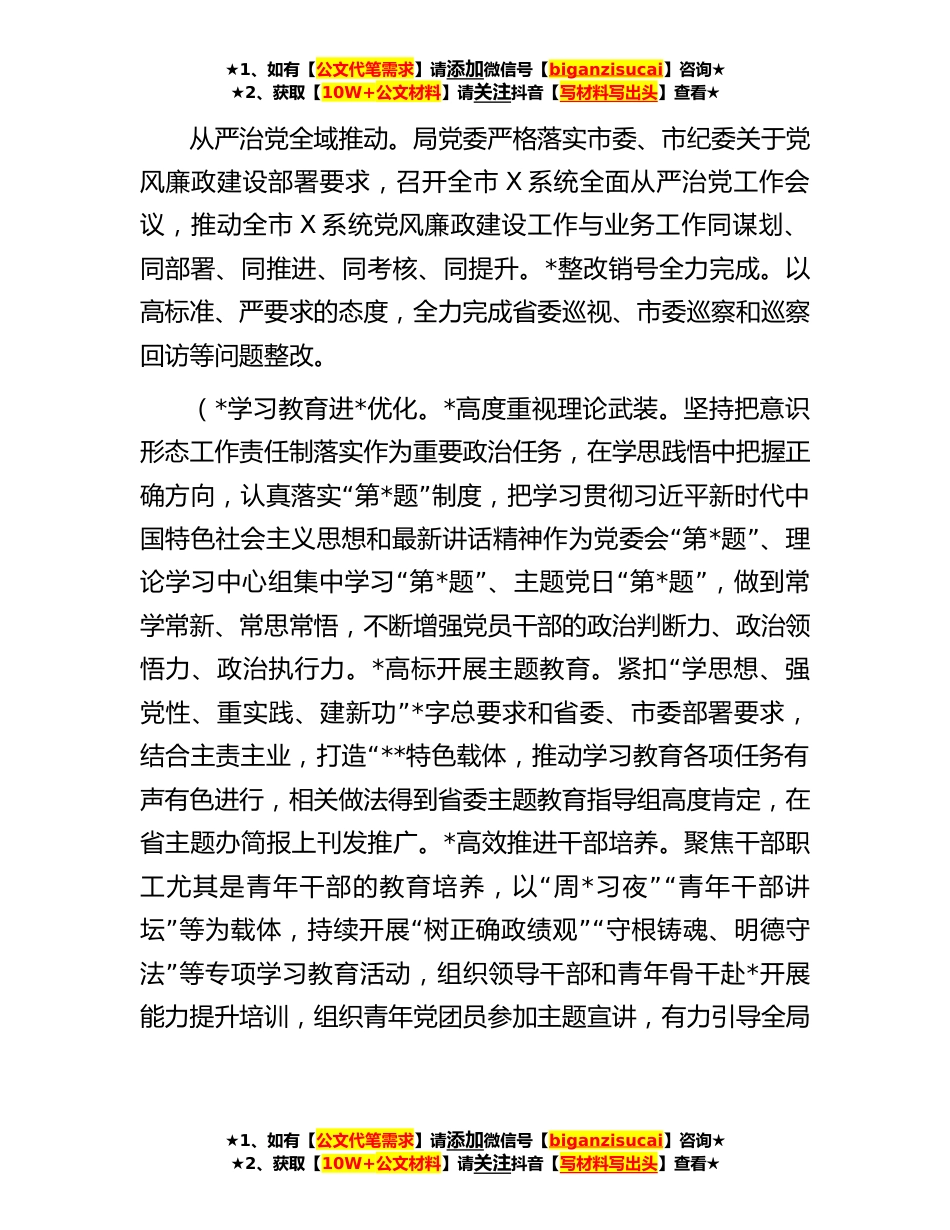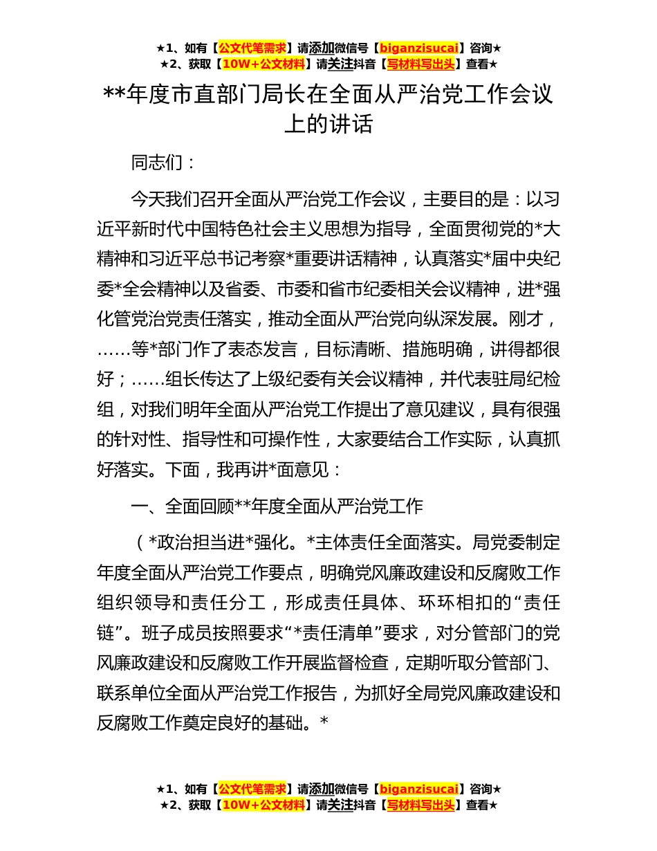 ★1、如有【公文代笔需求】请添加微信号【biganzisucai】咨询★★2、获取【10W+公文材料】请关注抖音【写材料写出头】查看★**年度市直部门局长在全面从严治党工作会议上的讲话同志们:今天我们召开全面从严治党工作会议,主要目的是:以习近平新时代中国特色社会主义思想为指导,全面贯彻党的*大精神和习近平总书记考察*重要讲话精神,认真落实*届中央纪委*全会精神以及省委、市委和省市纪委相关会议精神,进*强化管党治党责任落实,推动全面从严治党向纵深发展。刚才,……等*部门作了表态发言,目标清晰、措施明确,讲得都很好;……组长传达了上级纪委有关会议精神,并代表驻局纪检组,对我们明年全面从严治党工作提出了意见建议,具有很强的针对性、指导性和可操作性,大家要结合工作实际,认真抓好落实。下...