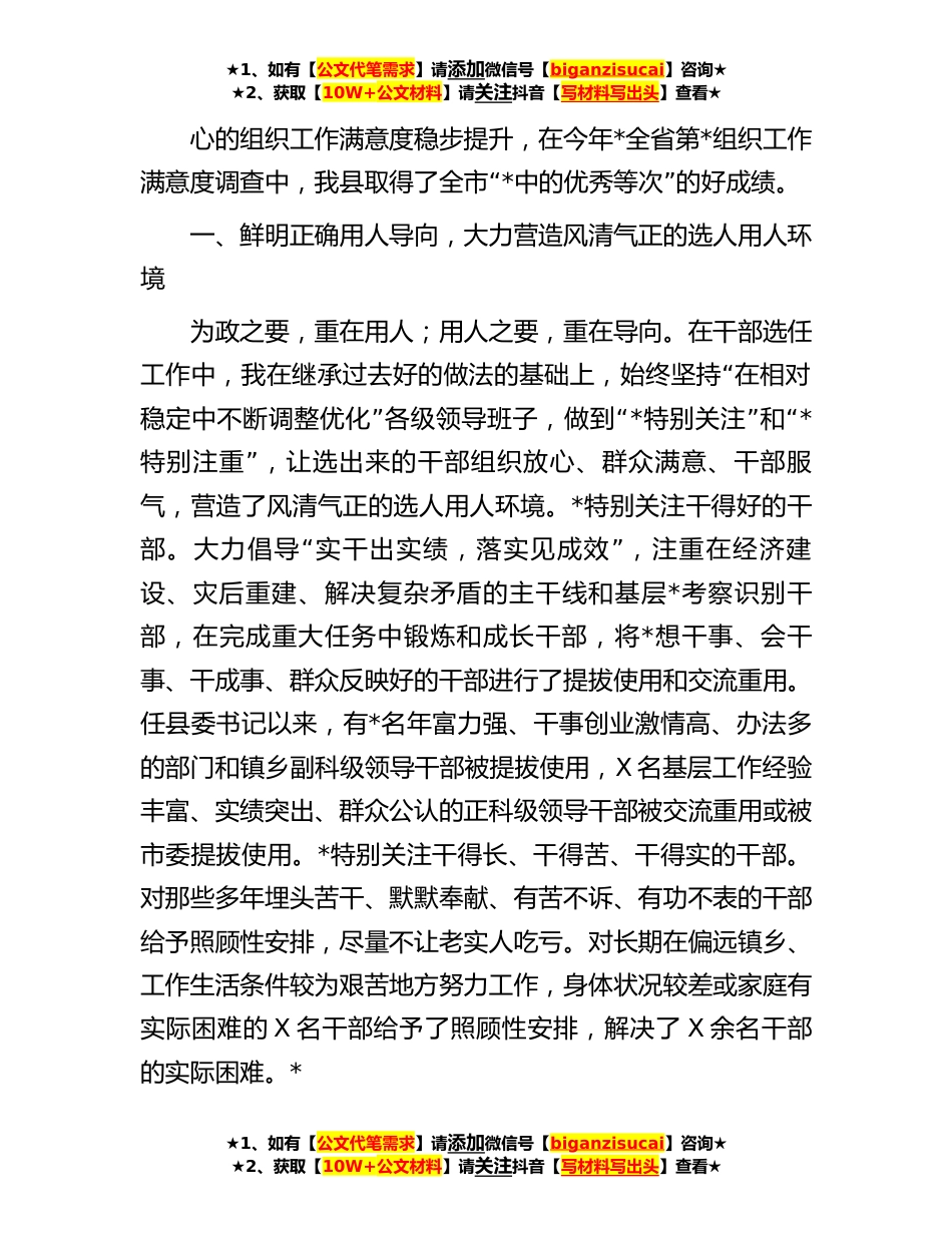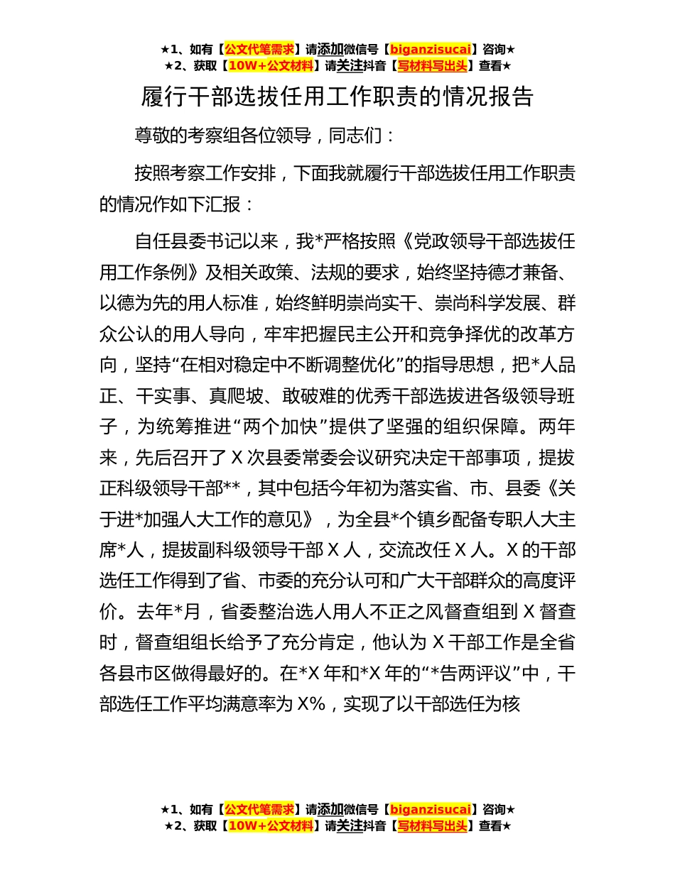 ★1、如有【公文代笔需求】请添加微信号【biganzisucai】咨询★★2、获取【10W+公文材料】请关注抖音【写材料写出头】查看★履行干部选拔任用工作职责的情况报告尊敬的考察组各位领导,同志们:按照考察工作安排,下面我就履行干部选拔任用工作职责的情况作如下汇报:自任县委书记以来,我*严格按照《党政领导干部选拔任用工作条例》及相关政策、法规的要求,始终坚持德才兼备、以德为先的用人标准,始终鲜明崇尚实干、崇尚科学发展、群众公认的用人导向,牢牢把握民主公开和竞争择优的改革方“”向,坚持在相对稳定中不断调整优化的指导思想,把*人品正、干实事、真爬坡、敢破难的优秀干部选拔进各级领导班“”子,为统筹推进两个加快提供了坚强的组织保障。两年来,先后召开了X次县委常委会议研究决定干部事项,...