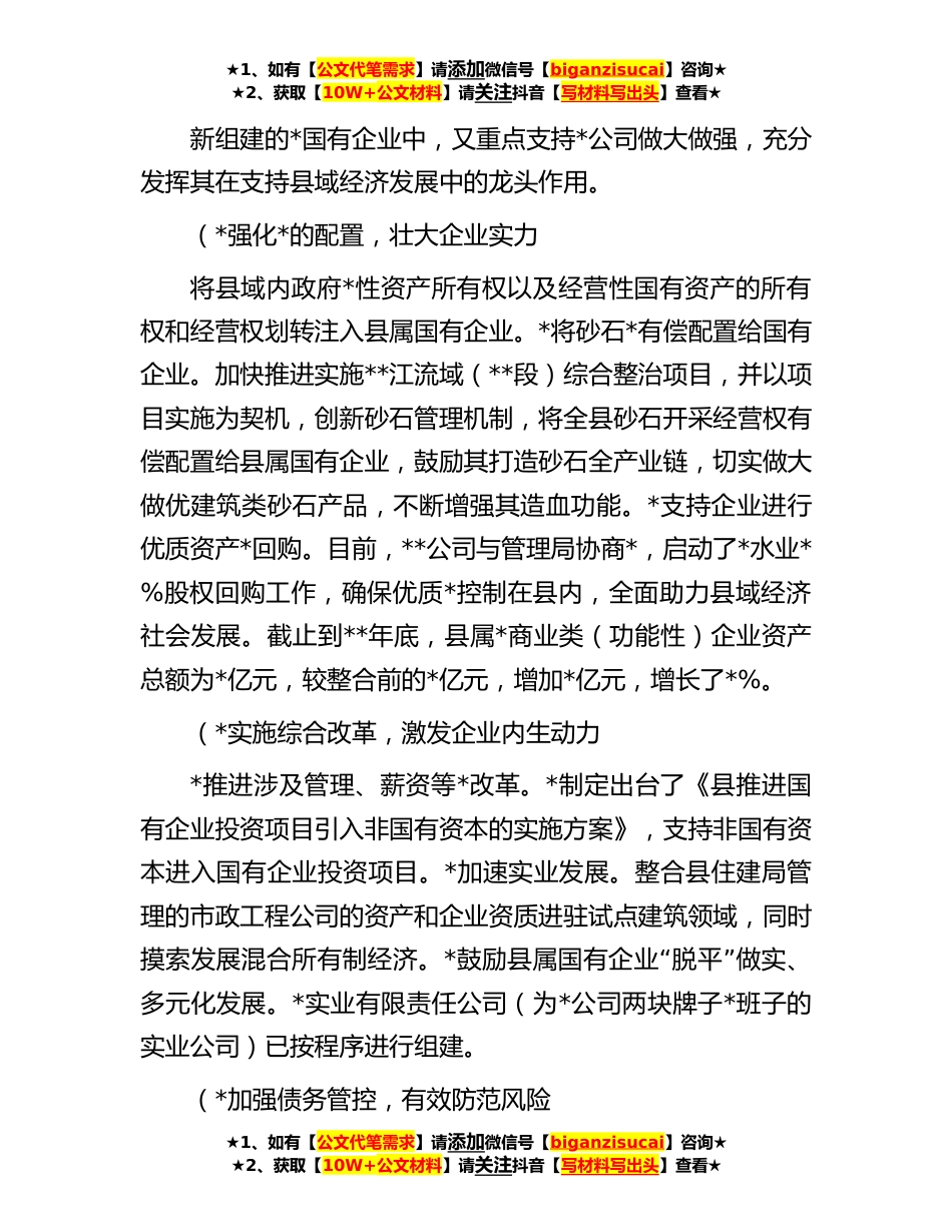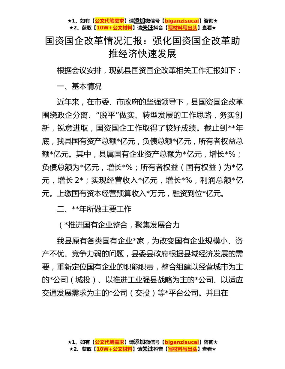 ★1、如有【公文代笔需求】请添加微信号【biganzisucai】咨询★★2、获取【10W+公文材料】请关注抖音【写材料写出头】查看★国资国企改革情况汇报:强化国资国企改革助推经济快速发展根据会议安排,现就县国资国企改革相关工作汇报如下:一、基本情况近年来,在市委、市政府的坚强领导下,县国资国企改革“”围绕政企分离、脱平做实、转型发展的工作思路,务实创新,锐意进取,国资国企工作取得了较好成绩。截止到**年底,我县国有资产总额*亿元,负债总额*亿元,所有者权益总额*亿元。其中,县属国有企业资产总额为*亿元,增长*%;负债总额为*亿元,增长*%;所有者权益(国有权益)为*亿元,增长2*;实现经营收入*亿元,增长*%,利润总额*亿元。上缴国有资本经营预算收入*万元,融资到位*亿元。二、**年所做主要...