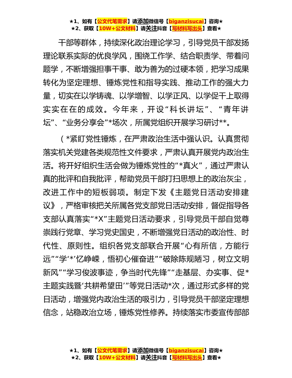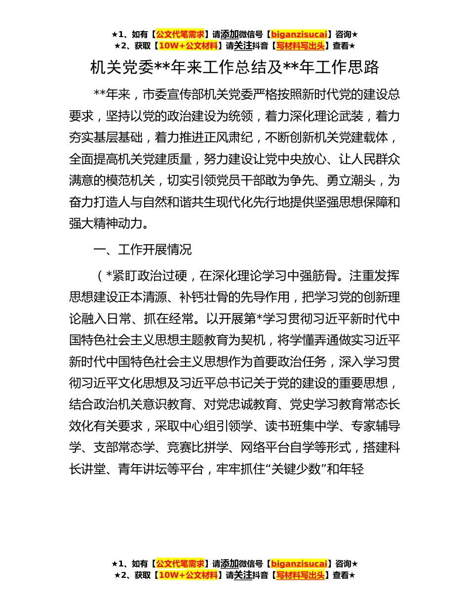★1、如有【公文代笔需求】请添加微信号【biganzisucai】咨询★★2、获取【10W+公文材料】请关注抖音【写材料写出头】查看★机关党委**年来工作总结及**年工作思路**年来,市委宣传部机关党委严格按照新时代党的建设总要求,坚持以党的政治建设为统领,着力深化理论武装,着力夯实基层基础,着力推进正风肃纪,不断创新机关党建载体,全面提高机关党建质量,努力建设让党中央放心、让人民群众满意的模范机关,切实引领党员干部敢为争先、勇立潮头,为奋力打造人与自然和谐共生现代化先行地提供坚强思想保障和强大精神动力。一、工作开展情况(*紧盯政治过硬,在深化理论学习中强筋骨。注重发挥思想建设正本清源、补钙壮骨的先导作用,把学习党的创新理论融入日常、抓在经常。以开展第*学习贯彻习近平新时代中国特...