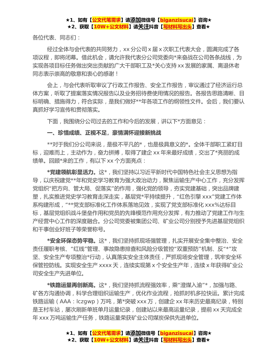 ★1、如有【公文代笔需求】请添加微信号【biganzisucai】咨询★★2、获取【10W+公文材料】请关注抖音【写材料写出头】查看★各位代表、同志们:经过全体与会代表的共同努力,xx分公司x届x次职工代表大会,圆满完成了各项议程,即将闭幕。借此机会,请允许我代表分公司党委向*来奋战在公司各条战线,为实现各项目标任务做出突出贡献的广大干部职工及*关心支持xx发展的家属、离退休老同志表示崇高的敬意和衷心的感谢!会上,与会代表听取审议了行政工作报告、安全工作报告,审议通过了经济运行总体方案,听取了提案落实情况报告以及业务招待费使用情况的报告。各报告思路清晰、目标明确、措施得力,符合实际,是我们做好**年各项工作的纲领性文件。会后,我们要认真抓好学习宣传和贯彻落实。下面,我围绕分公司过去...