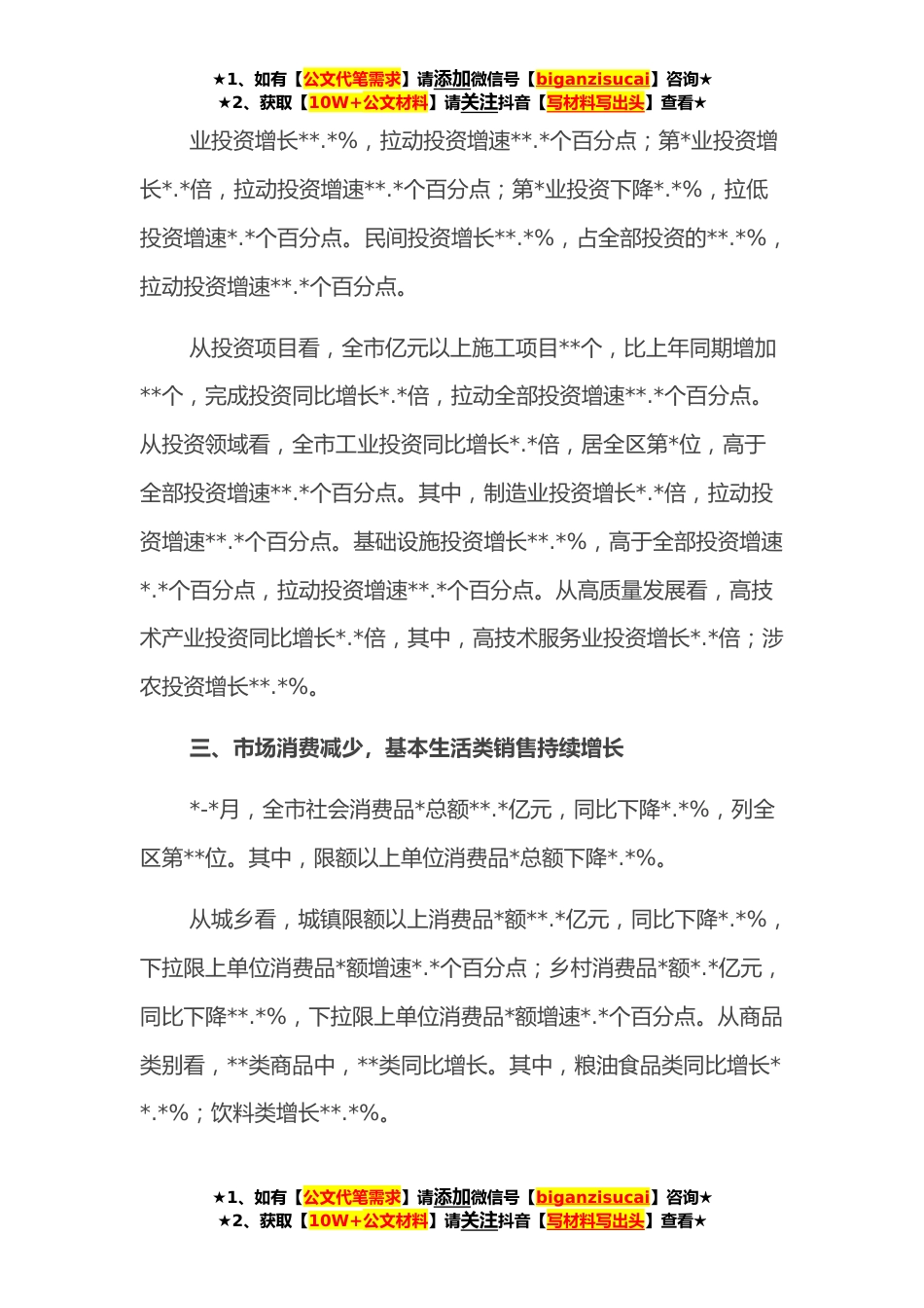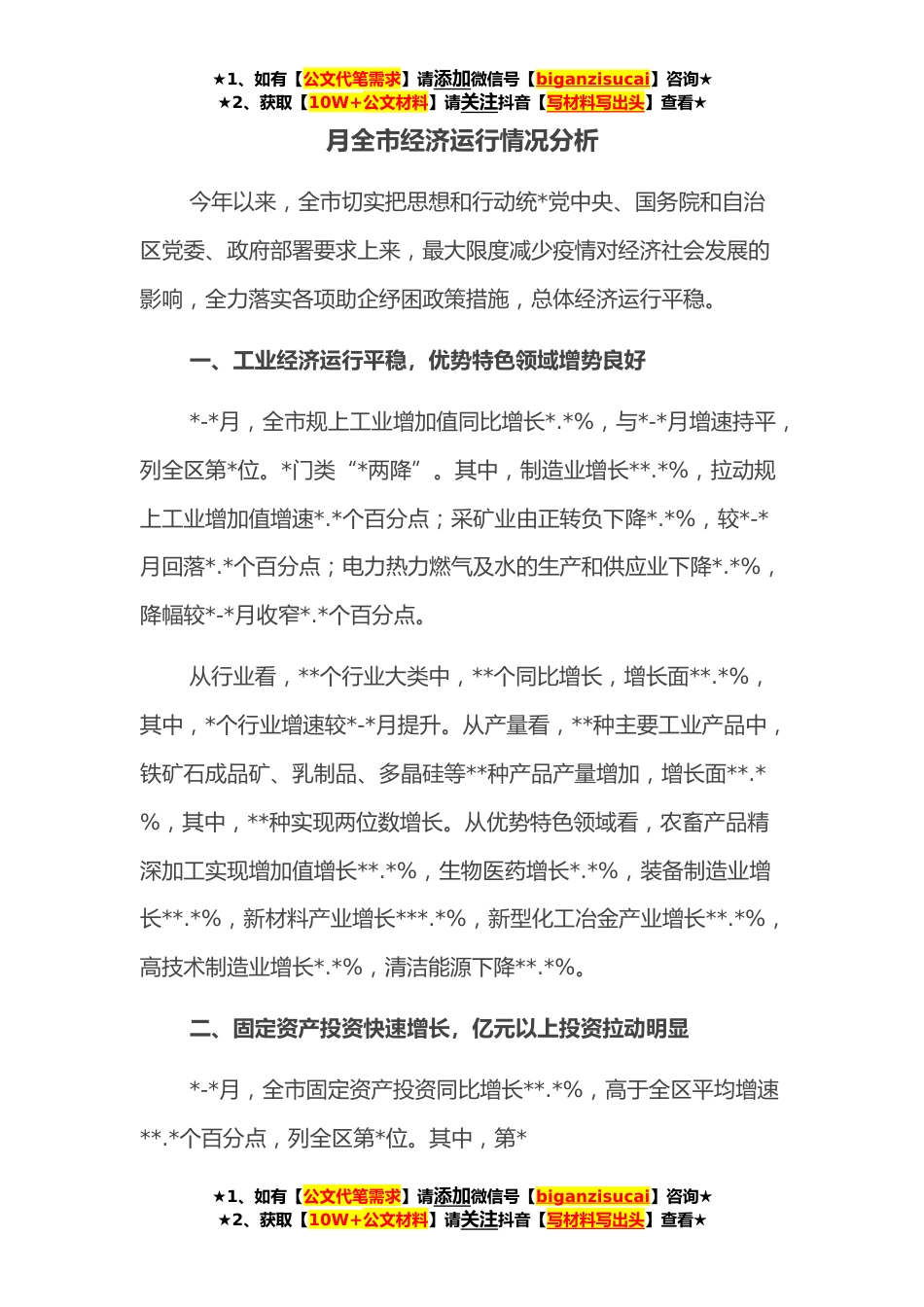 ★1、如有【公文代笔需求】请添加微信号【biganzisucai】咨询★★2、获取【10W+公文材料】请关注抖音【写材料写出头】查看★月全市经济运行情况分析今年以来,全市切实把思想和行动统*党中央、国务院和自治区党委、政府部署要求上来,最大限度减少疫情对经济社会发展的影响,全力落实各项助企纾困政策措施,总体经济运行平稳。一、工业经济运行平稳,优势特色领域增势良好*-*月,全市规上工业增加值同比增长*.*%,与*-*月增速持平,列全区第*位。*门类“*两降”。其中,制造业增长**.*%,拉动规上工业增加值增速*.*个百分点;采矿业由正转负下降*.*%,较*-*月回落*.*个百分点;电力热力燃气及水的生产和供应业下降*.*%,降幅较*-*月收窄*.*个百分点。从行业看,**个行业大类中,**个同比增长,增长面**.*%,其中,...
