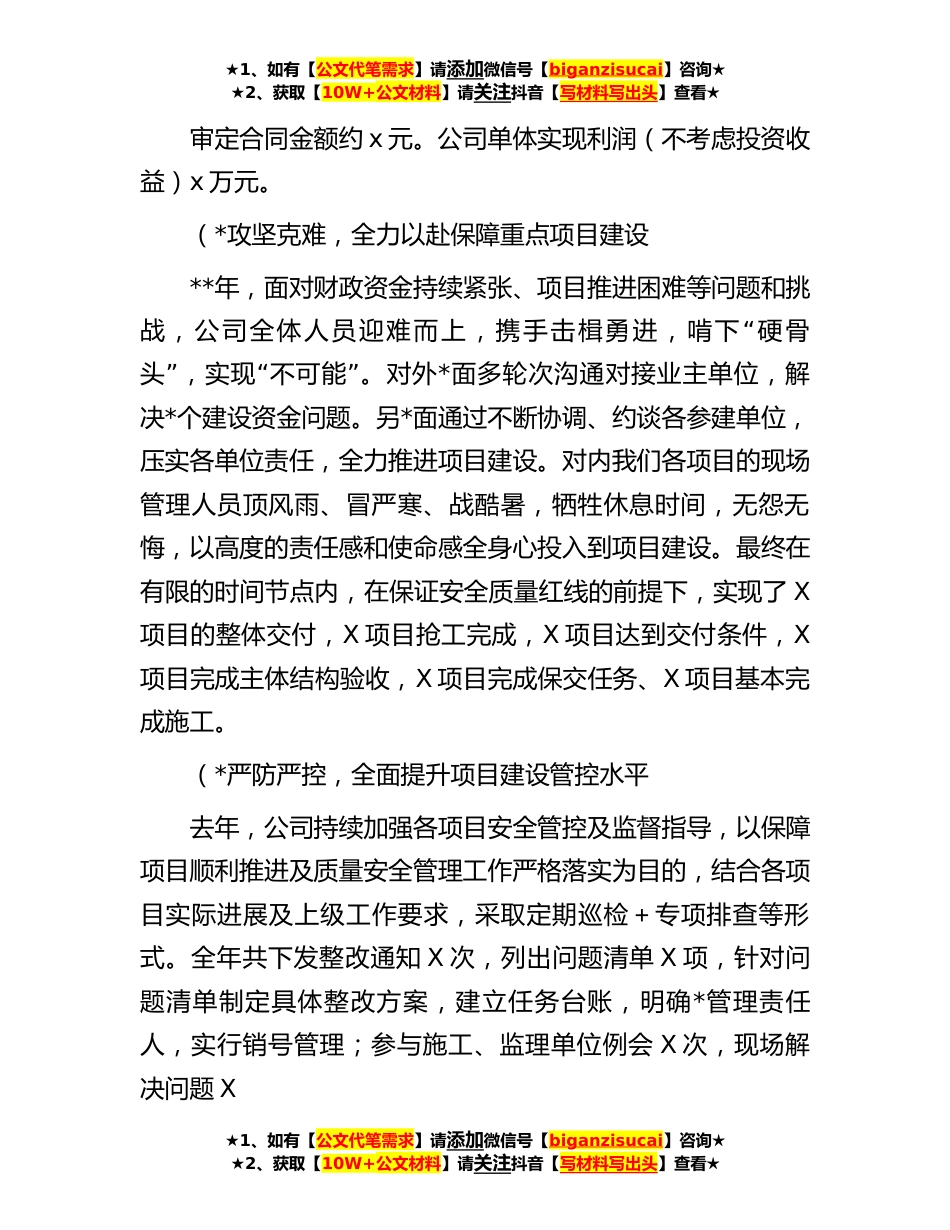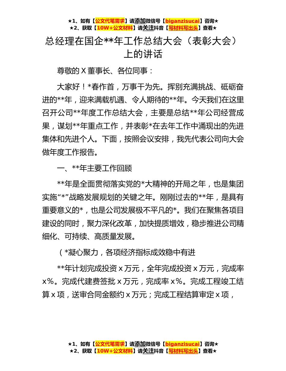 ★1、如有【公文代笔需求】请添加微信号【biganzisucai】咨询★★2、获取【10W+公文材料】请关注抖音【写材料写出头】查看★总经理在国企**年工作总结大会(表彰大会)上的讲话尊敬的X董事长、各位同事:大家好!*春作首,万事干为先。挥别充满挑战、砥砺奋进的**年,迎来满载机遇、令人期待的**年。今天我们在这里召开公司**年度工作总结大会,主要是总结**年公司经营成果,谋划**年重点工作,并表彰*在去年工作中涌现出的先进集体和先进个人。下面,按照会议安排,我先代表公司向大会做年度工作报告。一、**年主要工作回顾**年是全面贯彻落实党的*大精神的开局之年,也是集团“实施*”战略发展规划的关键之年。刚刚过去的**年,是具有重要意义的*,也是公司发展极不平凡的*。我们在聚焦各项目建设的同时,聚力深...