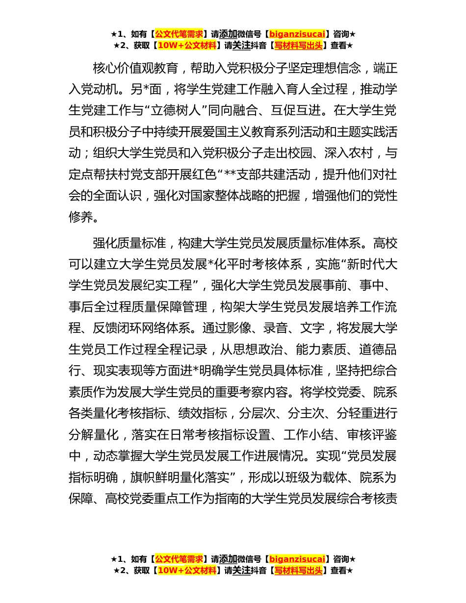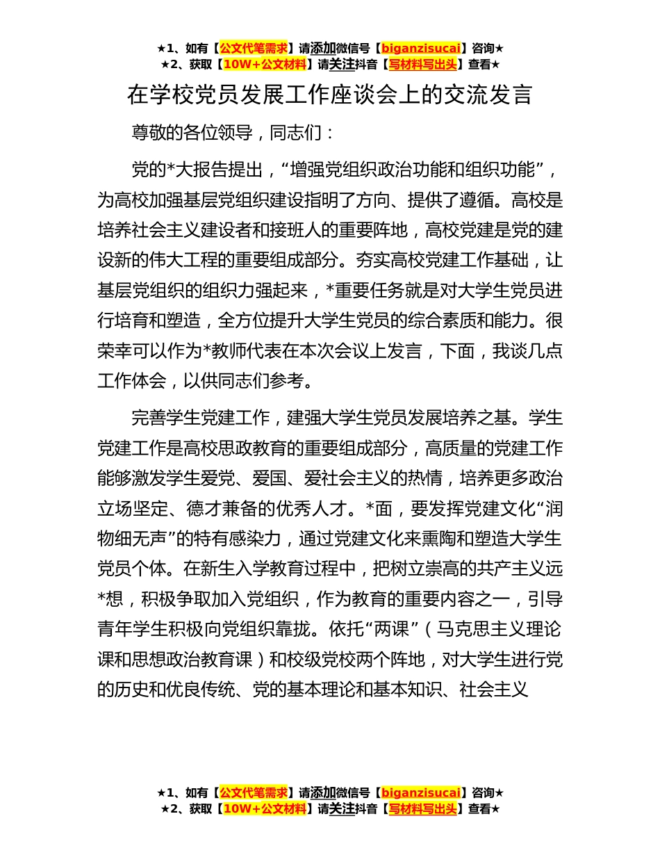 ★1、如有【公文代笔需求】请添加微信号【biganzisucai】咨询★★2、获取【10W+公文材料】请关注抖音【写材料写出头】查看★在学校党员发展工作座谈会上的交流发言尊敬的各位领导,同志们:党的*“”大报告提出,增强党组织政治功能和组织功能,为高校加强基层党组织建设指明了方向、提供了遵循。高校是培养社会主义建设者和接班人的重要阵地,高校党建是党的建设新的伟大工程的重要组成部分。夯实高校党建工作基础,让基层党组织的组织力强起来,*重要任务就是对大学生党员进行培育和塑造,全方位提升大学生党员的综合素质和能力。很荣幸可以作为*教师代表在本次会议上发言,下面,我谈几点工作体会,以供同志们参考。完善学生党建工作,建强大学生党员发展培养之基。学生党建工作是高校思政教育的重要组成部分,...