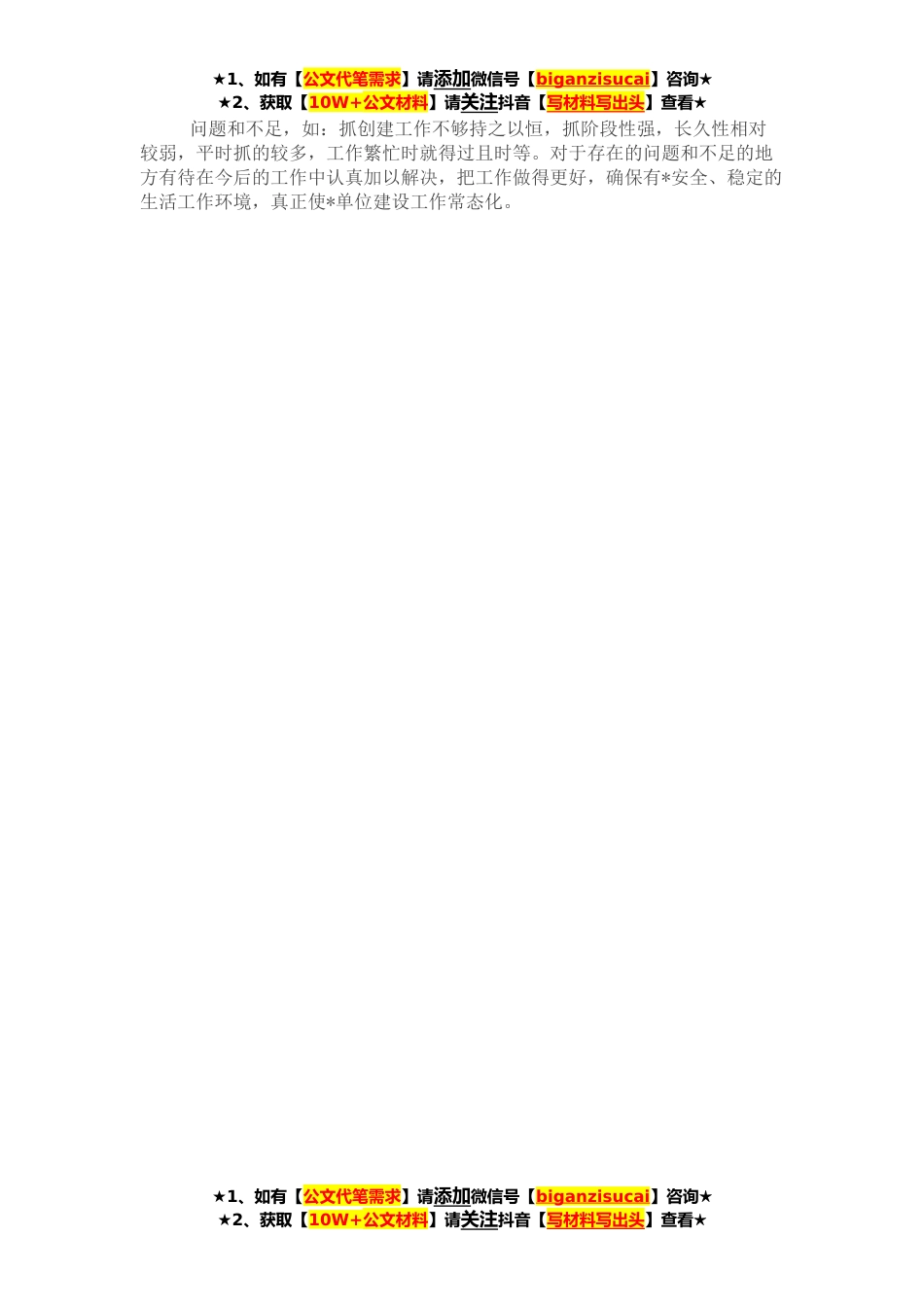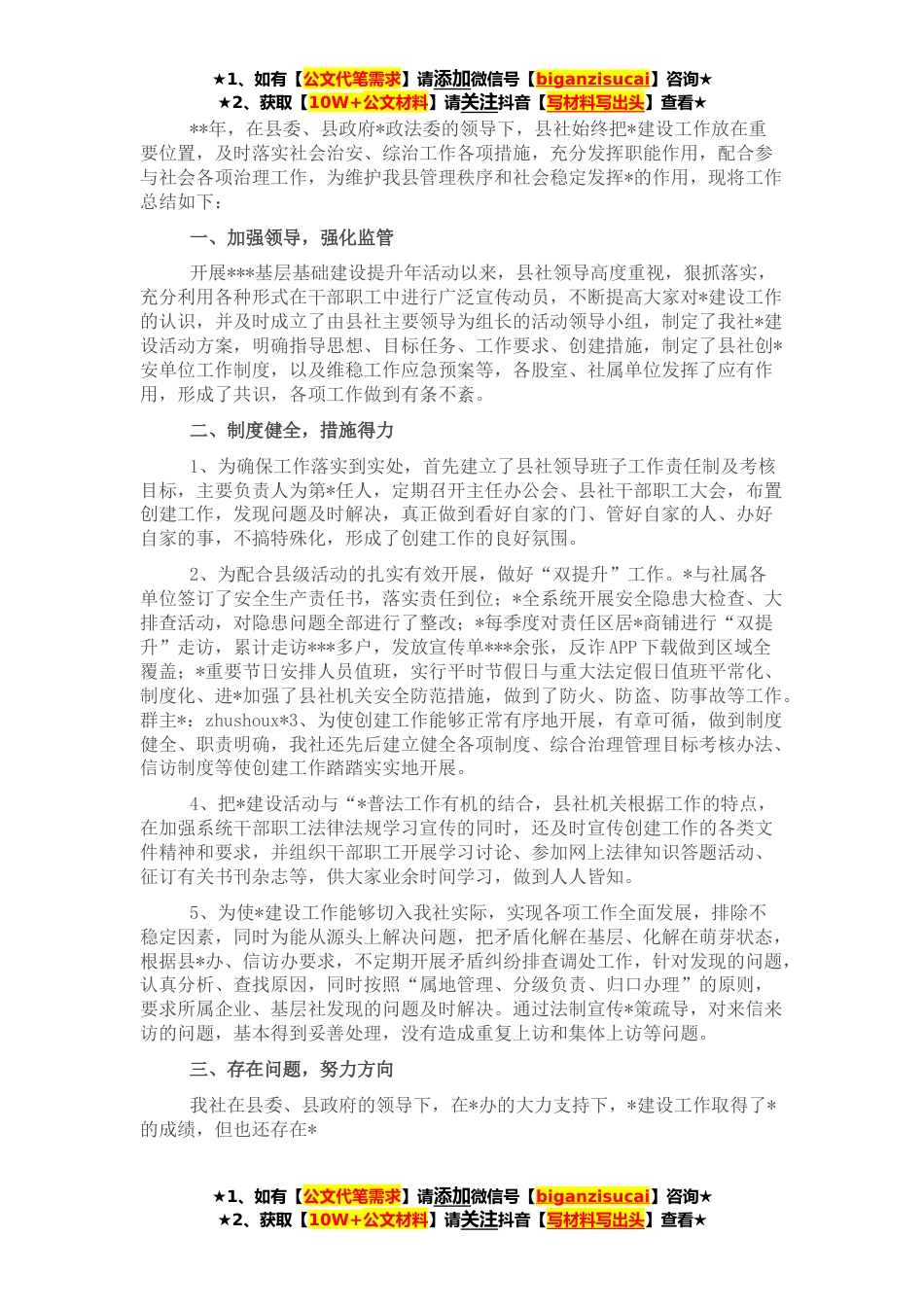 ★1、如有【公文代笔需求】请添加微信号【biganzisucai】咨询★★2、获取【10W+公文材料】请关注抖音【写材料写出头】查看★**年,在县委、县政府*政法委的领导下,县社始终把*建设工作放在重要位置,及时落实社会治安、综治工作各项措施,充分发挥职能作用,配合参与社会各项治理工作,为维护我县管理秩序和社会稳定发挥*的作用,现将工作总结如下:一、加强领导,强化监管开展***基层基础建设提升年活动以来,县社领导高度重视,狠抓落实,充分利用各种形式在干部职工中进行广泛宣传动员,不断提高大家对*建设工作的认识,并及时成立了由县社主要领导为组长的活动领导小组,制定了我社*建设活动方案,明确指导思想、目标任务、工作要求、创建措施,制定了县社创*安单位工作制度,以及维稳工作应急预案等,各股室...