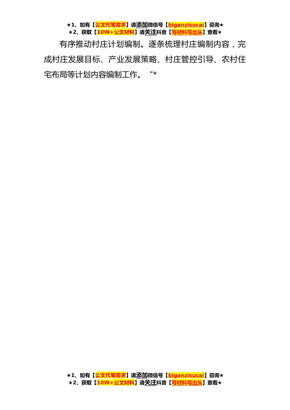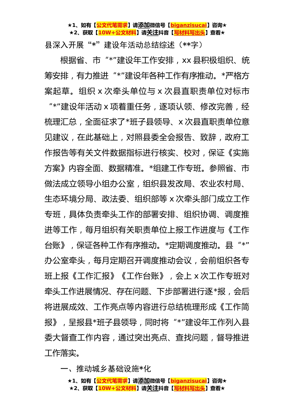 ★1、如有【公文代笔需求】请添加微信号【biganzisucai】咨询★★2、获取【10W+公文材料】请关注抖音【写材料写出头】查看★县深入开展“*”建设年活动总结综述(**字)根据省、市“*”建设年工作安排,xx县积极组织、统筹安排,有力推进“*”建设年各种工作有序推动。*严格方案起草。组织x次牵头单位与x次县直职责单位对标市“*”建设年活动x项着重任务,逐项认领、修改完善,经梳理汇总,全面征求了*班子县领导、x次县直职责单位意见建议,在此基础上,对照县委全会报告、致辞,政府工作报告等有关文件数据指标进行核实、校对,保证《实施方案》内容全面、数据精准。*组建工作专班。参照省、市做法成立领导小组办公室,组织县发改局、农业农村局、生态环境分局、政法委、组织部等x次牵头部门成立工作专班,具体...