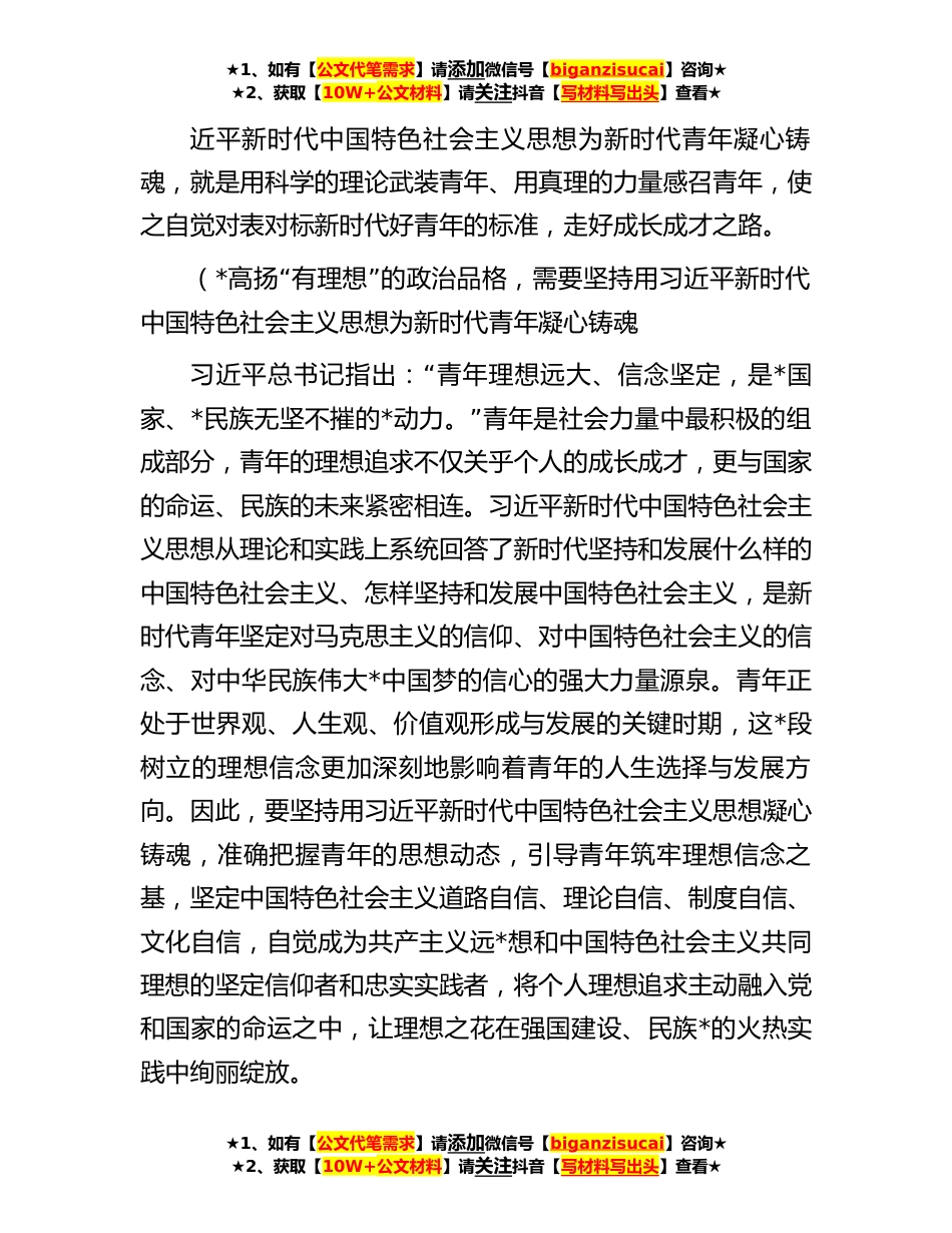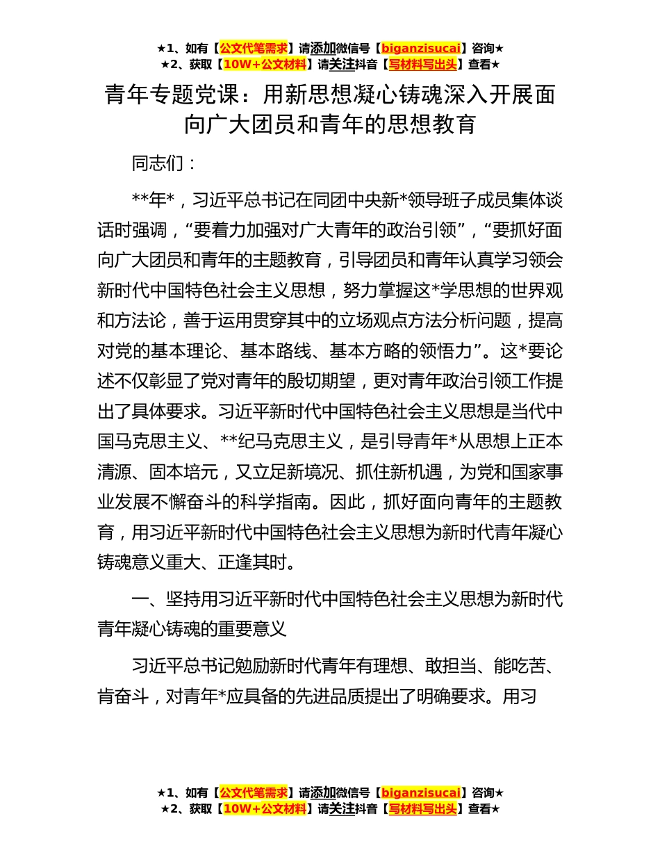 ★1、如有【公文代笔需求】请添加微信号【biganzisucai】咨询★★2、获取【10W+公文材料】请关注抖音【写材料写出头】查看★青年专题党课:用新思想凝心铸魂深入开展面向广大团员和青年的思想教育同志们:**年*,习近平总书记在同团中央新*领导班子成员集体谈“”“话时强调,要着力加强对广大青年的政治引领,要抓好面向广大团员和青年的主题教育,引导团员和青年认真学习领会新时代中国特色社会主义思想,努力掌握这*学思想的世界观和方法论,善于运用贯穿其中的立场观点方法分析问题,提高”对党的基本理论、基本路线、基本方略的领悟力。这*要论述不仅彰显了党对青年的殷切期望,更对青年政治引领工作提出了具体要求。习近平新时代中国特色社会主义思想是当代中国马克思主义、**纪马克思主义,是引导青年*从思...
