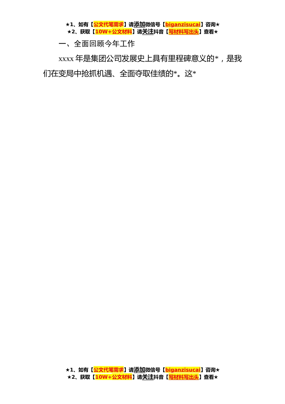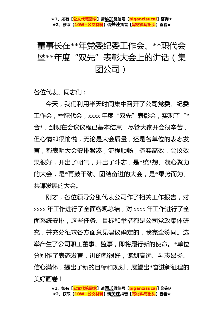 ★1、如有【公文代笔需求】请添加微信号【biganzisucai】咨询★★2、获取【10W+公文材料】请关注抖音【写材料写出头】查看★董事长在**年党委纪委工作会、**职代会暨**年度“双先”表彰大会上的讲话(集团公司)各位代表、同志们:今天,我们利用半天时间集中召开了公司党委、纪委工作会,**职代会,xxxx年度“双先”表彰会,实现了“*合*,到现在会议议程已基本结束,尽管大家开会很辛苦,但心情却很愉悦,无论是大会质量,还是各单位的表态发言,都表明大会安排紧凑,流程顺畅,务实高效,会议效果很好,开出了朝气,开出了斗志,是*统*想、凝心聚力的大会,是*再鼓干劲、团结奋进的大会,是*乘势而为、共谋发展的大会。刚才,各位领导分别代表公司作了相关工作报告,对xxxx年工作进行了全面客观总结,对xxxx年...