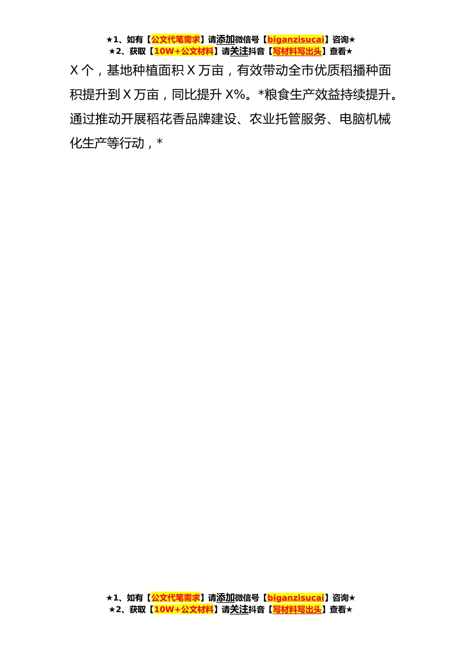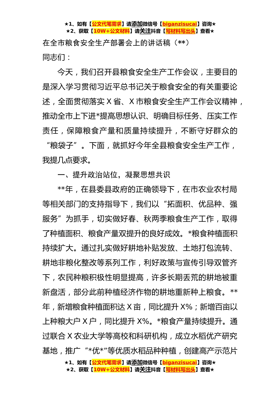 ★1、如有【公文代笔需求】请添加微信号【biganzisucai】咨询★★2、获取【10W+公文材料】请关注抖音【写材料写出头】查看★在全市粮食安全生产部署会上的讲话稿(**)同志们:今天,我们召开县粮食安全生产工作会议,主要目的是深入学习贯彻习近平总书记关于粮食安全的有关重要论述,全面贯彻落实X省、X市粮食安全生产工作会议精神,推动全市上下进*提高思想认识、明确目标任务、压实工作责任,保障粮食产量和质量持续提升,不断守好群众的“粮袋子”。下面,就抓好今年全县粮食安全生产工作,我提几点要求。一、提升政治站位,凝聚思想共识**年,在县委县政府的正确领导下,在市农业农村局等相关部门的支持指导下,我们以“拓面积、优品种、强服务”为抓手,切实做好春、秋两季粮食生产工作,取得了种植面积、粮...