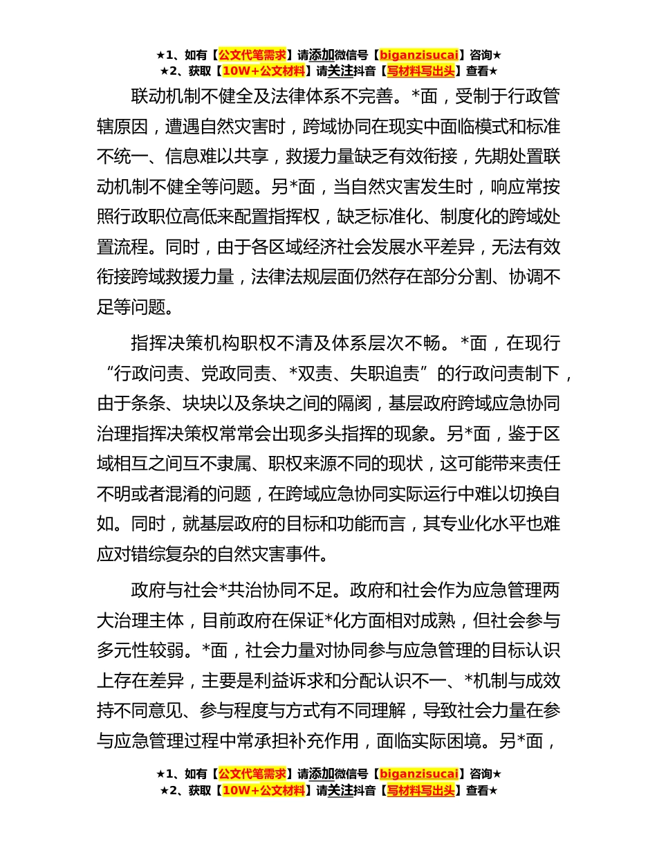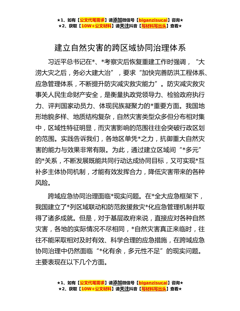 ★1、如有【公文代笔需求】请添加微信号【biganzisucai】咨询★★2、获取【10W+公文材料】请关注抖音【写材料写出头】查看★建立自然灾害的跨区域协同治理体系习近平总书记在*、*考察灾后恢复重建工作时强调,“大涝大灾之后,务必大建大治”,要求“加快完善防洪工程体系、应急管理体系,不断提升防灾减灾救灾能力”。防灾减灾救灾事关人民生命财产安全,是衡量执政党领导力、检验政府执行力、评判国家动员力、体现民族凝聚力的*重要方面。我国地形地貌多样、地质结构复杂,自然灾害类型众多但分布相对集中,区域性特征明显,而灾害影响的范围往往会突破行政区划的范围。实践告诉我们,各地区单凭*之力,抗御重大自然灾害的能力与效果非常有限。为此,通过建立区域间“*多元”的*关系,不断发展既能共同行动达成...