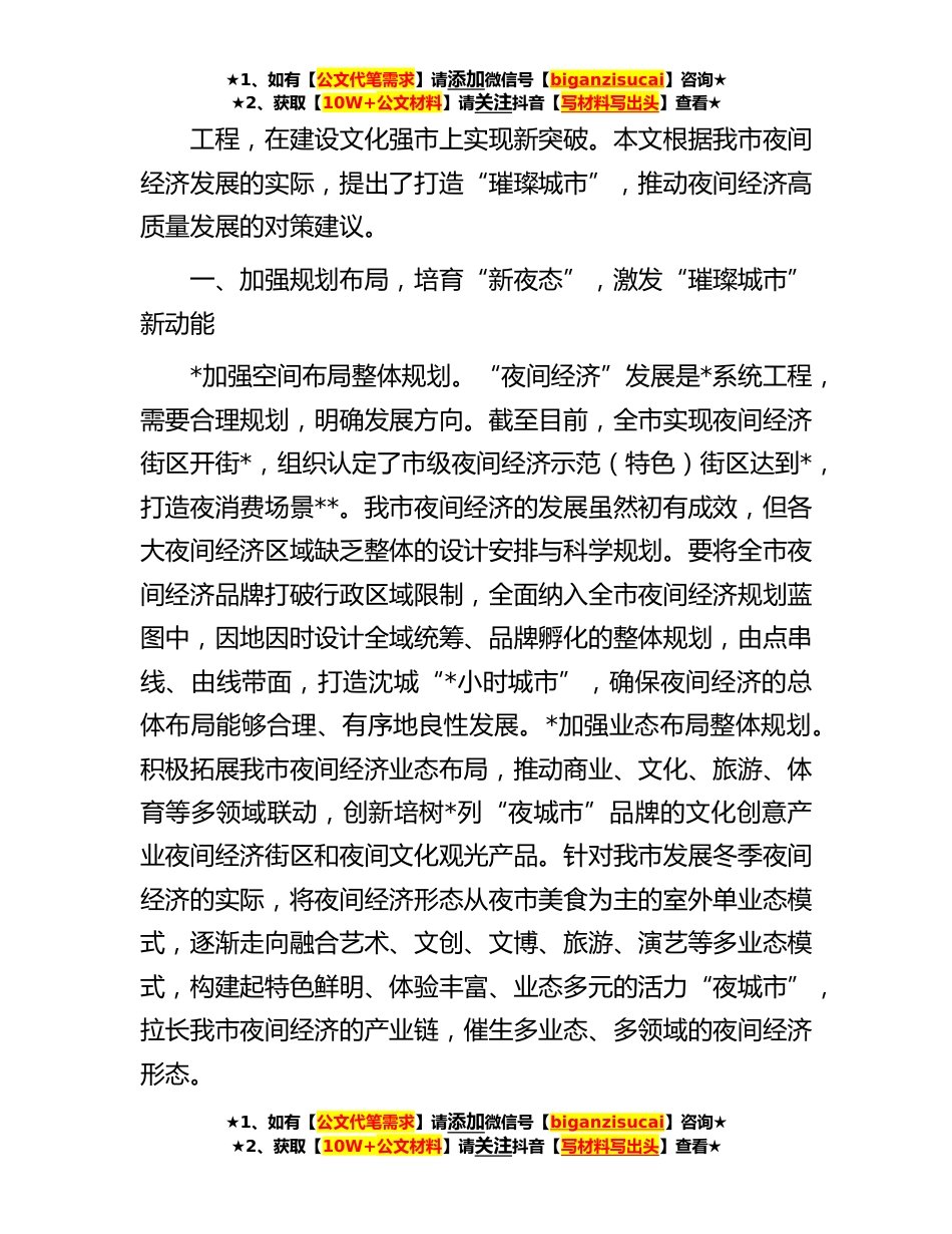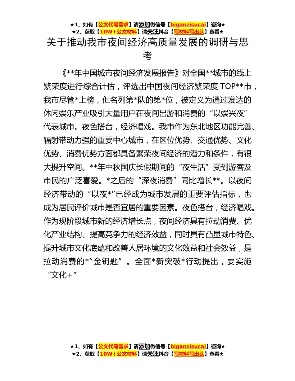 ★1、如有【公文代笔需求】请添加微信号【biganzisucai】咨询★★2、获取【10W+公文材料】请关注抖音【写材料写出头】查看★关于推动我市夜间经济高质量发展的调研与思考《**年中国城市夜间经济发展报告》对全国**城市的线上繁荣度进行综合计估,评选出中国夜间经济繁荣度TOP**市,我市尽管*上榜,但名列第*队的第*位,被定义为通过发达的休闲娱乐产业吸引大量用户在夜间出游和消费的“以娱兴夜”代表城市。夜色搭台,经济唱戏。我市作为东北地区功能完善、辐射带动力强的重要中心城市,在区位优势、交通优势、文化优势、消费优势方面都具备繁荣夜间经济的潜力和条件,有很大提升空间。**年中秋国庆长假期间的“夜生活”受到游客及市民的广泛喜爱。*之后的“深夜消费”同比增长**。以夜间经济带动的“以夜*”已经...