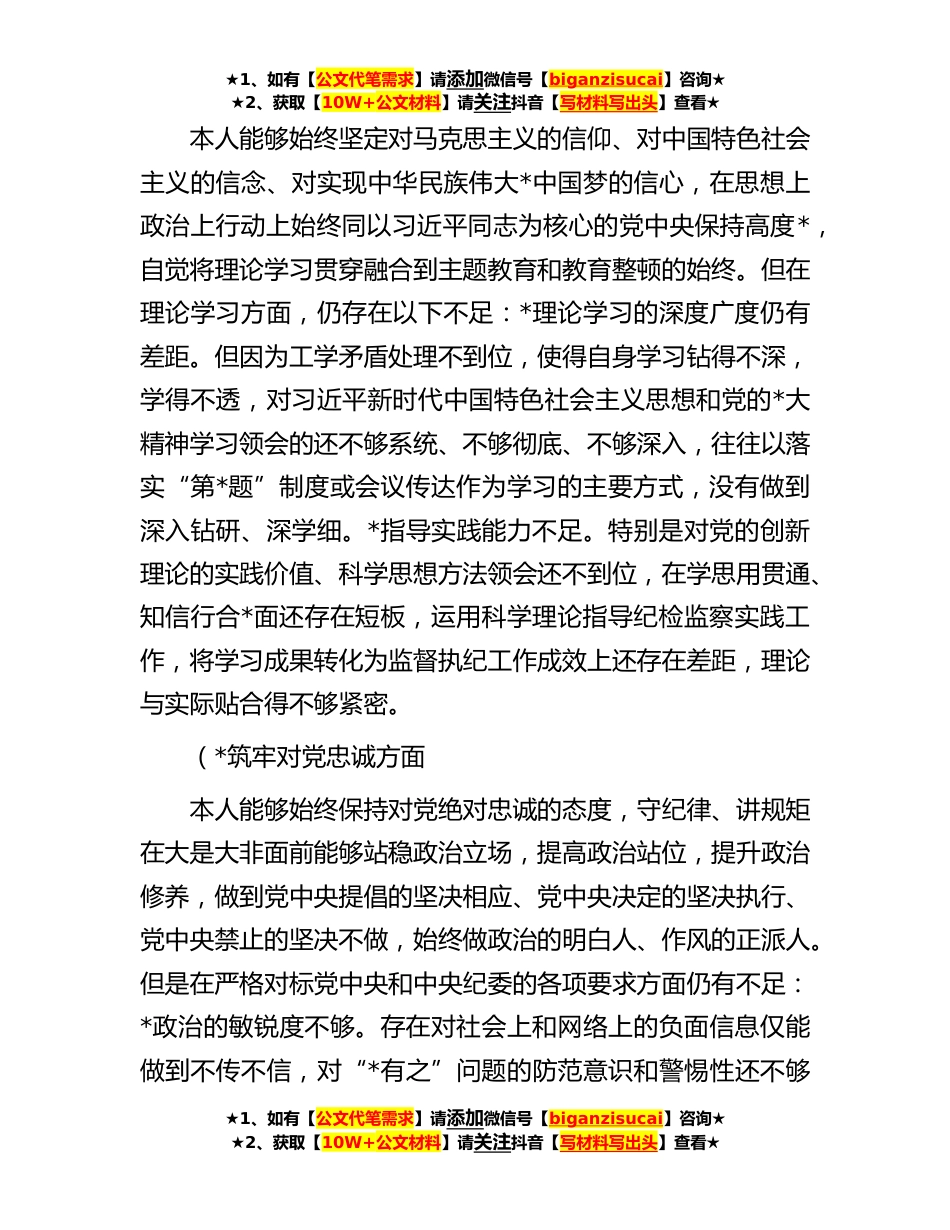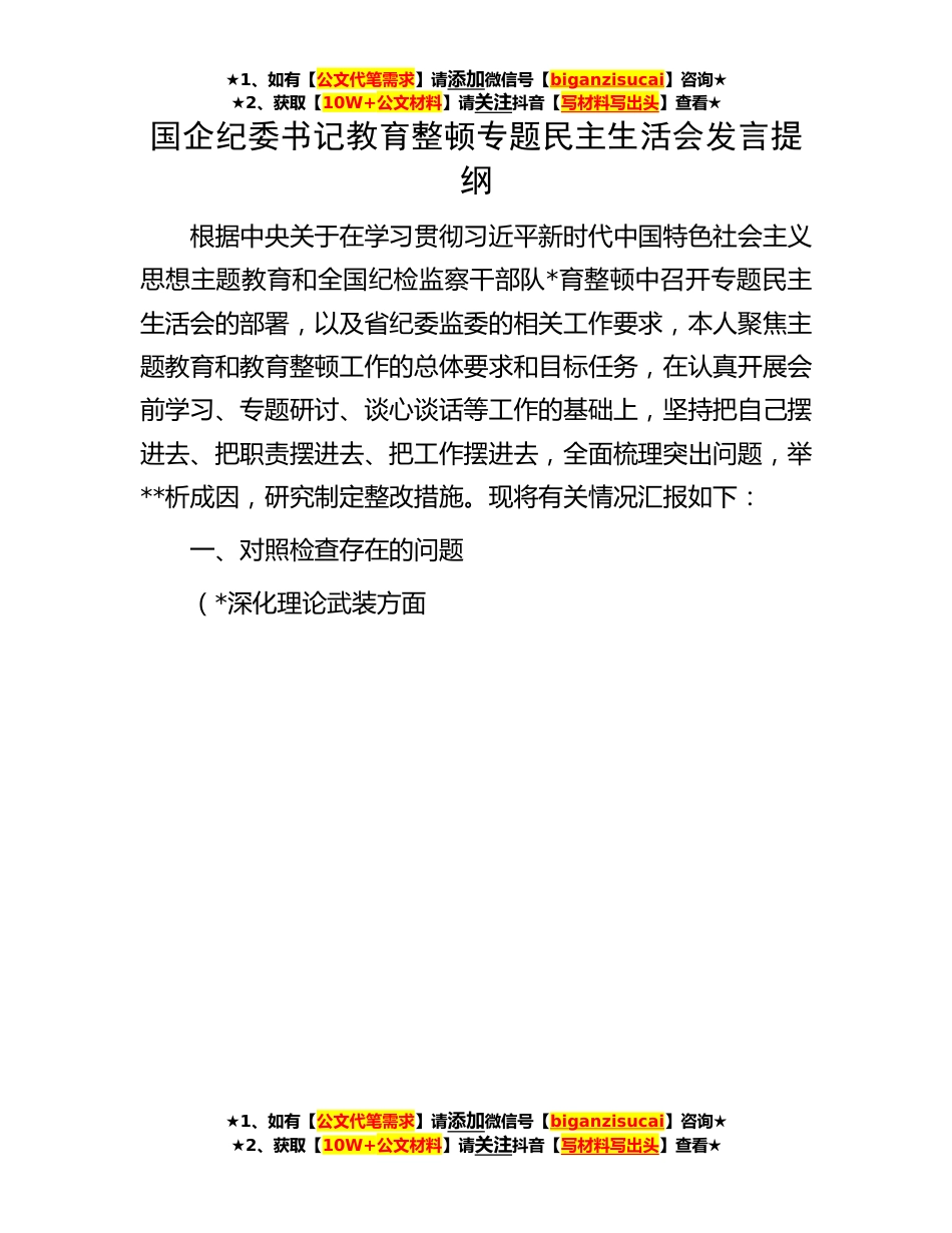 ★1、如有【公文代笔需求】请添加微信号【biganzisucai】咨询★★2、获取【10W+公文材料】请关注抖音【写材料写出头】查看★国企纪委书记教育整顿专题民主生活会发言提纲根据中央关于在学习贯彻习近平新时代中国特色社会主义思想主题教育和全国纪检监察干部队*育整顿中召开专题民主生活会的部署,以及省纪委监委的相关工作要求,本人聚焦主题教育和教育整顿工作的总体要求和目标任务,在认真开展会前学习、专题研讨、谈心谈话等工作的基础上,坚持把自己摆进去、把职责摆进去、把工作摆进去,全面梳理突出问题,举**析成因,研究制定整改措施。现将有关情况汇报如下:一、对照检查存在的问题(*深化理论武装方面★1、如有【公文代笔需求】请添加微信号【biganzisucai】咨询★★2、获取【10W+公文材料】请关注抖音...