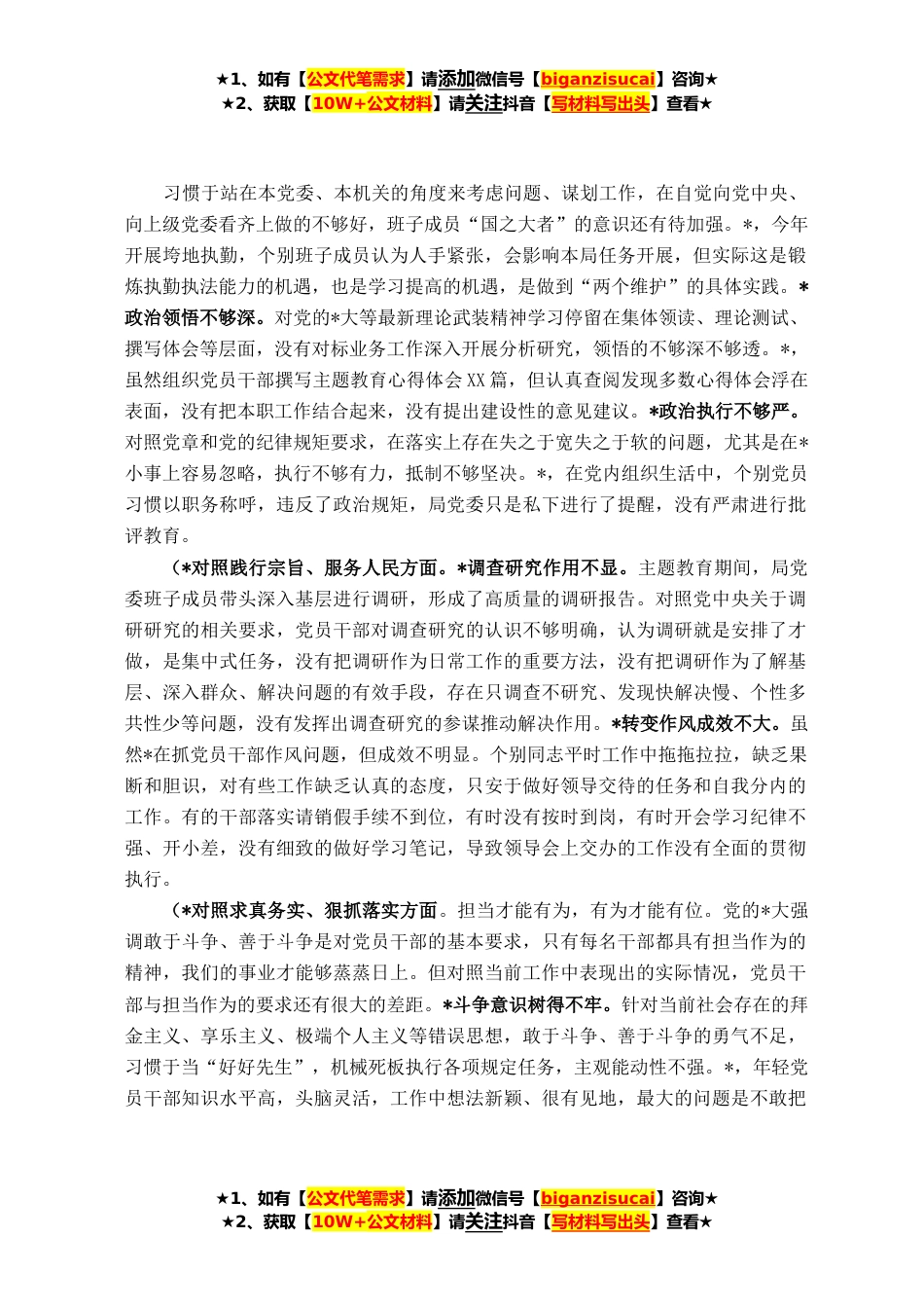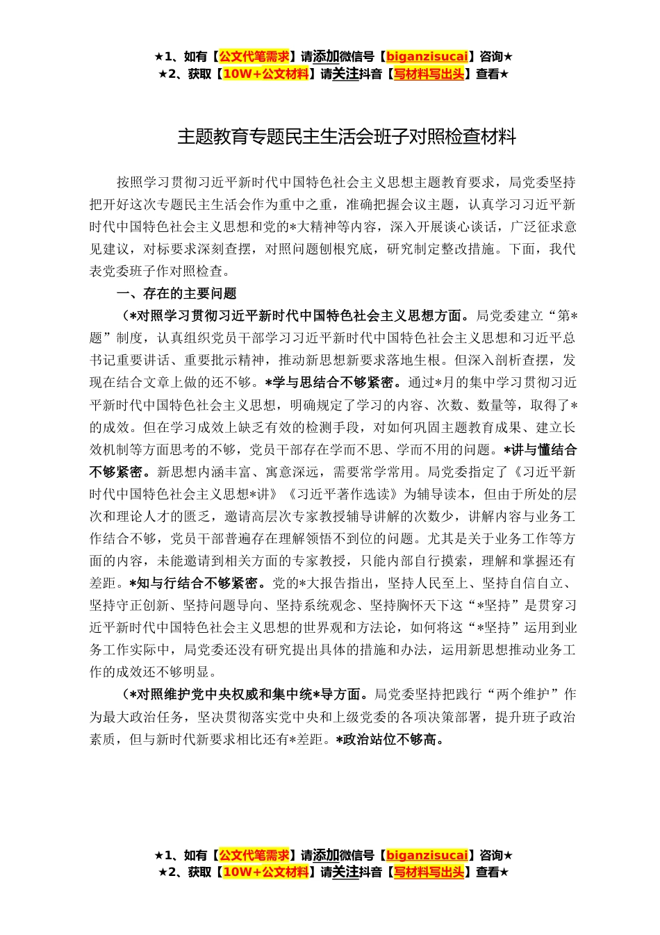 ★1、如有【公文代笔需求】请添加微信号【biganzisucai】咨询★★2、获取【10W+公文材料】请关注抖音【写材料写出头】查看★主题教育专题民主生活会班子对照检查材料按照学习贯彻习近平新时代中国特色社会主义思想主题教育要求,局党委坚持把开好这次专题民主生活会作为重中之重,准确把握会议主题,认真学习习近平新时代中国特色社会主义思想和党的*大精神等内容,深入开展谈心谈话,广泛征求意见建议,对标要求深刻查摆,对照问题刨根究底,研究制定整改措施。下面,我代表党委班子作对照检查。一、存在的主要问题(*对照学习贯彻习近平新时代中国特色社会主义思想方面。局党委建立“第*题”制度,认真组织党员干部学习习近平新时代中国特色社会主义思想和习近平总书记重要讲话、重要批示精神,推动新思想新要求...