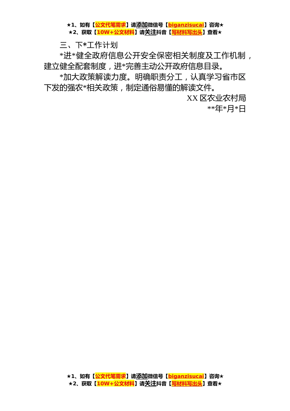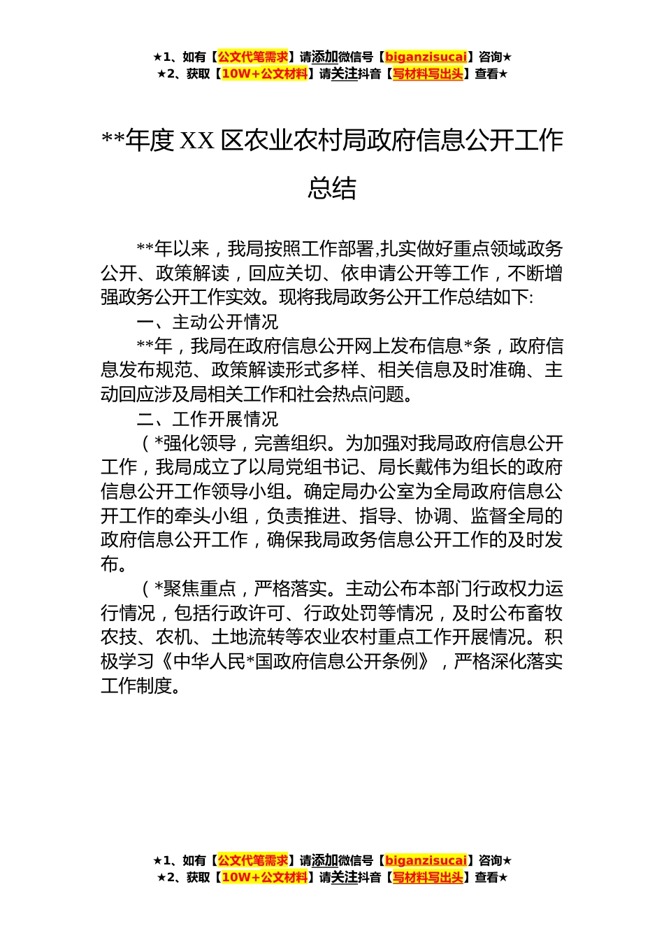★1、如有【公文代笔需求】请添加微信号【biganzisucai】咨询★★2、获取【10W+公文材料】请关注抖音【写材料写出头】查看★**年度XX区农业农村局政府信息公开工作总结**年以来,我局按照工作部署,扎实做好重点领域政务公开、政策解读,回应关切、依申请公开等工作,不断增强政务公开工作实效。现将我局政务公开工作总结如下:一、主动公开情况**年,我局在政府信息公开网上发布信息*条,政府信息发布规范、政策解读形式多样、相关信息及时准确、主动回应涉及局相关工作和社会热点问题。二、工作开展情况(*强化领导,完善组织。为加强对我局政府信息公开工作,我局成立了以局党组书记、局长戴伟为组长的政府信息公开工作领导小组。确定局办公室为全局政府信息公开工作的牵头小组,负责推进、指导、协调、监督全局...