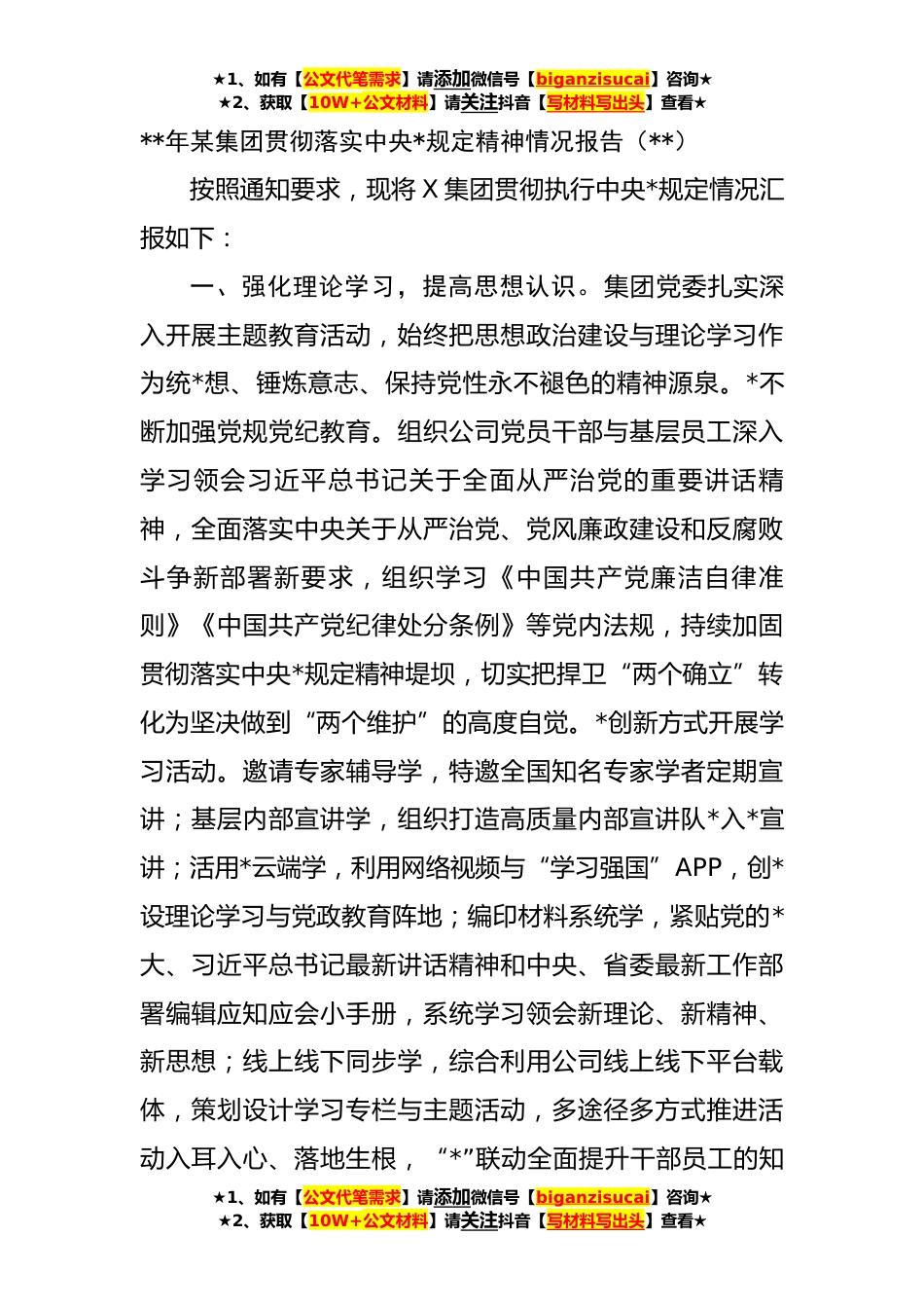 ★1、如有【公文代笔需求】请添加微信号【biganzisucai】咨询★★2、获取【10W+公文材料】请关注抖音【写材料写出头】查看★**年某集团贯彻落实中央*规定精神情况报告(**)按照通知要求,现将X集团贯彻执行中央*规定情况汇报如下:一、强化理论学习,提高思想认识。集团党委扎实深入开展主题教育活动,始终把思想政治建设与理论学习作为统*想、锤炼意志、保持党性永不褪色的精神源泉。*不断加强党规党纪教育。组织公司党员干部与基层员工深入学习领会习近平总书记关于全面从严治党的重要讲话精神,全面落实中央关于从严治党、党风廉政建设和反腐败斗争新部署新要求,组织学习《中国共产党廉洁自律准则》《中国共产党纪律处分条例》等党内法规,持续加固贯彻落实中央*规定精神堤坝,切实把捍卫“两个确立”转化为...