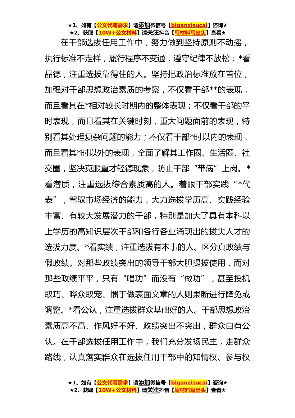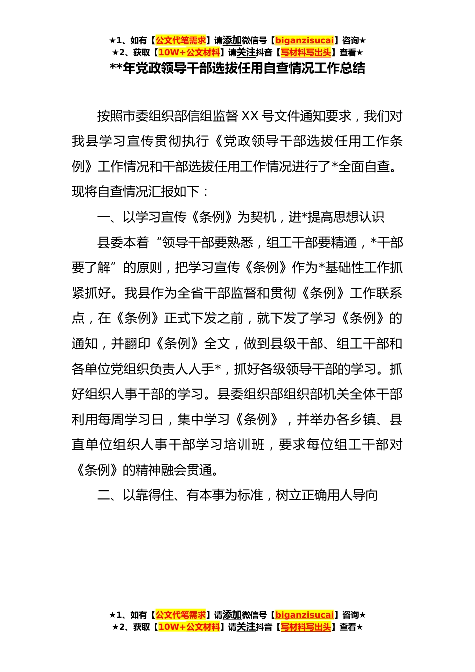 ★1、如有【公文代笔需求】请添加微信号【biganzisucai】咨询★★2、获取【10W+公文材料】请关注抖音【写材料写出头】查看★**年党政领导干部选拔任用自查情况工作总结按照市委组织部信组监督XX号文件通知要求,我们对我县学习宣传贯彻执行《党政领导干部选拔任用工作条例》工作情况和干部选拔任用工作情况进行了*全面自查。现将自查情况汇报如下:一、以学习宣传《条例》为契机,进*提高思想认识县委本着“领导干部要熟悉,组工干部要精通,*干部要了解”的原则,把学习宣传《条例》作为*基础性工作抓紧抓好。我县作为全省干部监督和贯彻《条例》工作联系点,在《条例》正式下发之前,就下发了学习《条例》的通知,并翻印《条例》全文,做到县级干部、组工干部和各单位党组织负责人人手*,抓好各级领导干部的学习...