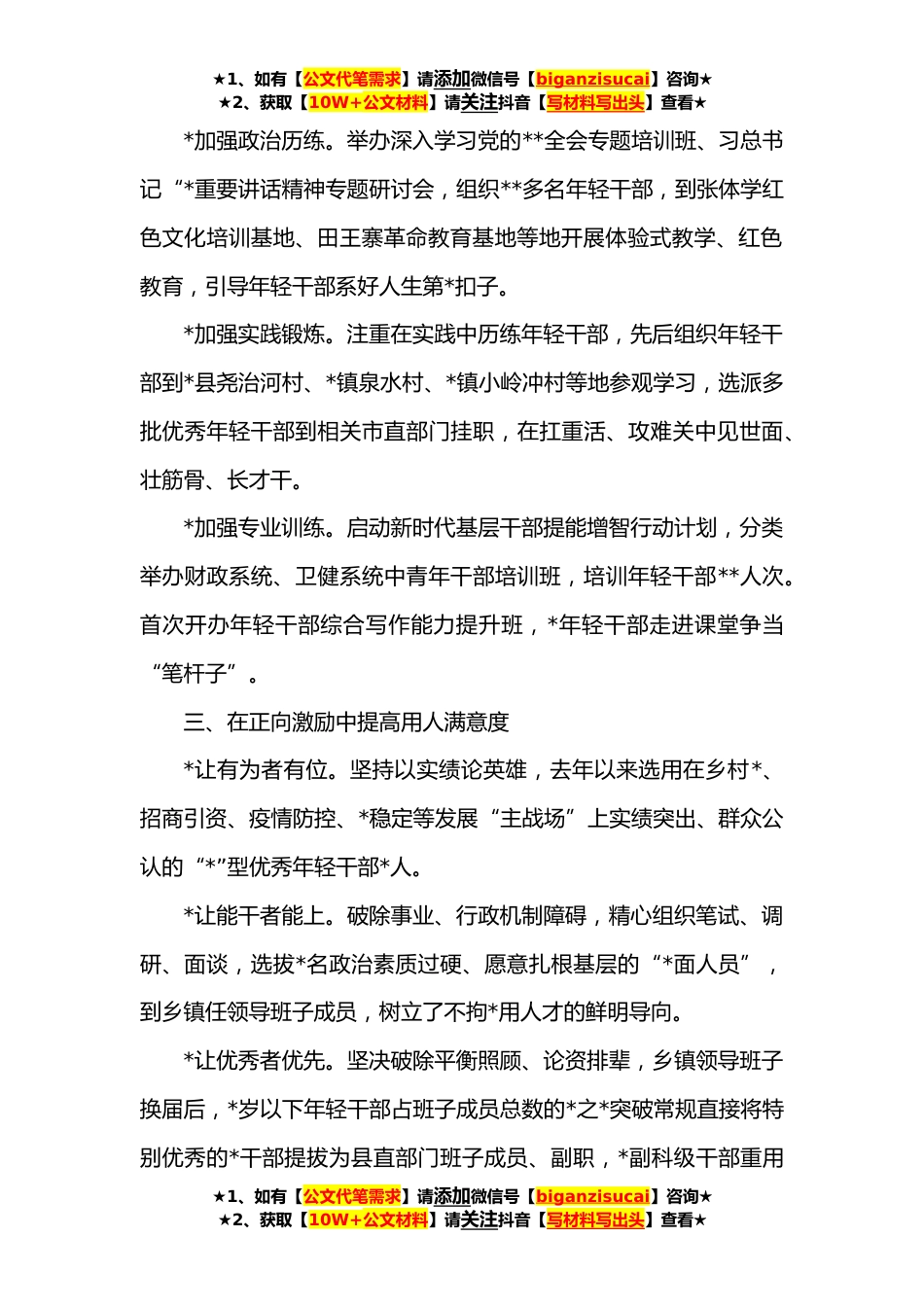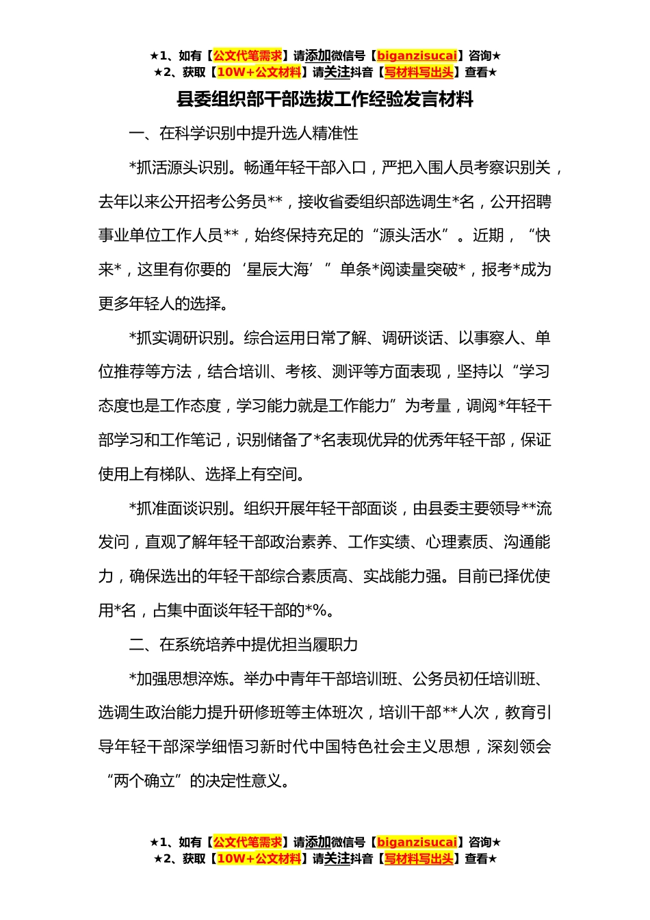 ★1、如有【公文代笔需求】请添加微信号【biganzisucai】咨询★★2、获取【10W+公文材料】请关注抖音【写材料写出头】查看★县委组织部干部选拔工作经验发言材料一、在科学识别中提升选人精准性*抓活源头识别。畅通年轻干部入口,严把入围人员考察识别关,去年以来公开招考公务员**,接收省委组织部选调生*名,公开招聘事业单位工作人员**,始终保持充足的“源头活水”。近期,“快来*,这里有你要的‘星辰大海’”单条*阅读量突破*,报考*成为更多年轻人的选择。*抓实调研识别。综合运用日常了解、调研谈话、以事察人、单位推荐等方法,结合培训、考核、测评等方面表现,坚持以“学习态度也是工作态度,学习能力就是工作能力”为考量,调阅*年轻干部学习和工作笔记,识别储备了*名表现优异的优秀年轻干部,保证使...