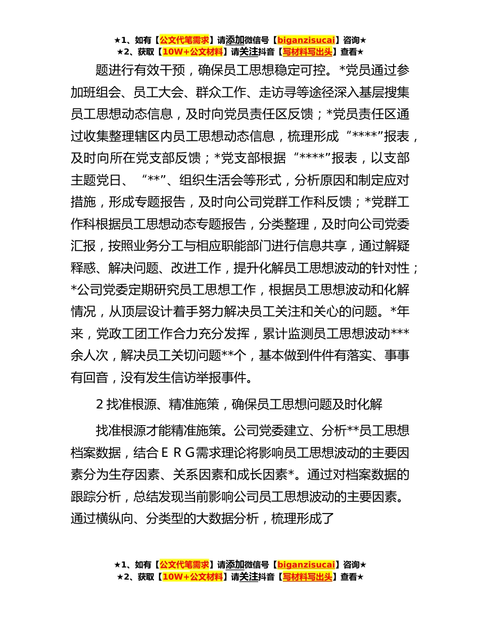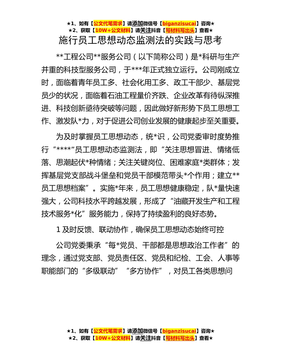 ★1、如有【公文代笔需求】请添加微信号【biganzisucai】咨询★★2、获取【10W+公文材料】请关注抖音【写材料写出头】查看★施行员工思想动态监测法的实践与思考**工程公司**服务公司(以下简称公司)是*科研与生产并重的科技型服务公司,于***年正式独立运行。公司刚成立时,面临着青年员工多、社会化用工多、政工干部少、基层党员少的状况,面临着石油工程量价齐跌、企业改革有待纵深推进、科技创新亟待突破等问题,因此做好新形势下员工思想工作、激发队*力,对于促进公司创业发展的健康起步至关重要。为及时掌握员工思想动态,统*识,公司党委审时度势推行“****”员工思想动态监测法,即“关注思想冒进、情绪低落、思潮起伏*种情绪;关注关键岗位、困难家庭*类群体;发挥基层党支部战斗堡垒和党员干部模范带...