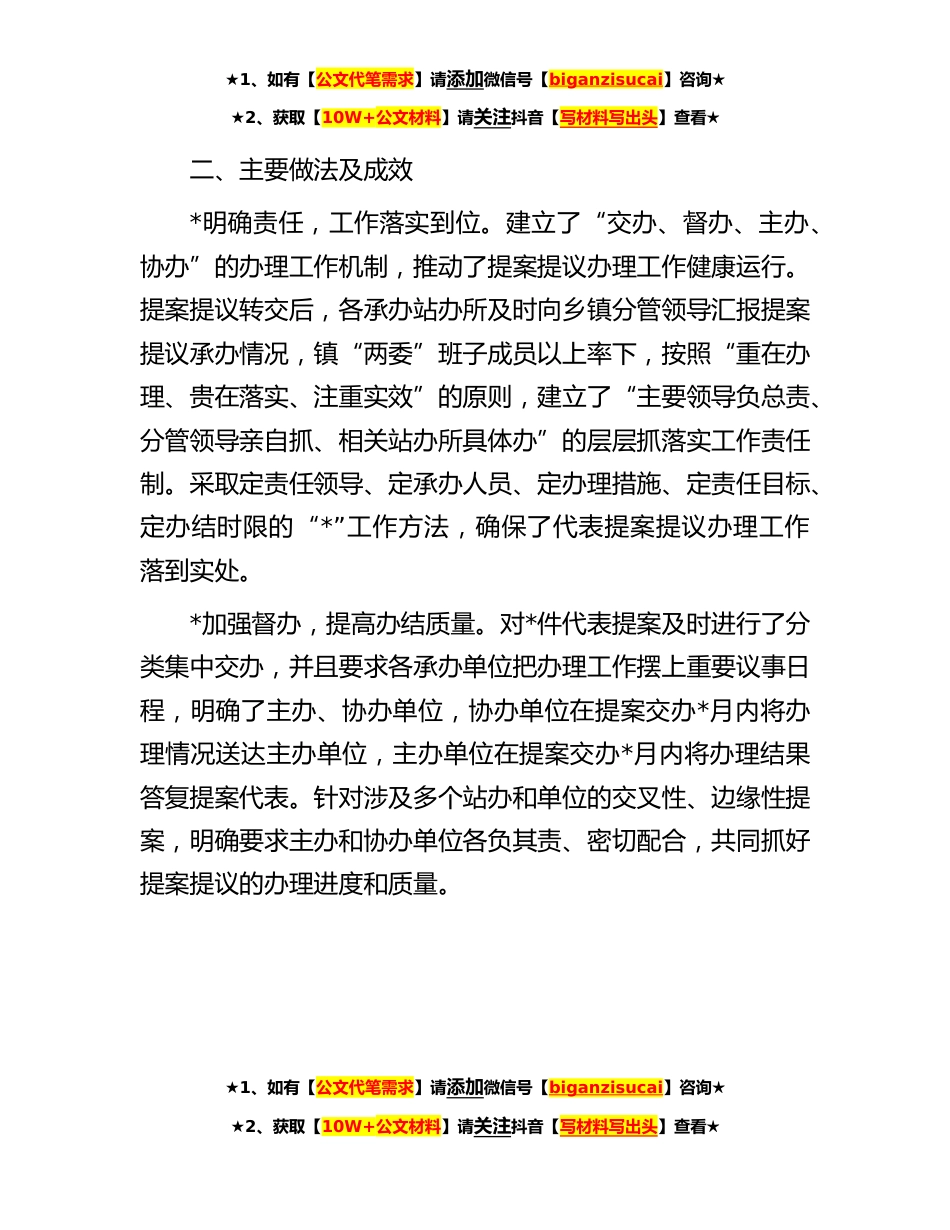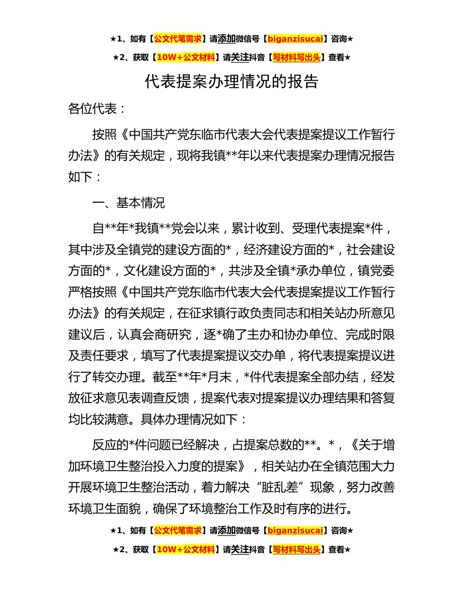★1、如有【公文代笔需求】请添加微信号【biganzisucai】咨询★★2、获取【10W+公文材料】请关注抖音【写材料写出头】查看★代表提案办理情况的报告各位代表:按照《中国共产党东临市代表大会代表提案提议工作暂行办法》的有关规定,现将我镇**年以来代表提案办理情况报告如下:一、基本情况自**年*我镇**党会以来,累计收到、受理代表提案*件,其中涉及全镇党的建设方面的*,经济建设方面的*,社会建设方面的*,文化建设方面的*,共涉及全镇*承办单位,镇党委严格按照《中国共产党东临市代表大会代表提案提议工作暂行办法》的有关规定,在征求镇行政负责同志和相关站办所意见建议后,认真会商研究,逐*确了主办和协办单位、完成时限及责任要求,填写了代表提案提议交办单,将代表提案提议进行了转交办理。截至**...