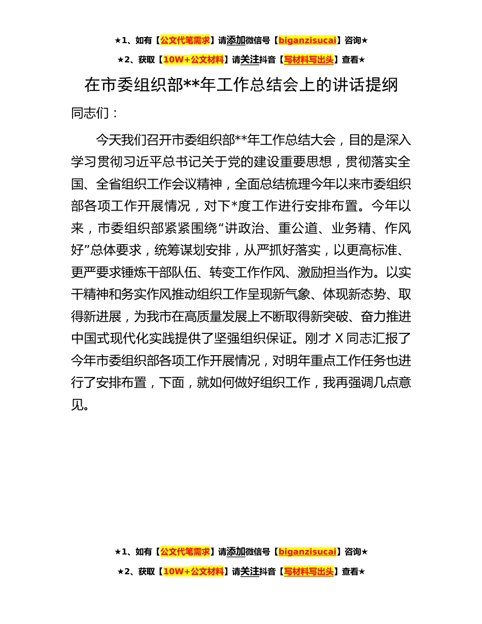 ★1、如有【公文代笔需求】请添加微信号【biganzisucai】咨询★★2、获取【10W+公文材料】请关注抖音【写材料写出头】查看★在市委组织部**年工作总结会上的讲话提纲同志们:今天我们召开市委组织部**年工作总结大会,目的是深入学习贯彻习近平总书记关于党的建设重要思想,贯彻落实全国、全省组织工作会议精神,全面总结梳理今年以来市委组织部各项工作开展情况,对下*度工作进行安排布置。今年以“来,市委组织部紧紧围绕讲政治、重公道、业务精、作风”好总体要求,统筹谋划安排,从严抓好落实,以更高标准、更严要求锤炼干部队伍、转变工作作风、激励担当作为。以实干精神和务实作风推动组织工作呈现新气象、体现新态势、取得新进展,为我市在高质量发展上不断取得新突破、奋力推进中国式现代化实践提供了坚强...