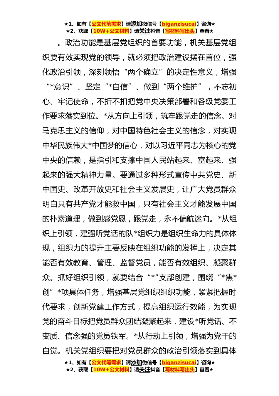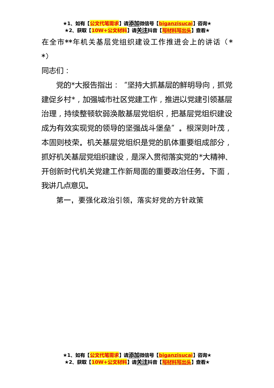 ★1、如有【公文代笔需求】请添加微信号【biganzisucai】咨询★★2、获取【10W+公文材料】请关注抖音【写材料写出头】查看★在全市**年机关基层党组织建设工作推进会上的讲话(**)同志们:党的*大报告指出:“坚持大抓基层的鲜明导向,抓党建促乡村*,加强城市社区党建工作,推进以党建引领基层治理,持续整顿软弱涣散基层党组织,把基层党组织建设成为有效实现党的领导的坚强战斗堡垒”。根深则叶茂,本固则枝荣。机关基层党组织是党的肌体重要组成部分,抓好机关基层党组织建设,是深入贯彻落实党的*大精神、开创新时代机关党建工作新局面的重要政治任务。下面,我讲几点意见。第一,要强化政治引领,落实好党的方针政策★1、如有【公文代笔需求】请添加微信号【biganzisucai】咨询★★2、获取【10W+公文材料】...