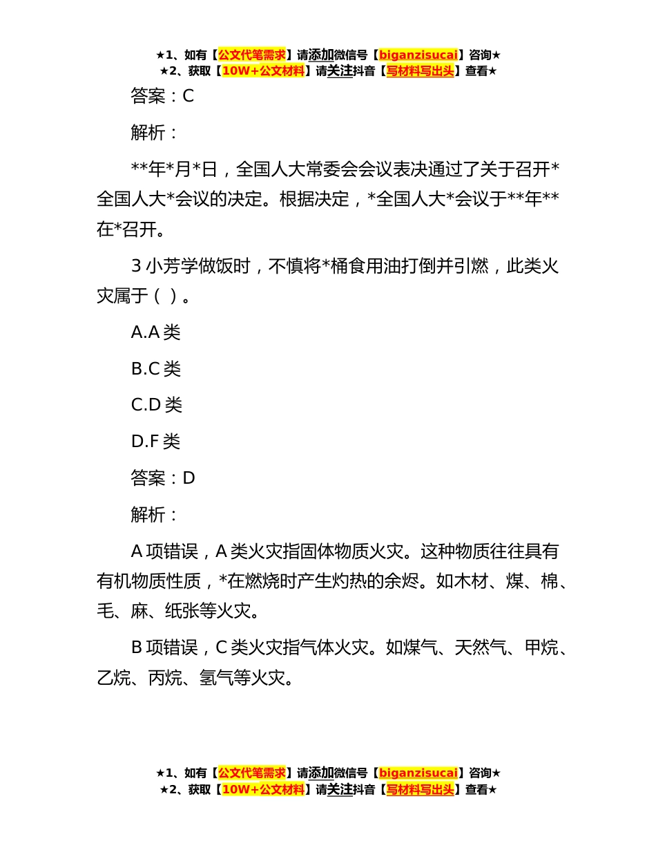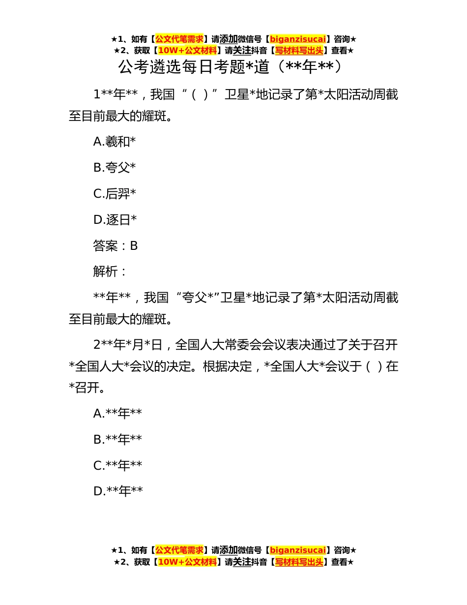 ★1、如有【公文代笔需求】请添加微信号【biganzisucai】咨询★★2、获取【10W+公文材料】请关注抖音【写材料写出头】查看★公考遴选每日考题*道(**年**)1**年**,我国“()”卫星*地记录了第*太阳活动周截至目前最大的耀斑。A.羲和*B.夸父*C.后羿*D.逐日*答案:B解析:**年**,我国“夸父*”卫星*地记录了第*太阳活动周截至目前最大的耀斑。2**年*月*日,全国人大常委会会议表决通过了关于召开*全国人大*会议的决定。根据决定,*全国人大*会议于()在*召开。A.**年**B.**年**C.**年**D.**年**★1、如有【公文代笔需求】请添加微信号【biganzisucai】咨询★★2、获取【10W+公文材料】请关注抖音【写材料写出头】查看★★1、如有【公文代笔需求】请添加微信号【biganzisucai】咨询★★2、获取【10W+公文材料】...