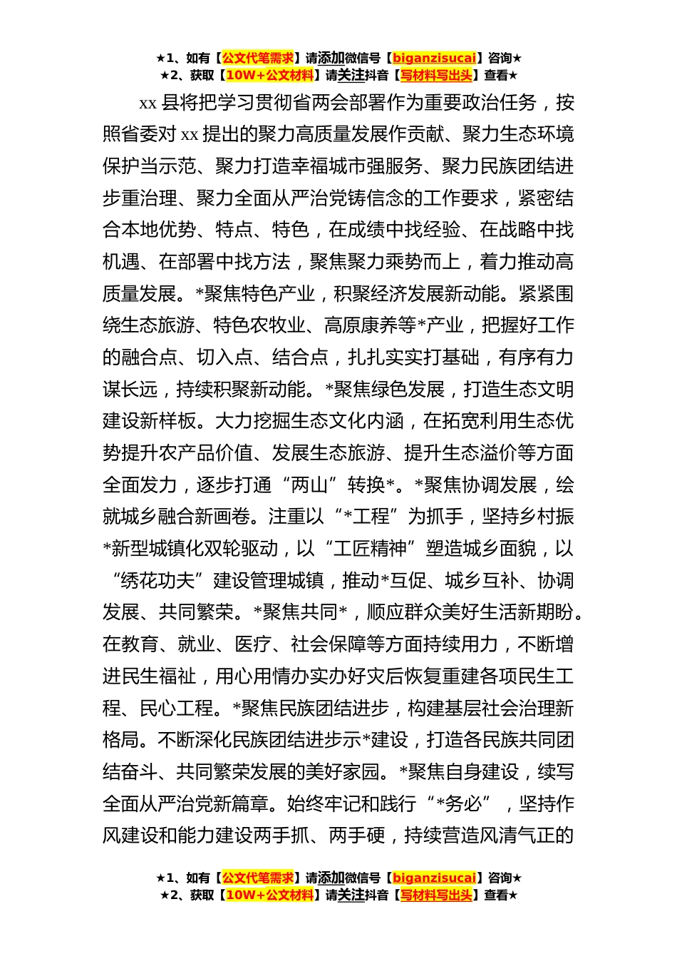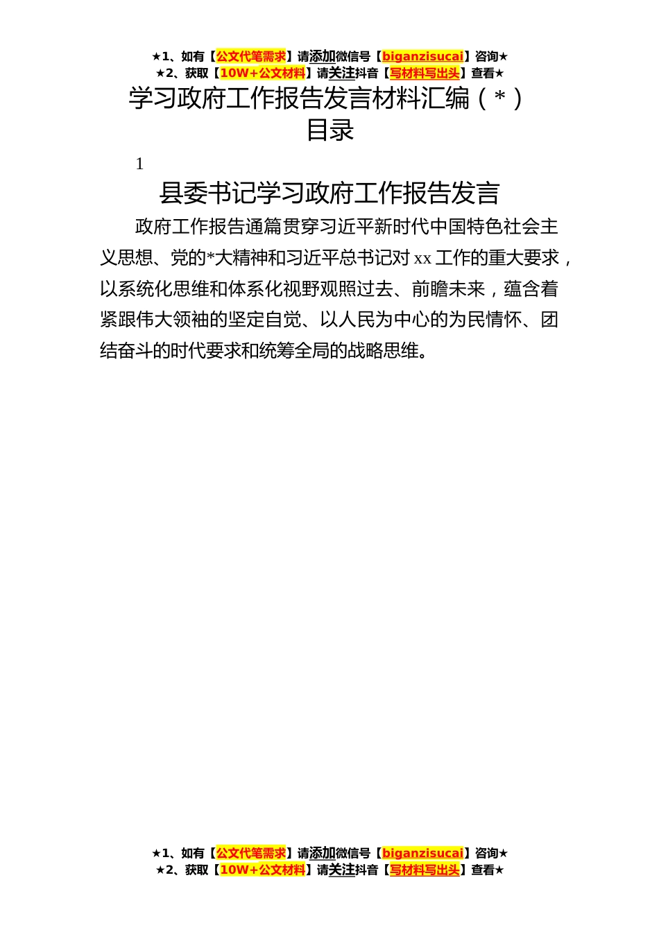 ★1、如有【公文代笔需求】请添加微信号【biganzisucai】咨询★★2、获取【10W+公文材料】请关注抖音【写材料写出头】查看★学习政府工作报告发言材料汇编(*)目录1县委书记学习政府工作报告发言政府工作报告通篇贯穿习近平新时代中国特色社会主义思想、党的*大精神和习近平总书记对xx工作的重大要求,以系统化思维和体系化视野观照过去、前瞻未来,蕴含着紧跟伟大领袖的坚定自觉、以人民为中心的为民情怀、团结奋斗的时代要求和统筹全局的战略思维。★1、如有【公文代笔需求】请添加微信号【biganzisucai】咨询★★2、获取【10W+公文材料】请关注抖音【写材料写出头】查看★★1、如有【公文代笔需求】请添加微信号【biganzisucai】咨询★★2、获取【10W+公文材料】请关注抖音【写材料写出头】查看★xx县将把学习...