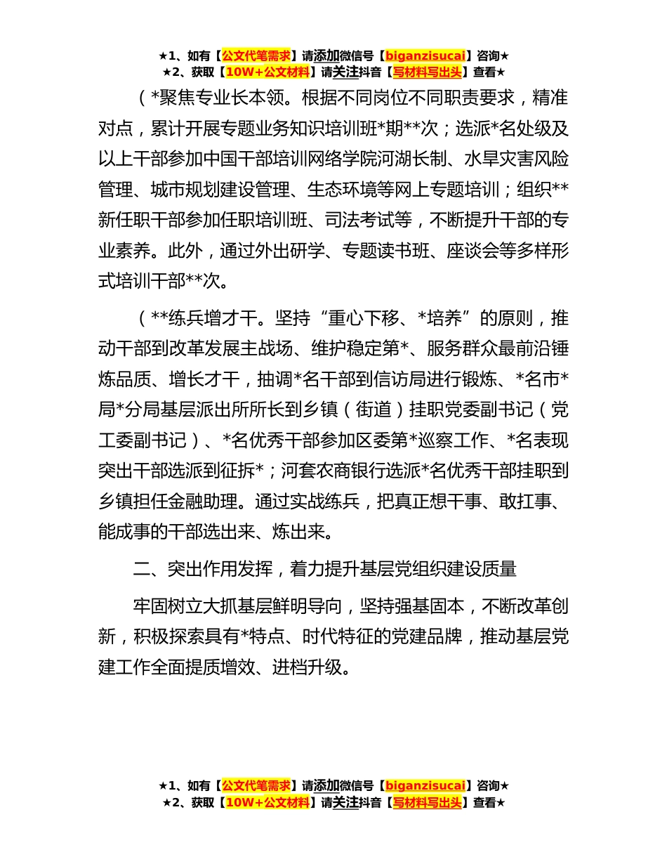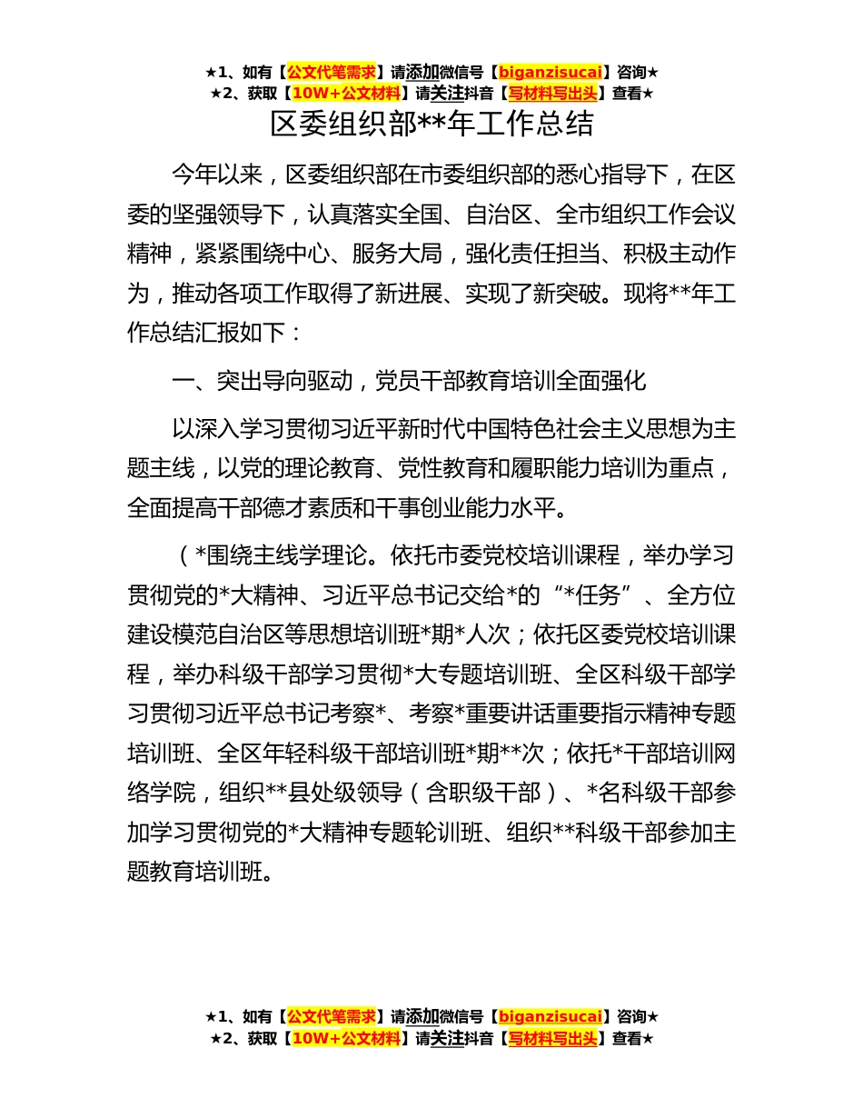 ★1、如有【公文代笔需求】请添加微信号【biganzisucai】咨询★★2、获取【10W+公文材料】请关注抖音【写材料写出头】查看★区委组织部**年工作总结今年以来,区委组织部在市委组织部的悉心指导下,在区委的坚强领导下,认真落实全国、自治区、全市组织工作会议精神,紧紧围绕中心、服务大局,强化责任担当、积极主动作为,推动各项工作取得了新进展、实现了新突破。现将**年工作总结汇报如下:一、突出导向驱动,党员干部教育培训全面强化以深入学习贯彻习近平新时代中国特色社会主义思想为主题主线,以党的理论教育、党性教育和履职能力培训为重点,全面提高干部德才素质和干事创业能力水平。(*围绕主线学理论。依托市委党校培训课程,举办学习贯彻党的*大精神、习近平总书记交给*的“*任务”、全方位建设模范...