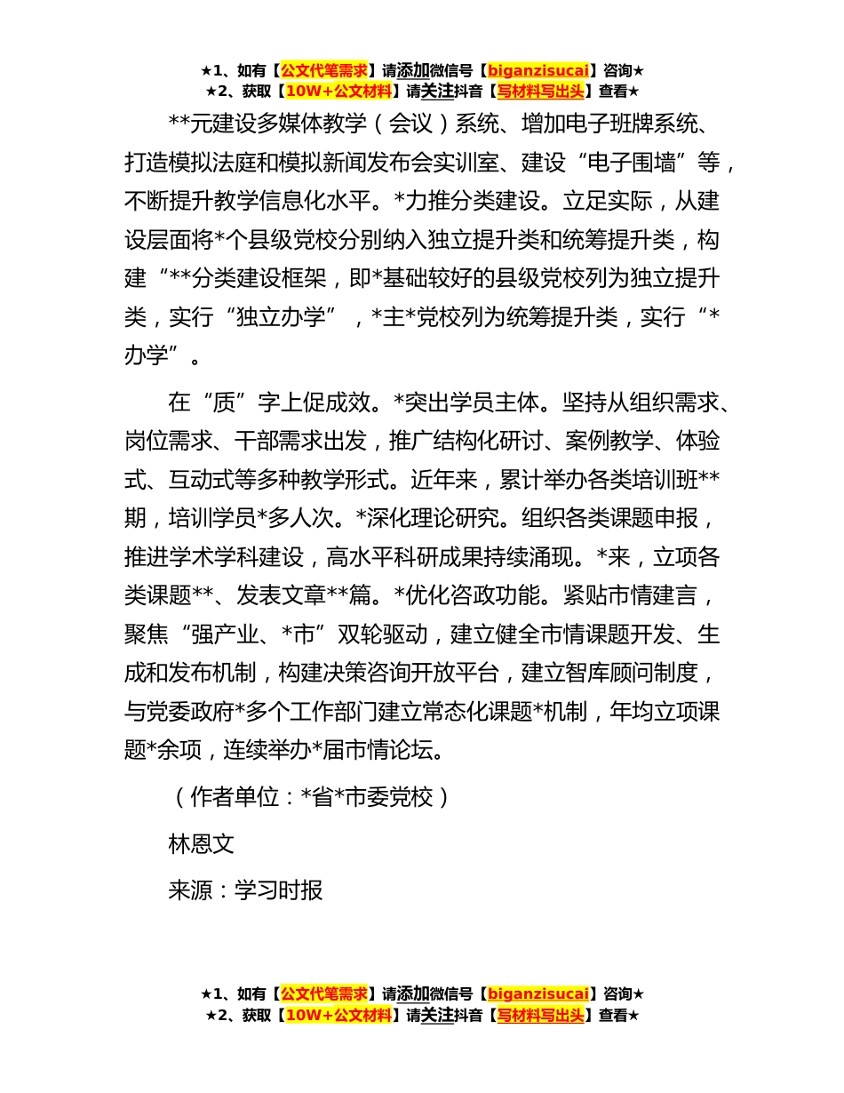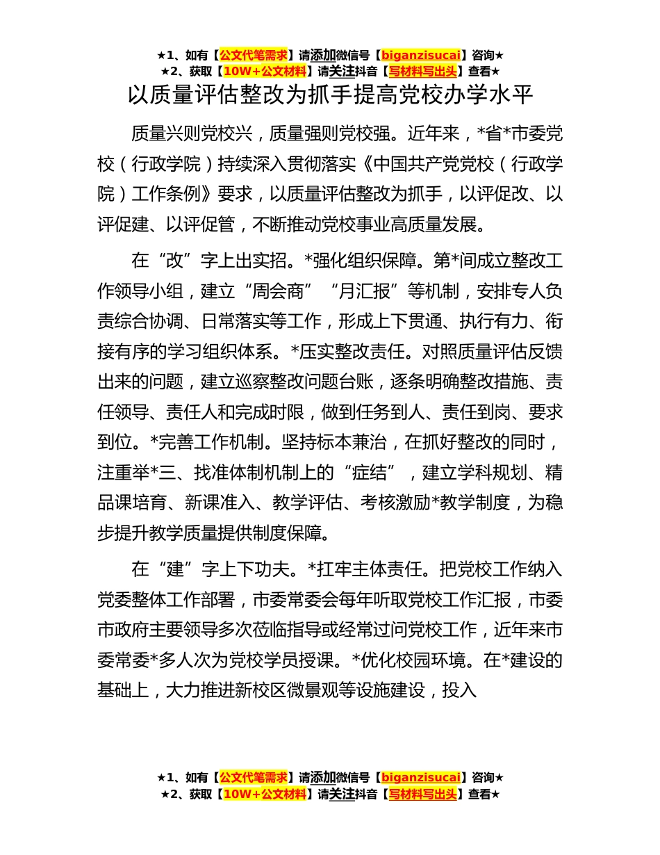 ★1、如有【公文代笔需求】请添加微信号【biganzisucai】咨询★★2、获取【10W+公文材料】请关注抖音【写材料写出头】查看★以质量评估整改为抓手提高党校办学水平质量兴则党校兴,质量强则党校强。近年来,*省*市委党校(行政学院)持续深入贯彻落实《中国共产党党校(行政学院)工作条例》要求,以质量评估整改为抓手,以评促改、以评促建、以评促管,不断推动党校事业高质量发展。在“改”字上出实招。*强化组织保障。第*间成立整改工作领导小组,建立“周会商”“月汇报”等机制,安排专人负责综合协调、日常落实等工作,形成上下贯通、执行有力、衔接有序的学习组织体系。*压实整改责任。对照质量评估反馈出来的问题,建立巡察整改问题台账,逐条明确整改措施、责任领导、责任人和完成时限,做到任务到人、责...