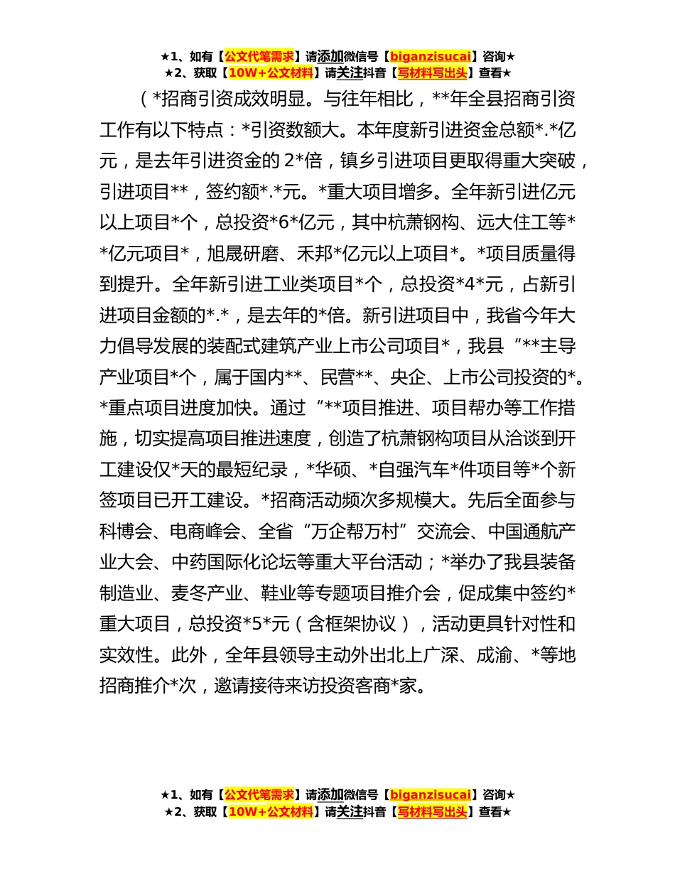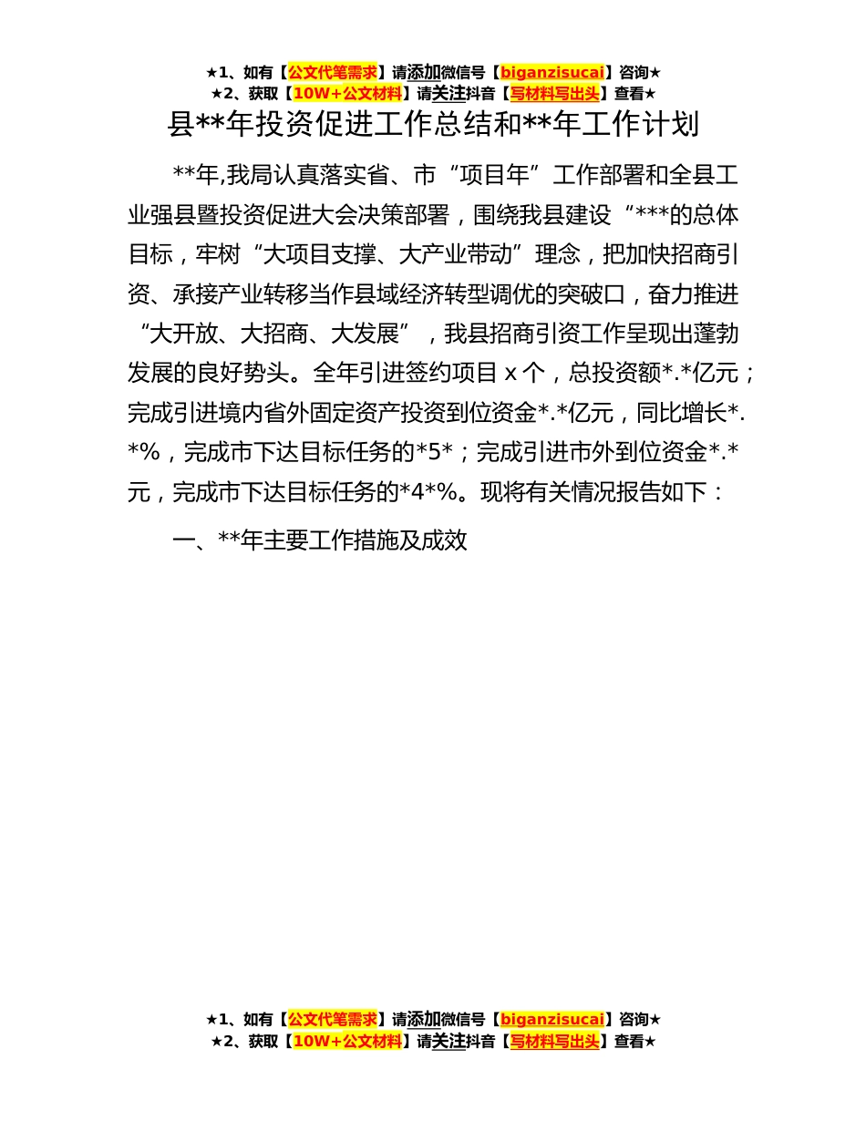 ★1、如有【公文代笔需求】请添加微信号【biganzisucai】咨询★★2、获取【10W+公文材料】请关注抖音【写材料写出头】查看★县**年投资促进工作总结和**年工作计划**年,我局认真落实省、市“项目年”工作部署和全县工业强县暨投资促进大会决策部署,围绕我县建设“***的总体目标,牢树“大项目支撑、大产业带动”理念,把加快招商引资、承接产业转移当作县域经济转型调优的突破口,奋力推进“大开放、大招商、大发展”,我县招商引资工作呈现出蓬勃发展的良好势头。全年引进签约项目x个,总投资额*.*亿元;完成引进境内省外固定资产投资到位资金*.*亿元,同比增长*.*%,完成市下达目标任务的*5*;完成引进市外到位资金*.*元,完成市下达目标任务的*4*%。现将有关情况报告如下:一、**年主要工作措施及成效★1、如...