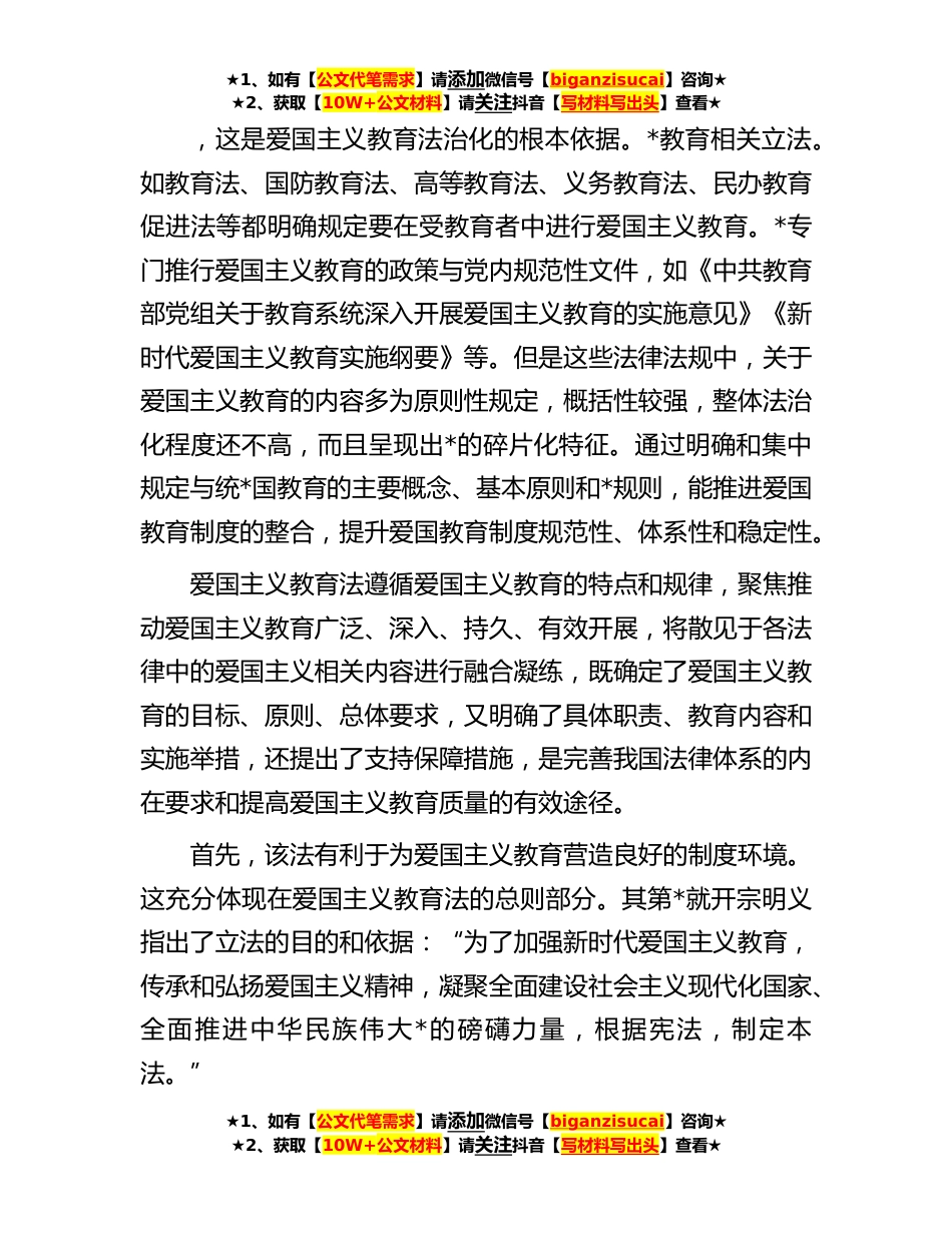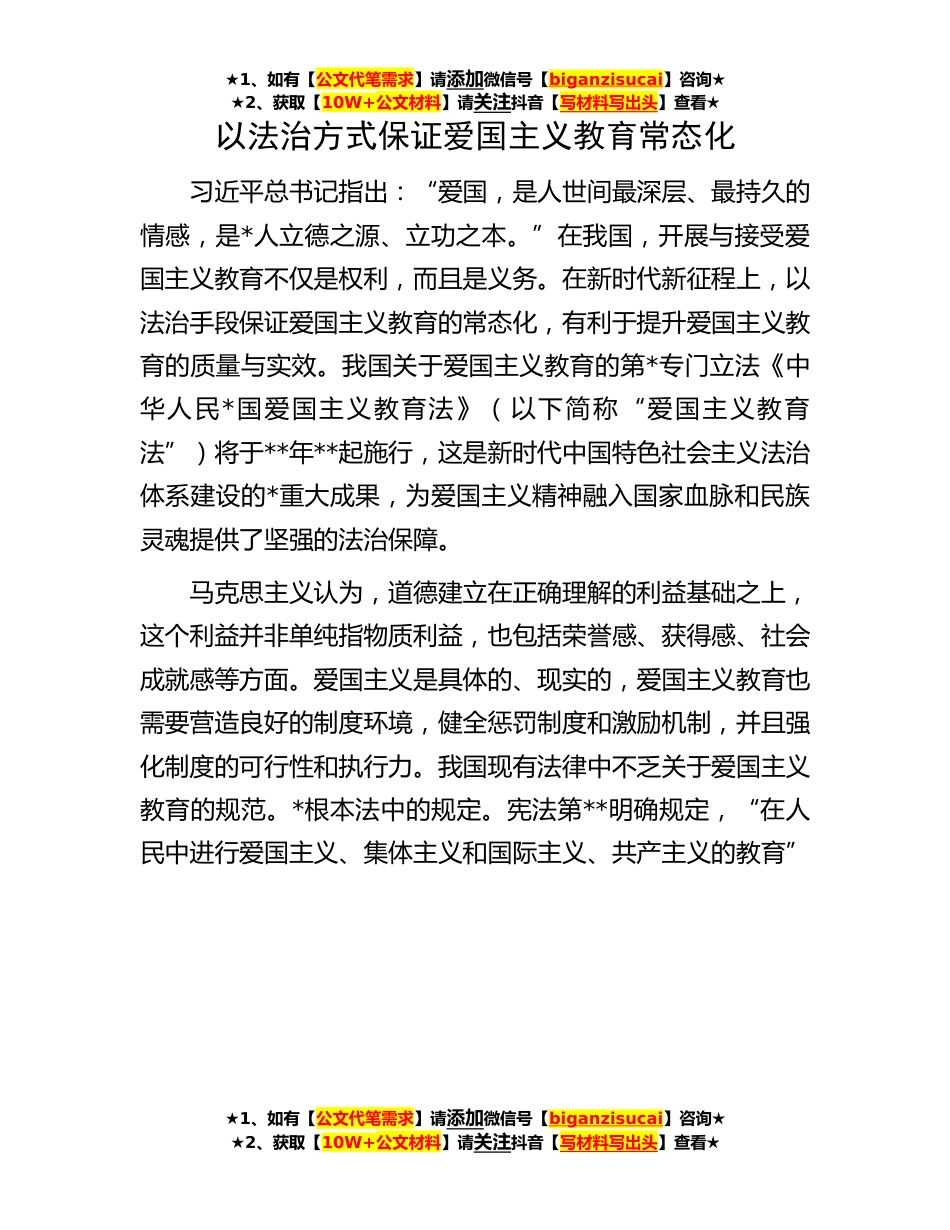 ★1、如有【公文代笔需求】请添加微信号【biganzisucai】咨询★★2、获取【10W+公文材料】请关注抖音【写材料写出头】查看★以法治方式保证爱国主义教育常态化习近平总书记指出:“爱国,是人世间最深层、最持久的情感,是*人立德之源、立功之本。”在我国,开展与接受爱国主义教育不仅是权利,而且是义务。在新时代新征程上,以法治手段保证爱国主义教育的常态化,有利于提升爱国主义教育的质量与实效。我国关于爱国主义教育的第*专门立法《中华人民*国爱国主义教育法》(以下简称“爱国主义教育法”)将于**年**起施行,这是新时代中国特色社会主义法治体系建设的*重大成果,为爱国主义精神融入国家血脉和民族灵魂提供了坚强的法治保障。马克思主义认为,道德建立在正确理解的利益基础之上,这个利益并非单纯指...