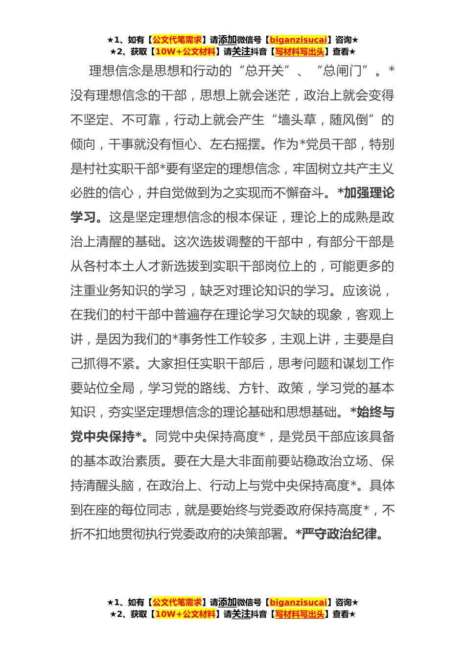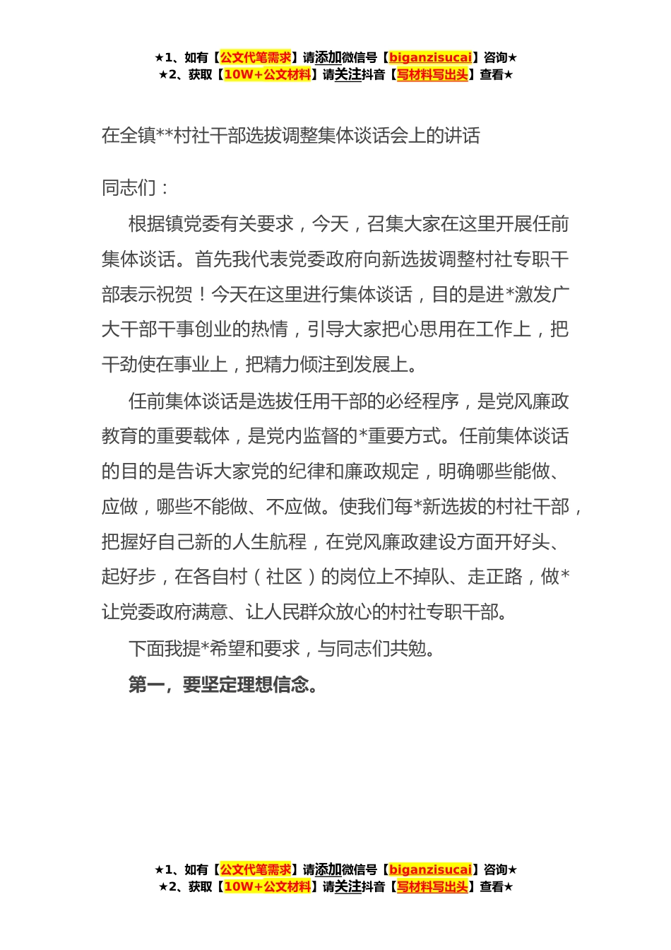 ★1、如有【公文代笔需求】请添加微信号【biganzisucai】咨询★★2、获取【10W+公文材料】请关注抖音【写材料写出头】查看★在全镇**村社干部选拔调整集体谈话会上的讲话同志们:根据镇党委有关要求,今天,召集大家在这里开展任前集体谈话。首先我代表党委政府向新选拔调整村社专职干部表示祝贺!今天在这里进行集体谈话,目的是进*激发广大干部干事创业的热情,引导大家把心思用在工作上,把干劲使在事业上,把精力倾注到发展上。任前集体谈话是选拔任用干部的必经程序,是党风廉政教育的重要载体,是党内监督的*重要方式。任前集体谈话的目的是告诉大家党的纪律和廉政规定,明确哪些能做、应做,哪些不能做、不应做。使我们每*新选拔的村社干部,把握好自己新的人生航程,在党风廉政建设方面开好头、起好步,在...