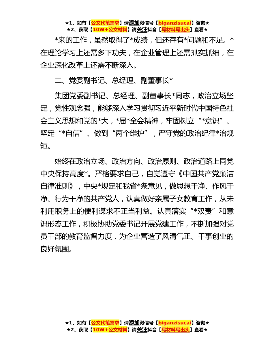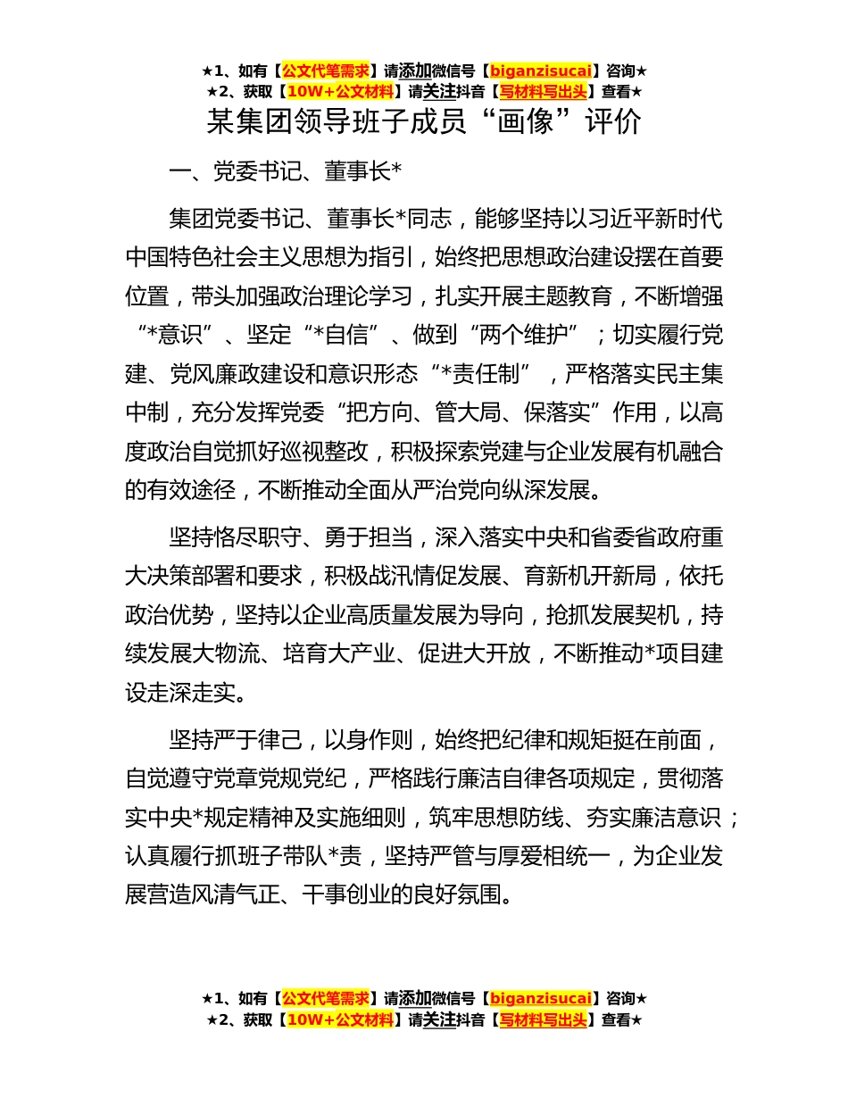 ★1、如有【公文代笔需求】请添加微信号【biganzisucai】咨询★★2、获取【10W+公文材料】请关注抖音【写材料写出头】查看★某集团领导班子成员“画像”评价一、党委书记、董事长*集团党委书记、董事长*同志,能够坚持以习近平新时代中国特色社会主义思想为指引,始终把思想政治建设摆在首要位置,带头加强政治理论学习,扎实开展主题教育,不断增强“*意识”、坚定“*自信”、做到“两个维护”;切实履行党建、党风廉政建设和意识形态“*责任制”,严格落实民主集中制,充分发挥党委“把方向、管大局、保落实”作用,以高度政治自觉抓好巡视整改,积极探索党建与企业发展有机融合的有效途径,不断推动全面从严治党向纵深发展。坚持恪尽职守、勇于担当,深入落实中央和省委省政府重大决策部署和要求,积极战汛情促...