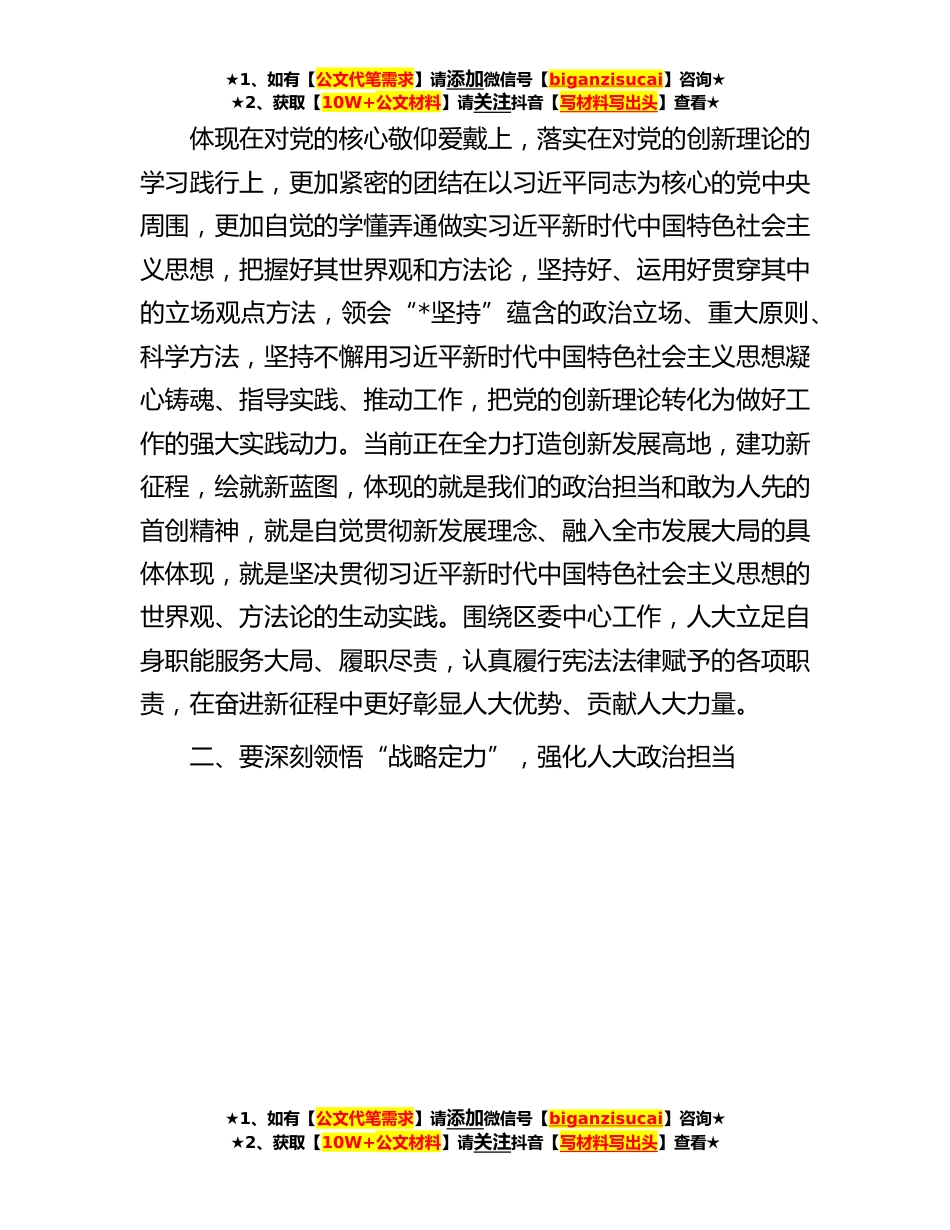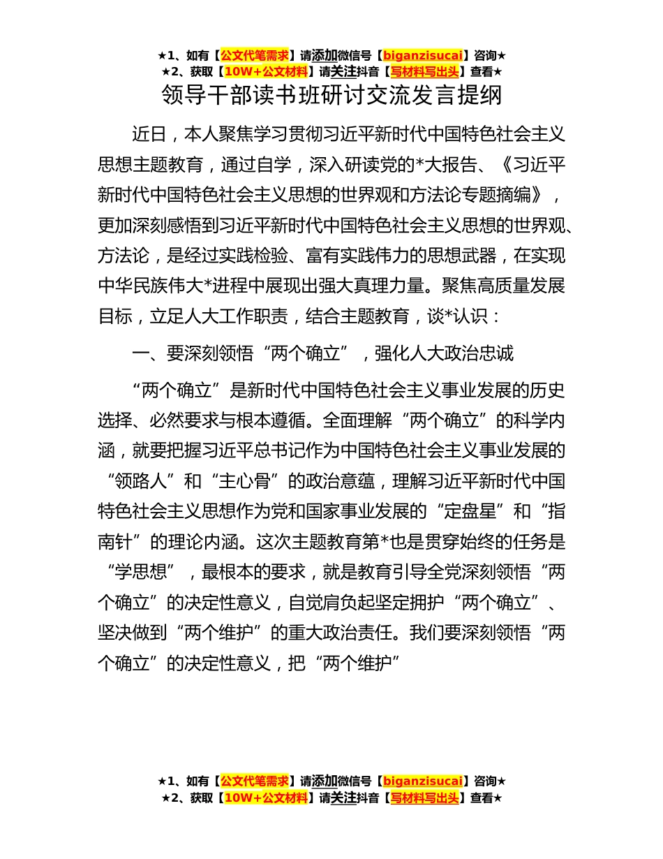 ★1、如有【公文代笔需求】请添加微信号【biganzisucai】咨询★★2、获取【10W+公文材料】请关注抖音【写材料写出头】查看★领导干部读书班研讨交流发言提纲近日,本人聚焦学习贯彻习近平新时代中国特色社会主义思想主题教育,通过自学,深入研读党的*大报告、《习近平新时代中国特色社会主义思想的世界观和方法论专题摘编》,更加深刻感悟到习近平新时代中国特色社会主义思想的世界观、方法论,是经过实践检验、富有实践伟力的思想武器,在实现中华民族伟大*进程中展现出强大真理力量。聚焦高质量发展目标,立足人大工作职责,结合主题教育,谈*认识:一、要深刻领悟“两个确立”,强化人大政治忠诚“两个确立”是新时代中国特色社会主义事业发展的历史选择、必然要求与根本遵循。全面理解“两个确立”的科学内涵...