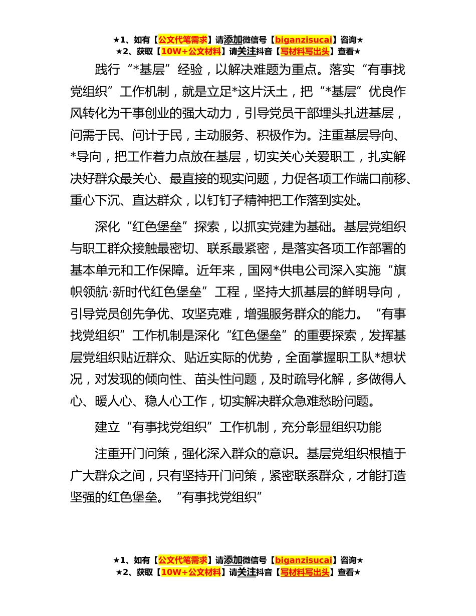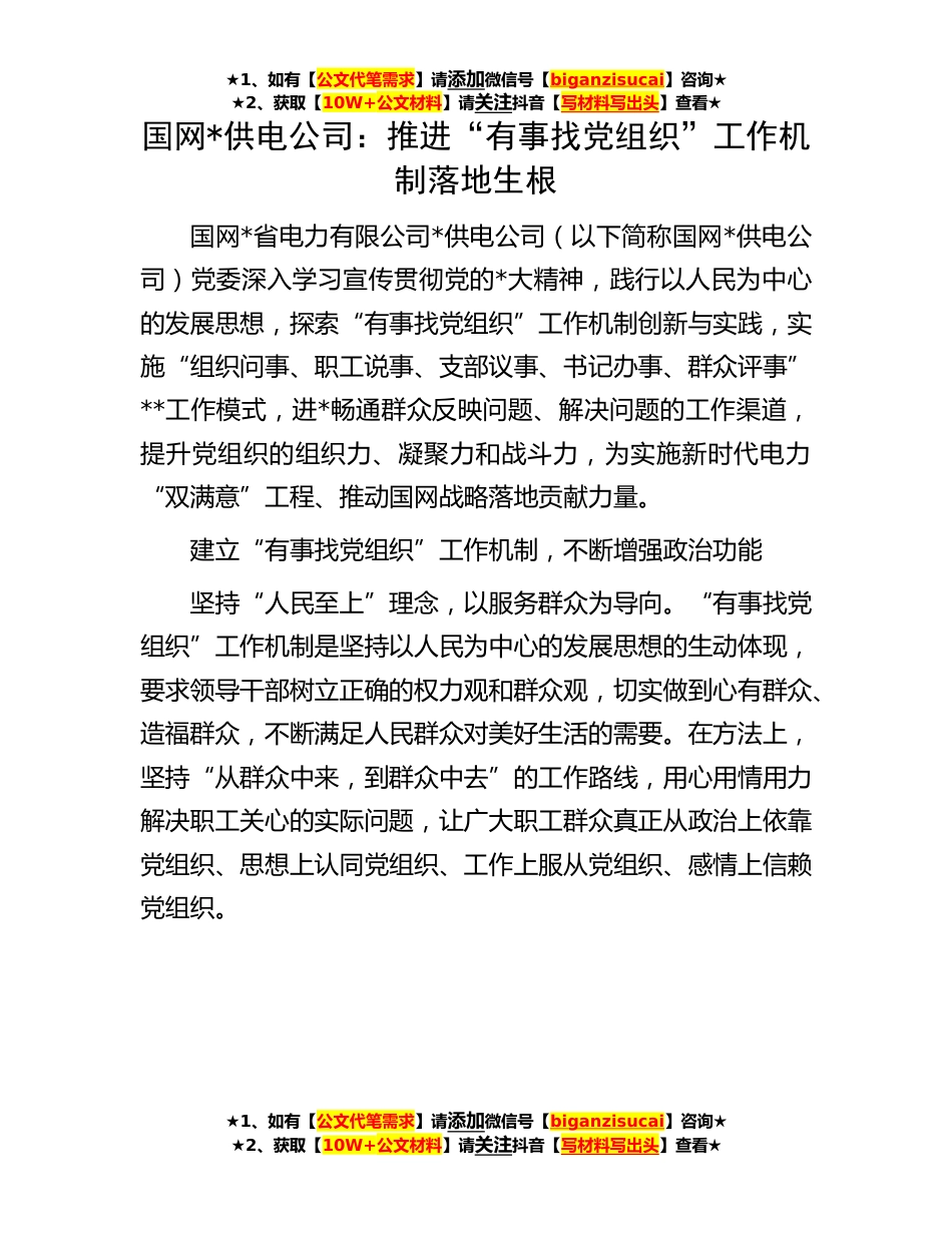 ★1、如有【公文代笔需求】请添加微信号【biganzisucai】咨询★★2、获取【10W+公文材料】请关注抖音【写材料写出头】查看★国网*供电公司:推进“有事找党组织”工作机制落地生根国网*省电力有限公司*供电公司(以下简称国网*供电公司)党委深入学习宣传贯彻党的*大精神,践行以人民为中心的发展思想,探索“有事找党组织”工作机制创新与实践,实施“组织问事、职工说事、支部议事、书记办事、群众评事”**工作模式,进*畅通群众反映问题、解决问题的工作渠道,提升党组织的组织力、凝聚力和战斗力,为实施新时代电力“双满意”工程、推动国网战略落地贡献力量。建立“有事找党组织”工作机制,不断增强政治功能坚持“人民至上”理念,以服务群众为导向。“有事找党组织”工作机制是坚持以人民为中心的发展思想...