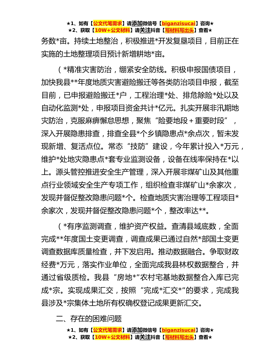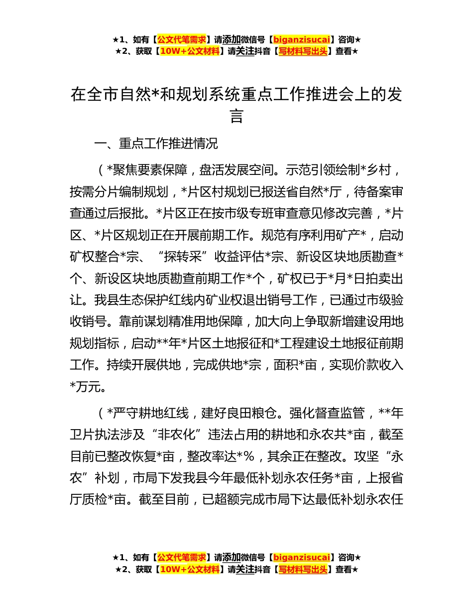 ★1、如有【公文代笔需求】请添加微信号【biganzisucai】咨询★★2、获取【10W+公文材料】请关注抖音【写材料写出头】查看★在全市自然*和规划系统重点工作推进会上的发言一、重点工作推进情况(*聚焦要素保障,盘活发展空间。示范引领绘制*乡村,按需分片编制规划,*片区村规划已报送省自然*厅,待备案审查通过后报批。*片区正在按市级专班审查意见修改完善,*片区、*片区规划正在开展前期工作。规范有序利用矿产*,启动矿权整合*宗、“探转采”收益评估*宗、新设区块地质勘查*个、新设区块地质勘查前期工作*个,矿权已于*月*日拍卖出让。我县生态保护红线内矿业权退出销号工作,已通过市级验收销号。靠前谋划精准用地保障,加大向上争取新增建设用地规划指标,启动**年*片区土地报征和*工程建设土地报征前期工作...
