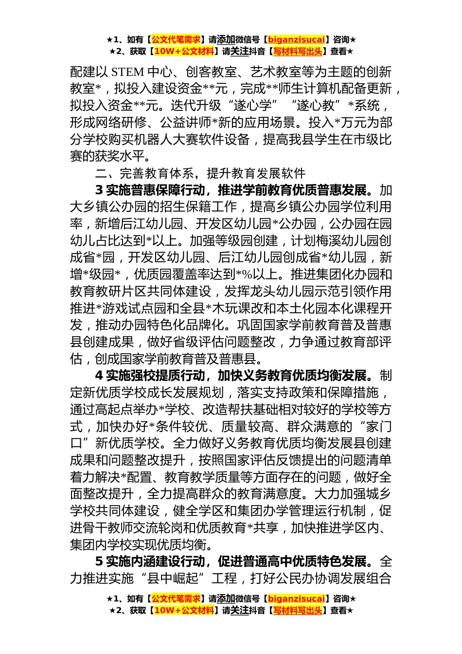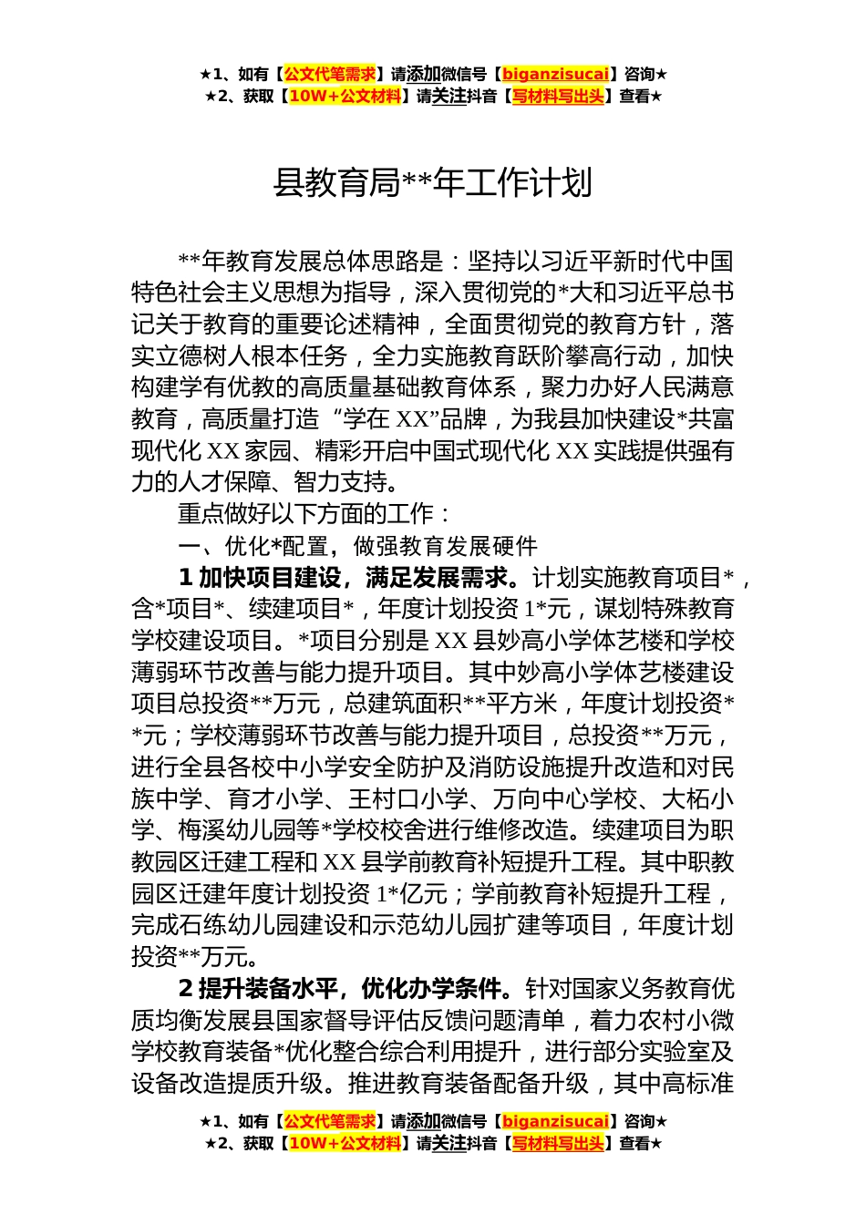 ★1、如有【公文代笔需求】请添加微信号【biganzisucai】咨询★★2、获取【10W+公文材料】请关注抖音【写材料写出头】查看★县教育局**年工作计划**年教育发展总体思路是:坚持以习近平新时代中国特色社会主义思想为指导,深入贯彻党的*大和习近平总书记关于教育的重要论述精神,全面贯彻党的教育方针,落实立德树人根本任务,全力实施教育跃阶攀高行动,加快构建学有优教的高质量基础教育体系,聚力办好人民满意教育,高质量打造“学在XX”品牌,为我县加快建设*共富现代化XX家园、精彩开启中国式现代化XX实践提供强有力的人才保障、智力支持。重点做好以下方面的工作:一、优化*配置,做强教育发展硬件1加快项目建设,满足发展需求。计划实施教育项目*,含*项目*、续建项目*,年度计划投资1*元,谋划特殊教育学...
