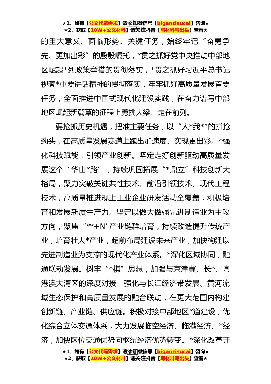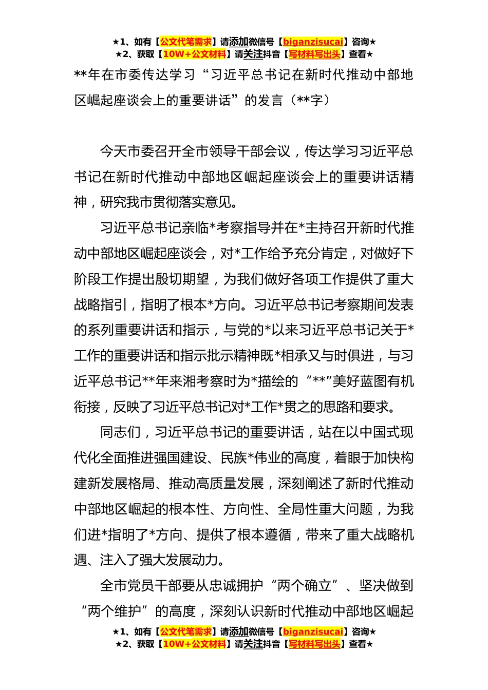 ★1、如有【公文代笔需求】请添加微信号【biganzisucai】咨询★★2、获取【10W+公文材料】请关注抖音【写材料写出头】查看★**年在市委传达学习“习近平总书记在新时代推动中部地区崛起座谈会上的重要讲话”的发言(**字)今天市委召开全市领导干部会议,传达学习习近平总书记在新时代推动中部地区崛起座谈会上的重要讲话精神,研究我市贯彻落实意见。习近平总书记亲临*考察指导并在*主持召开新时代推动中部地区崛起座谈会,对*工作给予充分肯定,对做好下阶段工作提出殷切期望,为我们做好各项工作提供了重大战略指引,指明了根本*方向。习近平总书记考察期间发表的系列重要讲话和指示,与党的*以来习近平总书记关于*工作的重要讲话和指示批示精神既*相承又与时俱进,与习近平总书记**年来湘考察时为*描绘的“**...