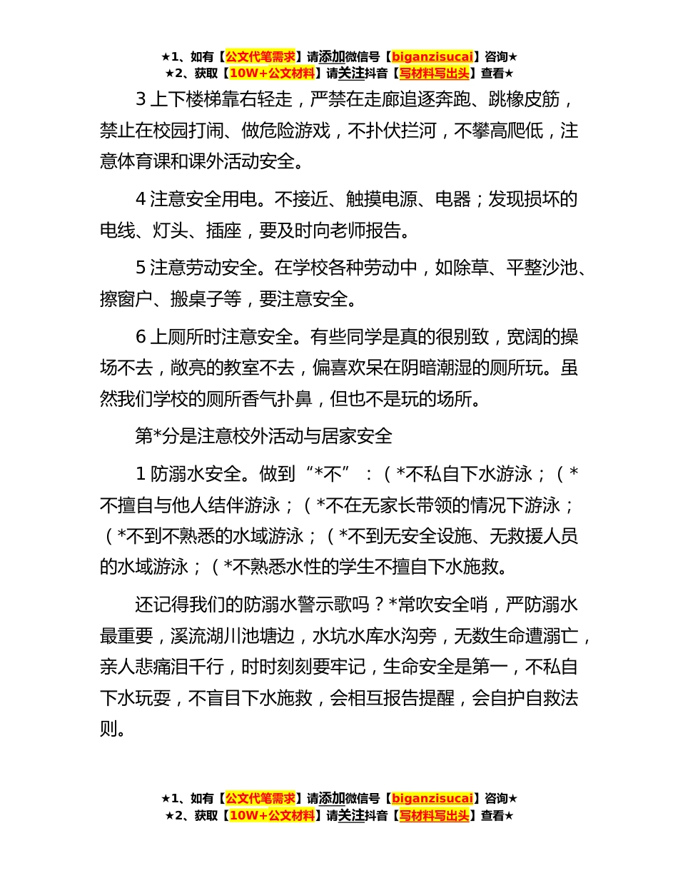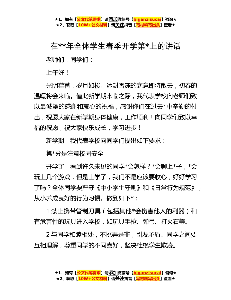 ★1、如有【公文代笔需求】请添加微信号【biganzisucai】咨询★★2、获取【10W+公文材料】请关注抖音【写材料写出头】查看★在**年全体学生春季开学第*上的讲话老师们,同学们:上午好!光阴荏苒,岁月如梭。冰封雪冻的寒意即将散去,初春的温暖将会来临。值此新学期来临之际,我代表学校向老师们致以最诚挚的感谢和衷心的祝福,感谢你们在过去*中辛勤的付出,祝愿大家在新学期身体健康,工作顺利!向同学们致以幸福的祝愿,祝大家快乐成长,学习进步!新学期,我代表学校向同学们提出如下要求:第*分是注意校园安全开学了,看到许久未见的同学*会怎样?*会聊上*子,*会玩上几个游戏,但是上学了,我们不是应该要收心,好好学习了吗?全体同学要严守《中小学生守则》和《日常行为规范》,从小养成良好的行为习惯。...