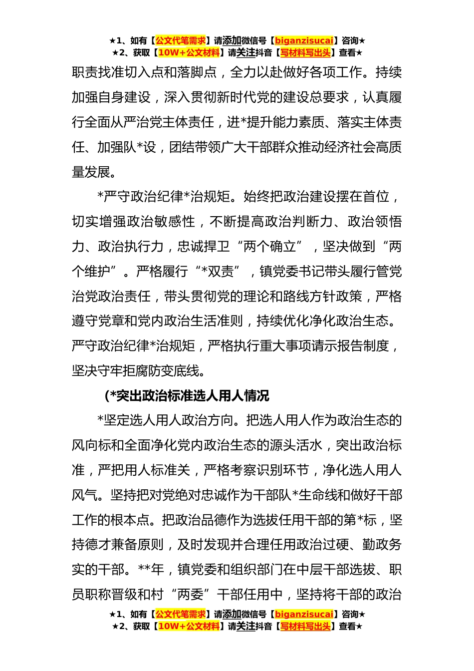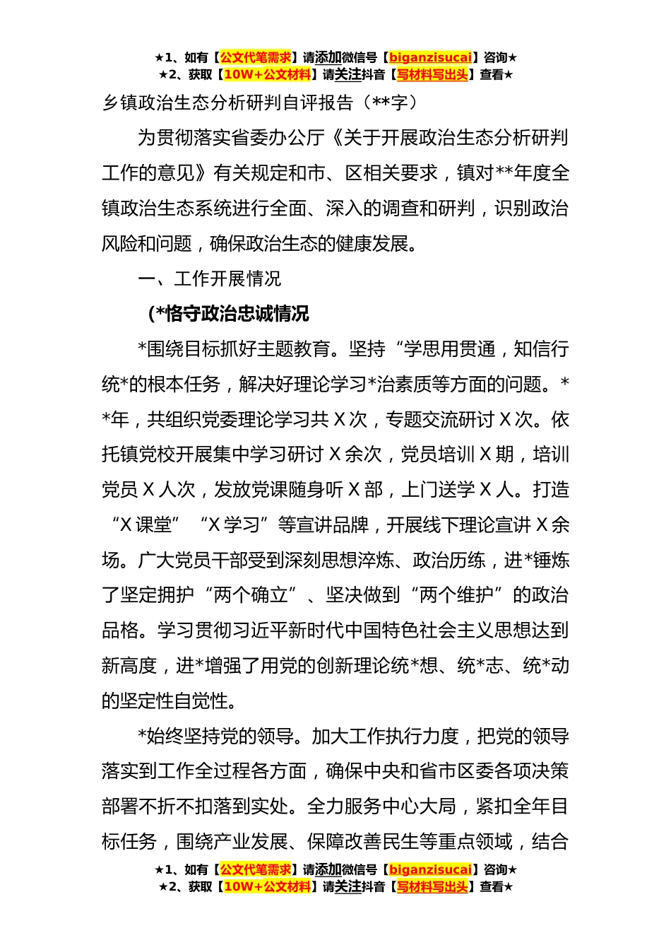 ★1、如有【公文代笔需求】请添加微信号【biganzisucai】咨询★★2、获取【10W+公文材料】请关注抖音【写材料写出头】查看★乡镇政治生态分析研判自评报告(**字)为贯彻落实省委办公厅《关于开展政治生态分析研判工作的意见》有关规定和市、区相关要求,镇对**年度全镇政治生态系统进行全面、深入的调查和研判,识别政治风险和问题,确保政治生态的健康发展。一、工作开展情况(*恪守政治忠诚情况*围绕目标抓好主题教育。坚持“学思用贯通,知信行统*的根本任务,解决好理论学习*治素质等方面的问题。**年,共组织党委理论学习共X次,专题交流研讨X次。依托镇党校开展集中学习研讨X余次,党员培训X期,培训党员X人次,发放党课随身听X部,上门送学X人。打造“X课堂”“X学习”等宣讲品牌,开展线下理论宣讲X余场...