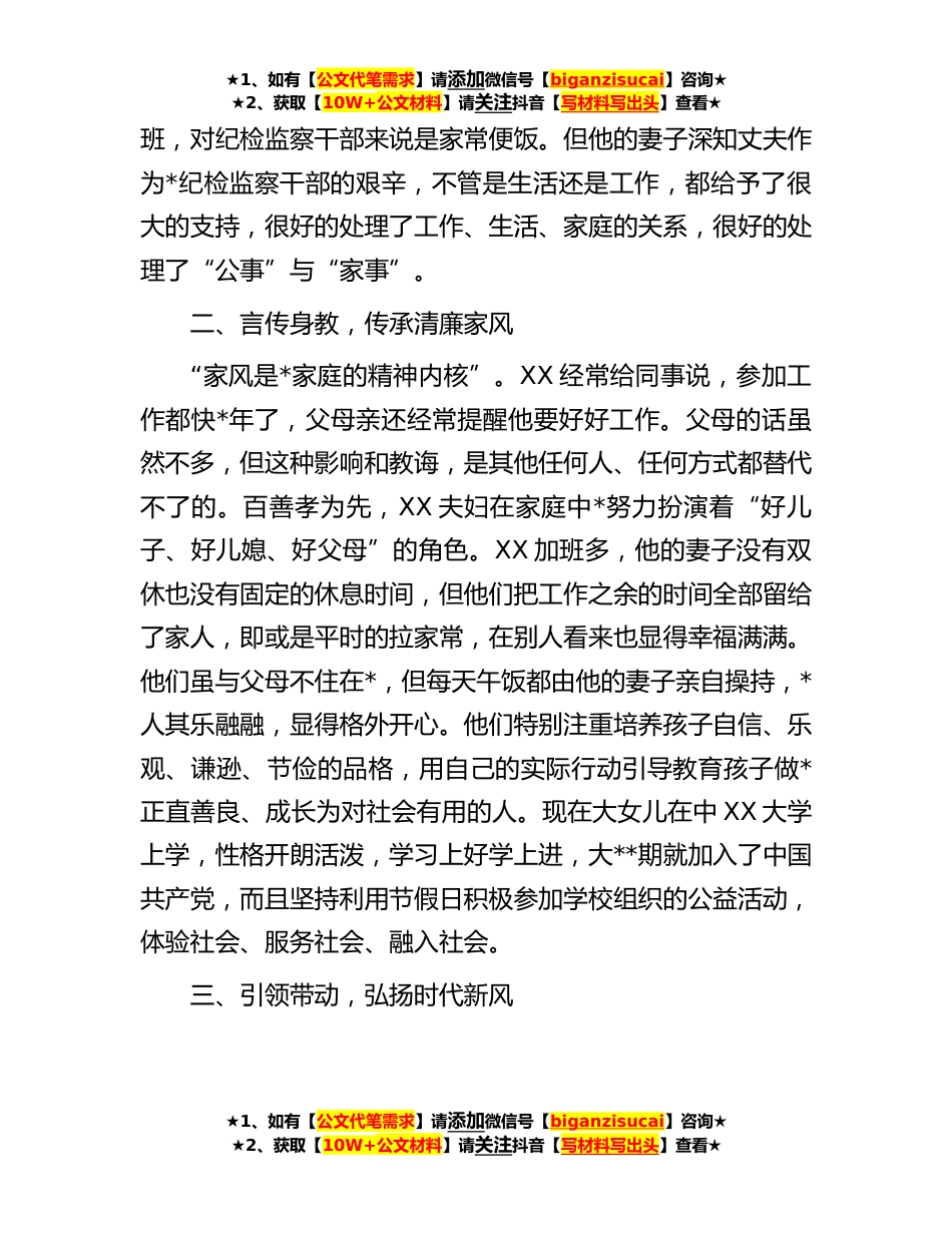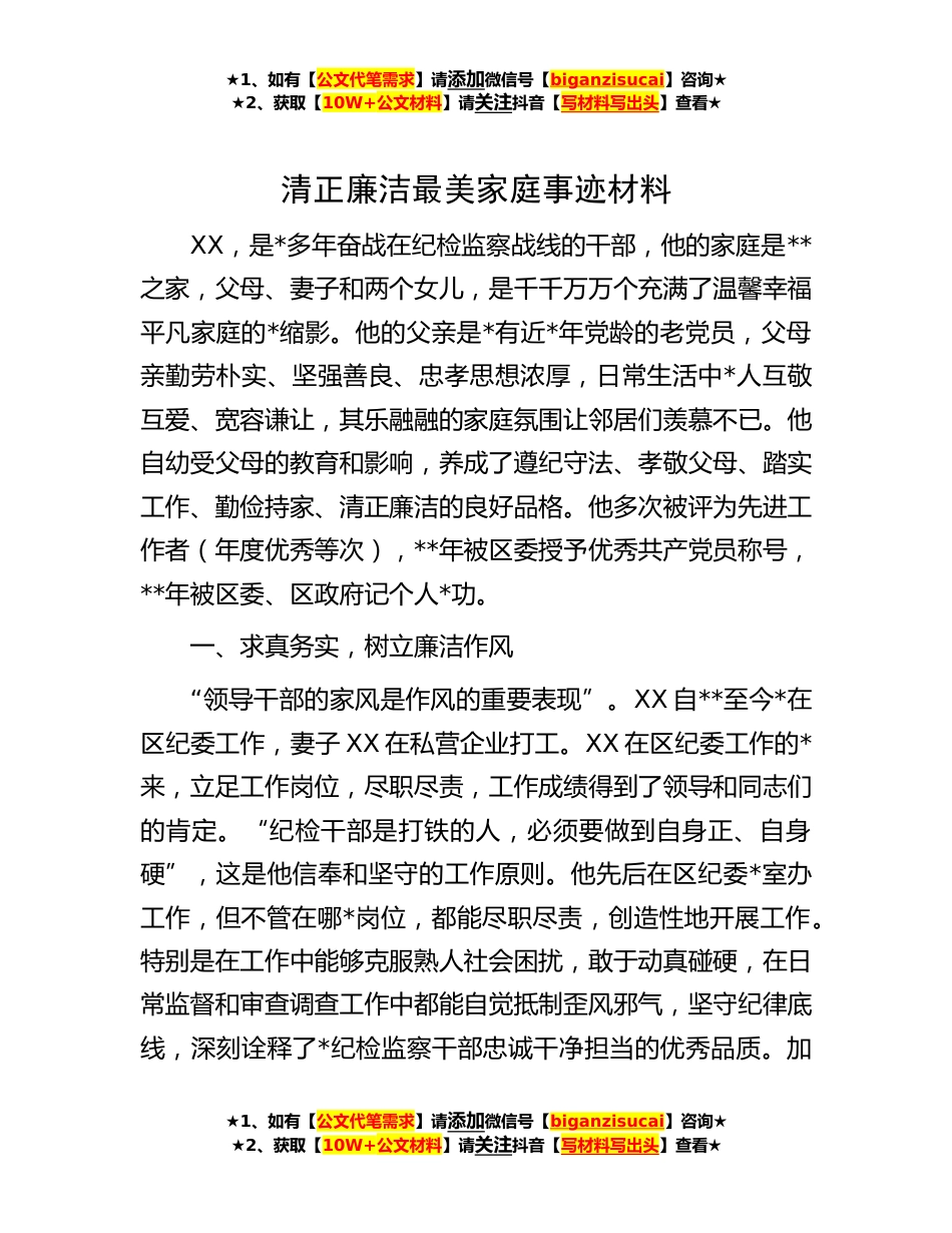 ★1、如有【公文代笔需求】请添加微信号【biganzisucai】咨询★★2、获取【10W+公文材料】请关注抖音【写材料写出头】查看★清正廉洁最美家庭事迹材料XX,是*多年奋战在纪检监察战线的干部,他的家庭是**之家,父母、妻子和两个女儿,是千千万万个充满了温馨幸福平凡家庭的*缩影。他的父亲是*有近*年党龄的老党员,父母亲勤劳朴实、坚强善良、忠孝思想浓厚,日常生活中*人互敬互爱、宽容谦让,其乐融融的家庭氛围让邻居们羡慕不已。他自幼受父母的教育和影响,养成了遵纪守法、孝敬父母、踏实工作、勤俭持家、清正廉洁的良好品格。他多次被评为先进工作者(年度优秀等次),**年被区委授予优秀共产党员称号,**年被区委、区政府记个人*功。一、求真务实,树立廉洁作风“领导干部的家风是作风的重要表现”。XX自**...