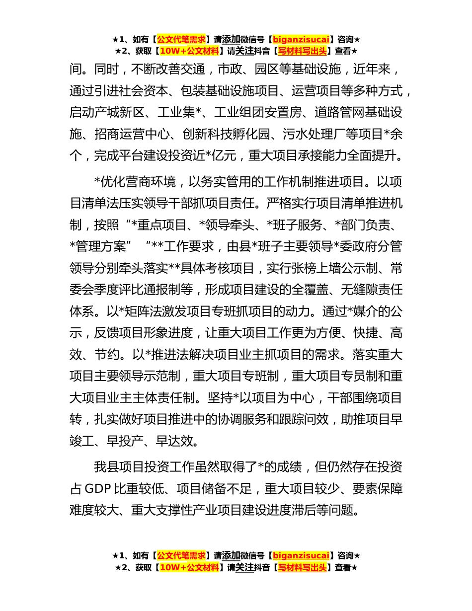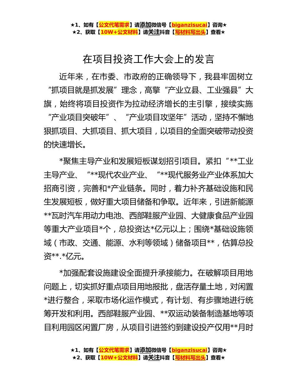 ★1、如有【公文代笔需求】请添加微信号【biganzisucai】咨询★★2、获取【10W+公文材料】请关注抖音【写材料写出头】查看★在项目投资工作大会上的发言近年来,在市委、市政府的正确领导下,我县牢固树立“抓项目就是抓发展”理念,高擎“产业立县、工业强县”大旗,始终将项目投资作为拉动经济增长的主引擎,接续实施“产业项目突破年”、“产业项目攻坚年”活动,坚持不懈地狠抓项目、大抓项目、抓大项目,以项目的全面突破带动投资的快速增长。*聚焦主导产业和发展短板谋划招引项目。紧扣“**工业主导产业、“**现代农业产业、“**现代服务业产业体系加大招商引资,完善和*产业链条。同时,着力补齐基础设施和民生发展短板,做好重大项目储备和争取。近年来,引进新能源**瓦时汽车用动力电池、西部鞋服产业园...