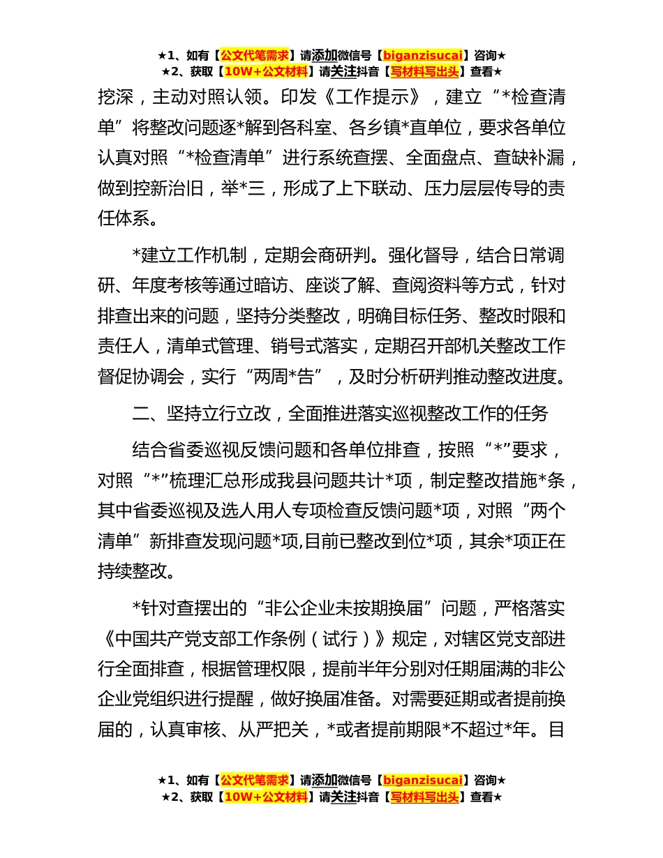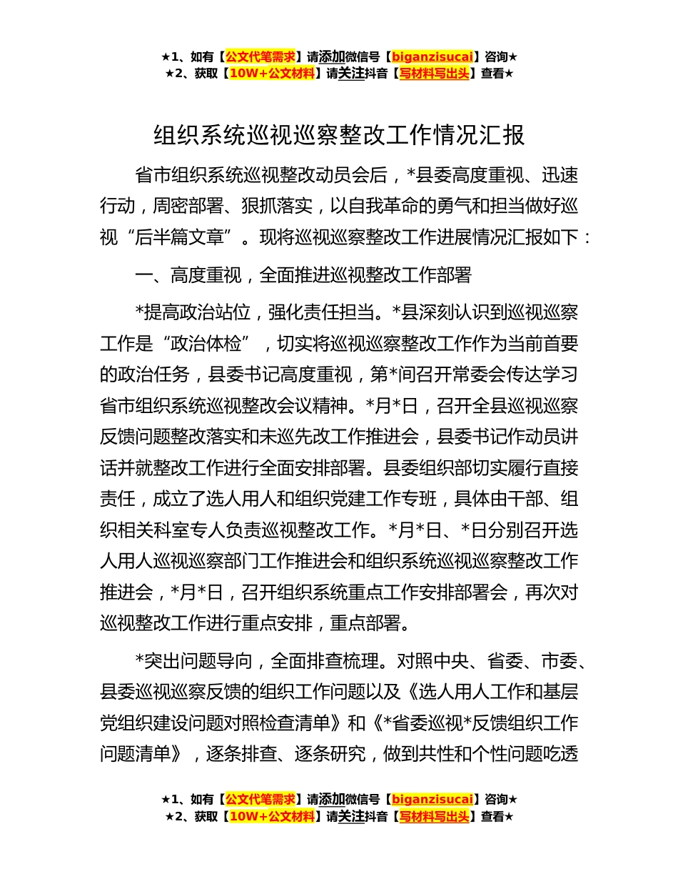★1、如有【公文代笔需求】请添加微信号【biganzisucai】咨询★★2、获取【10W+公文材料】请关注抖音【写材料写出头】查看★组织系统巡视巡察整改工作情况汇报省市组织系统巡视整改动员会后,*县委高度重视、迅速行动,周密部署、狠抓落实,以自我革命的勇气和担当做好巡视“后半篇文章”。现将巡视巡察整改工作进展情况汇报如下:一、高度重视,全面推进巡视整改工作部署*提高政治站位,强化责任担当。*县深刻认识到巡视巡察工作是“政治体检”,切实将巡视巡察整改工作作为当前首要的政治任务,县委书记高度重视,第*间召开常委会传达学习省市组织系统巡视整改会议精神。*月*日,召开全县巡视巡察反馈问题整改落实和未巡先改工作推进会,县委书记作动员讲话并就整改工作进行全面安排部署。县委组织部切实履行直...