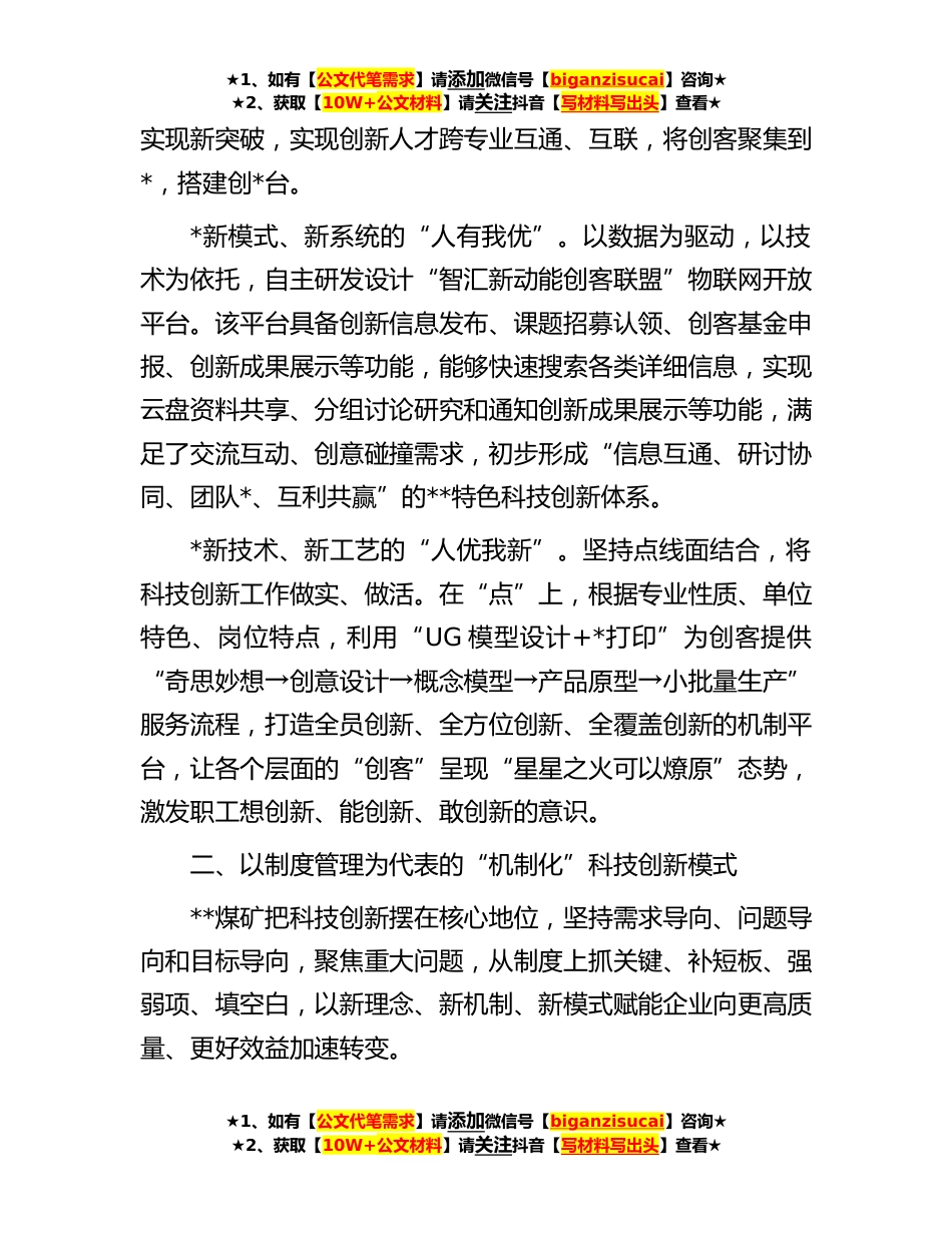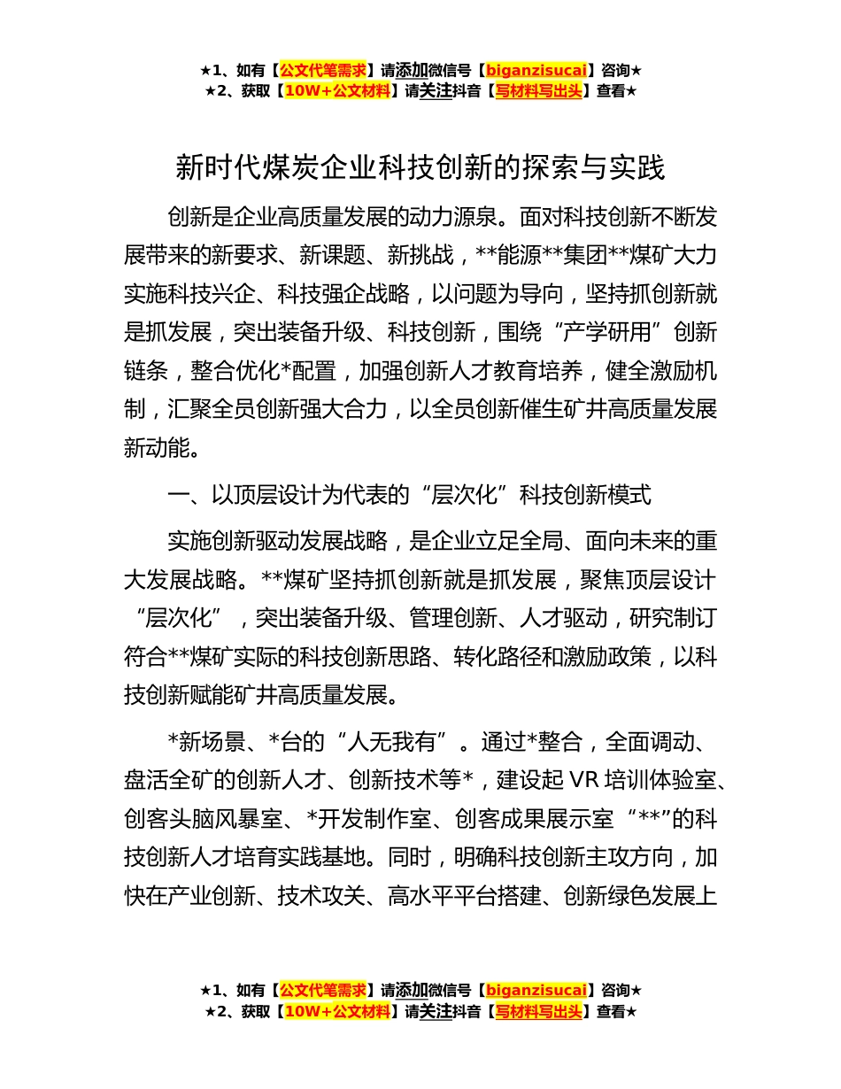 ★1、如有【公文代笔需求】请添加微信号【biganzisucai】咨询★★2、获取【10W+公文材料】请关注抖音【写材料写出头】查看★新时代煤炭企业科技创新的探索与实践创新是企业高质量发展的动力源泉。面对科技创新不断发展带来的新要求、新课题、新挑战,**能源**集团**煤矿大力实施科技兴企、科技强企战略,以问题为导向,坚持抓创新就是抓发展,突出装备升级、科技创新,围绕“产学研用”创新链条,整合优化*配置,加强创新人才教育培养,健全激励机制,汇聚全员创新强大合力,以全员创新催生矿井高质量发展新动能。一、以顶层设计为代表的“层次化”科技创新模式实施创新驱动发展战略,是企业立足全局、面向未来的重大发展战略。**煤矿坚持抓创新就是抓发展,聚焦顶层设计“层次化”,突出装备升级、管理创新、人才...